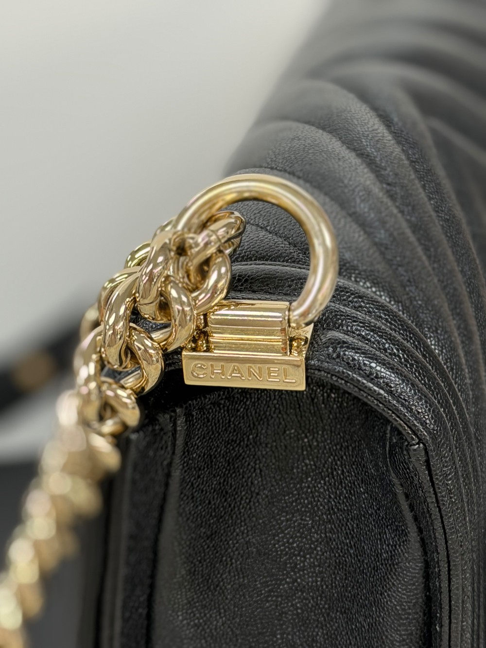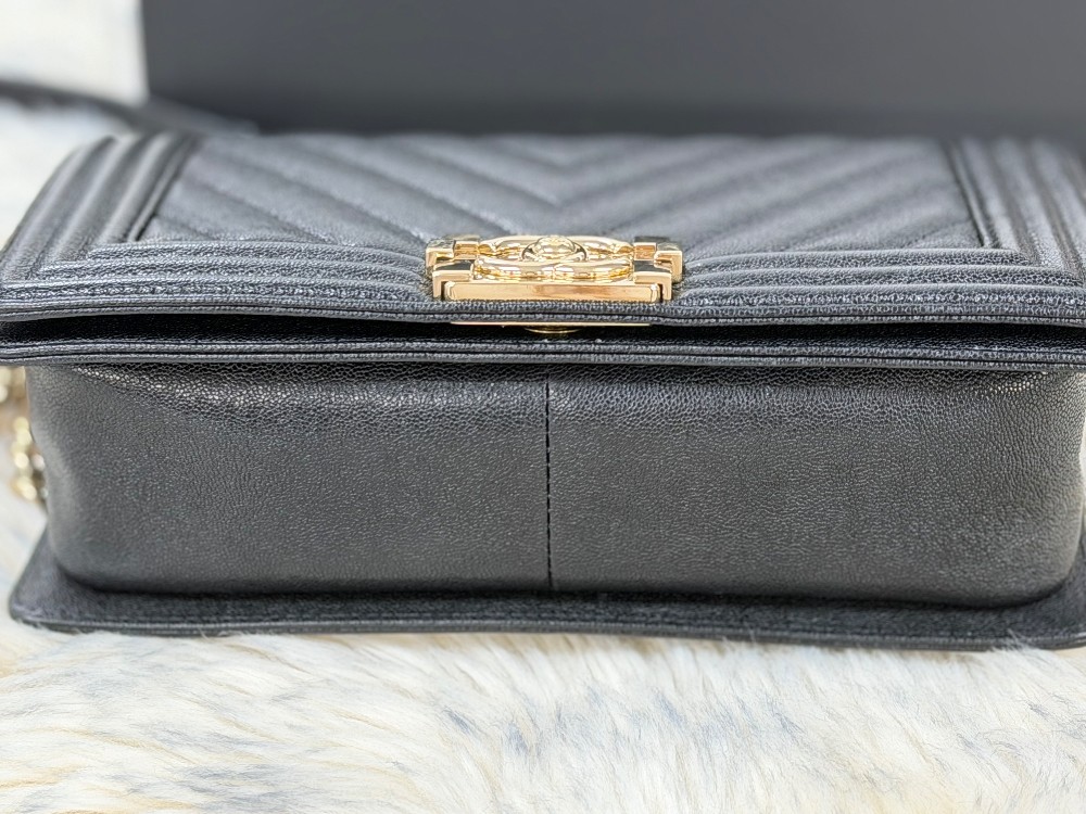This is an authentic CHANEL Caviar Chevron Quilted Medium Boy Flap in Black. This shoulder bag is crafted of black chevron quilted caviar leather and gold hardware. The flap opens to a black fabric interior.