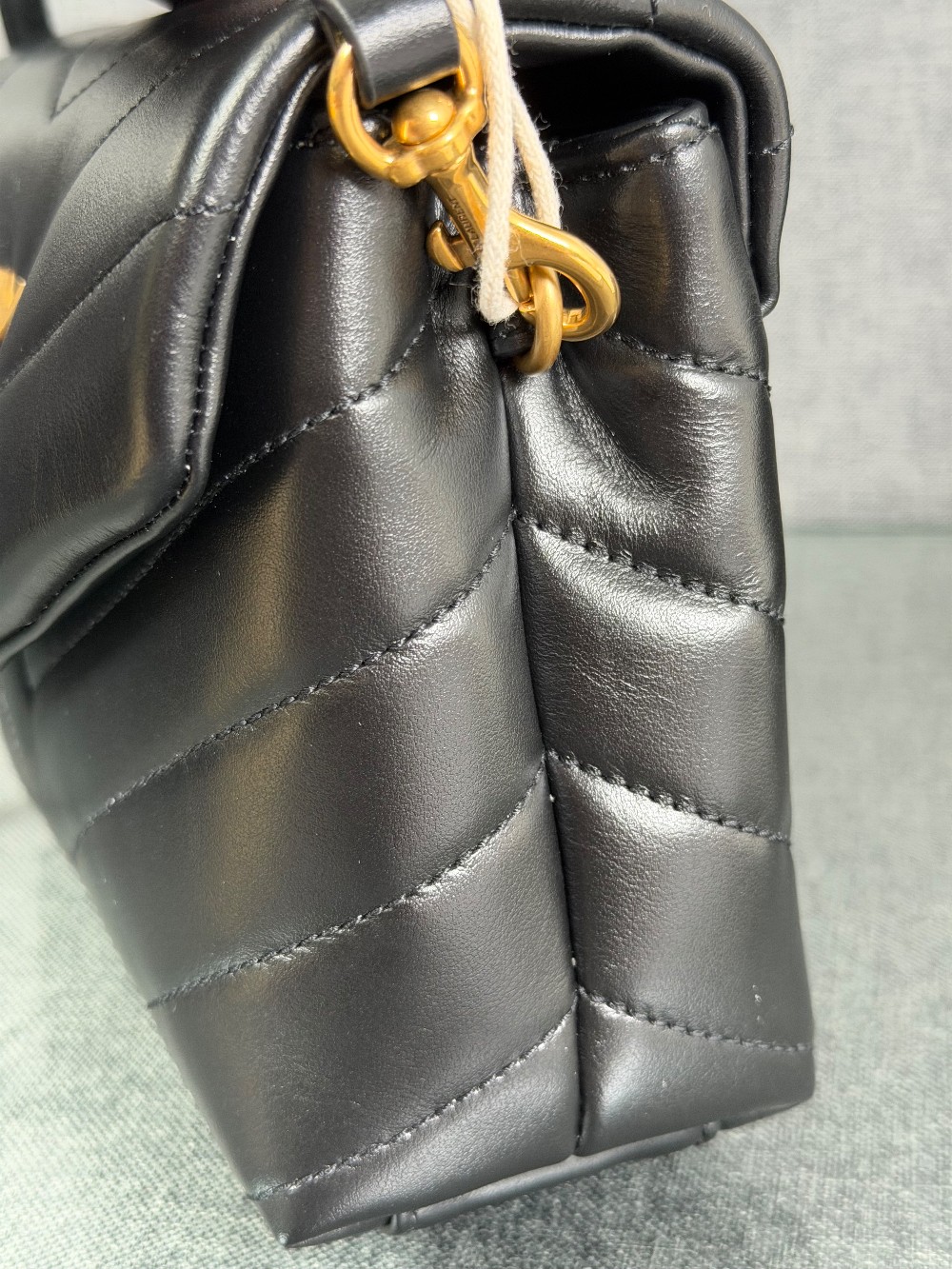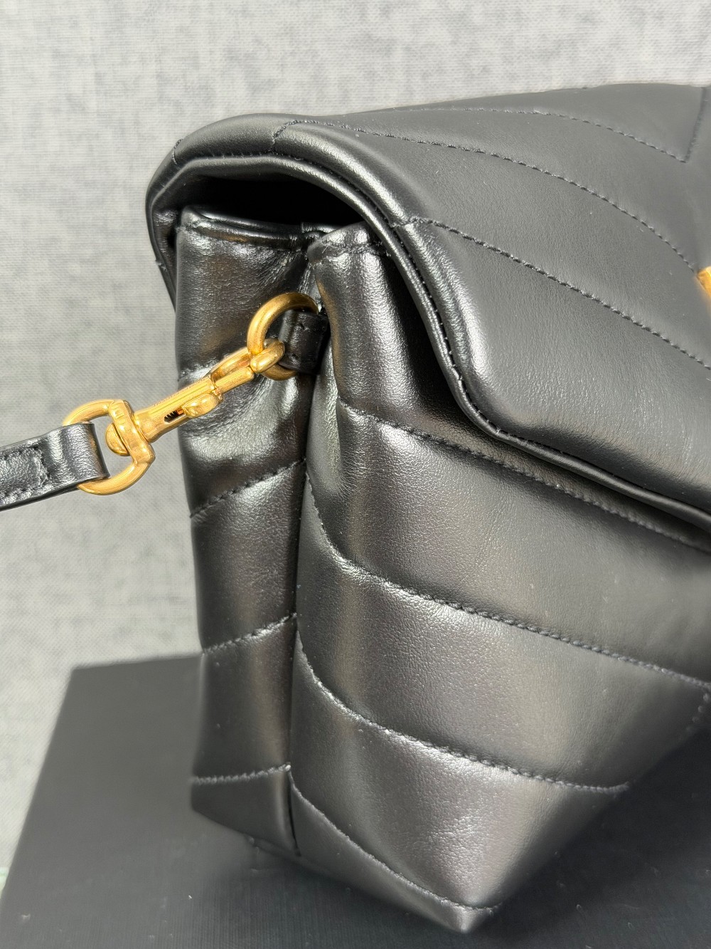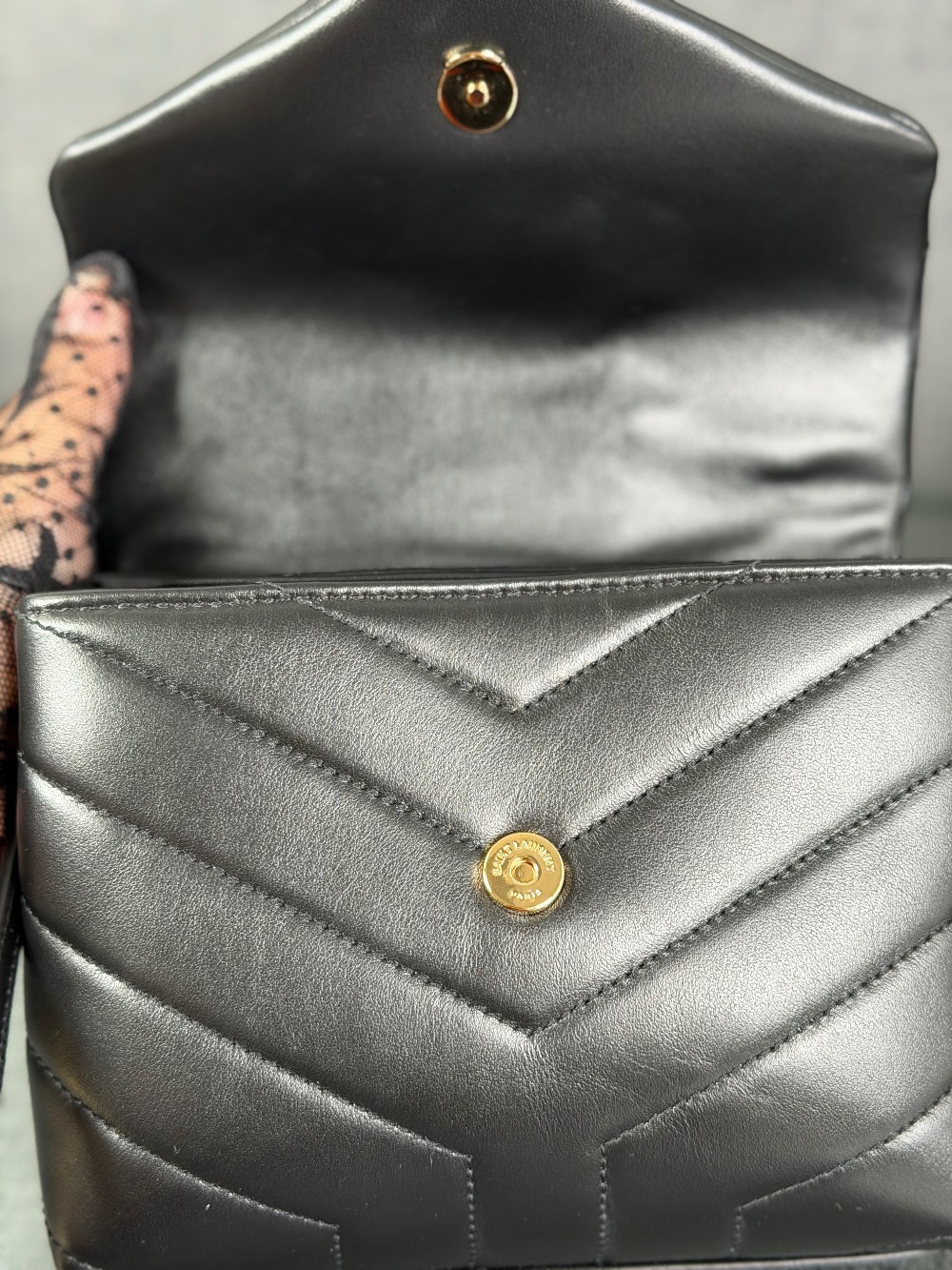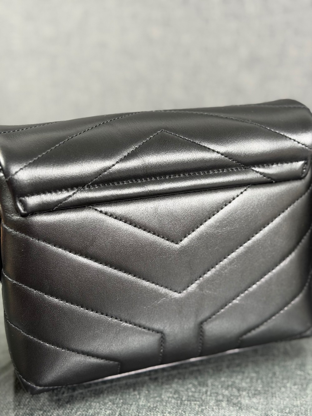 This is an authentic SAINT LAURENT Calfskin Y Quilted Monogram Toy Loulou Crossbody Bag in Earth. This chic shoulder bag is crafted of smooth quilted calfskin leather in grey. The shoulder bag features a crossbody strap and aged gold hardware. The flap opens to a partitioned black fabric interior with card slots, and zipper and patch pockets.