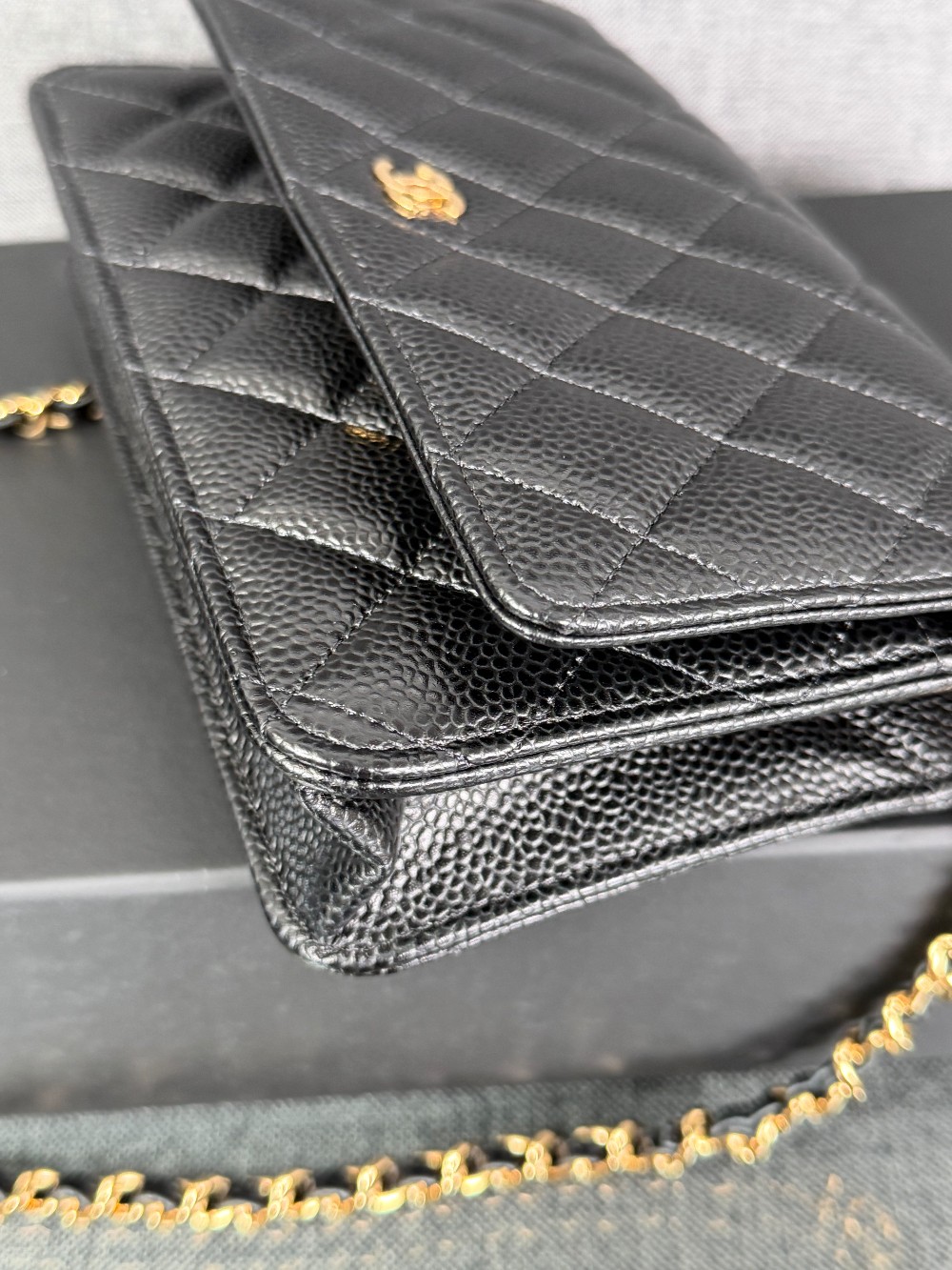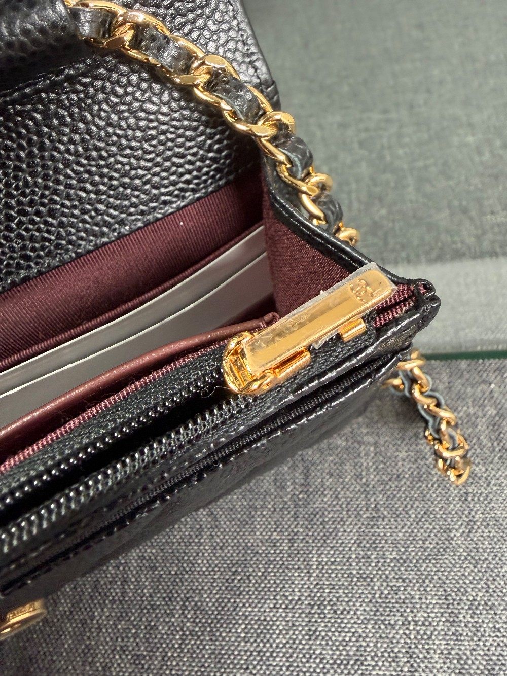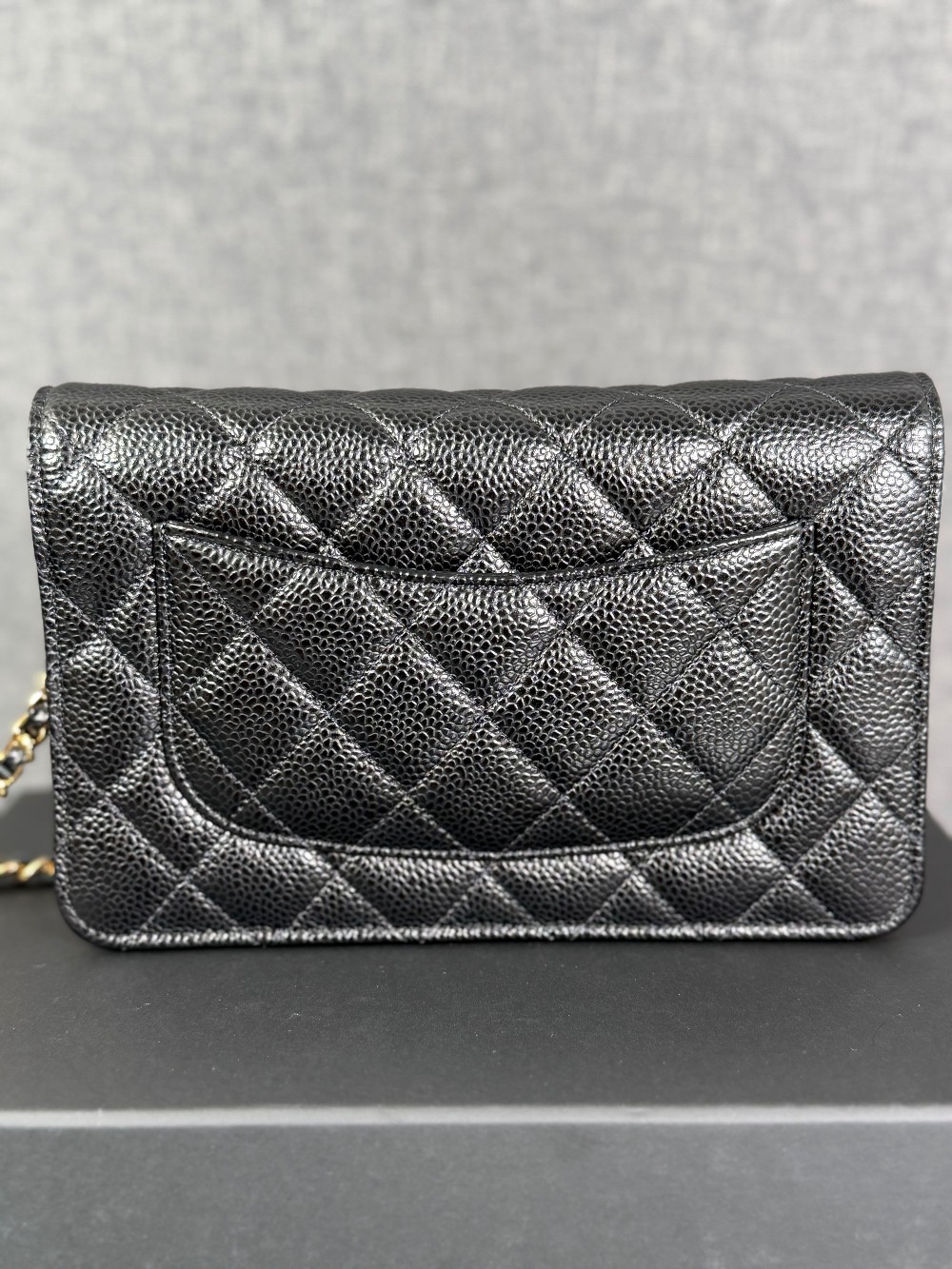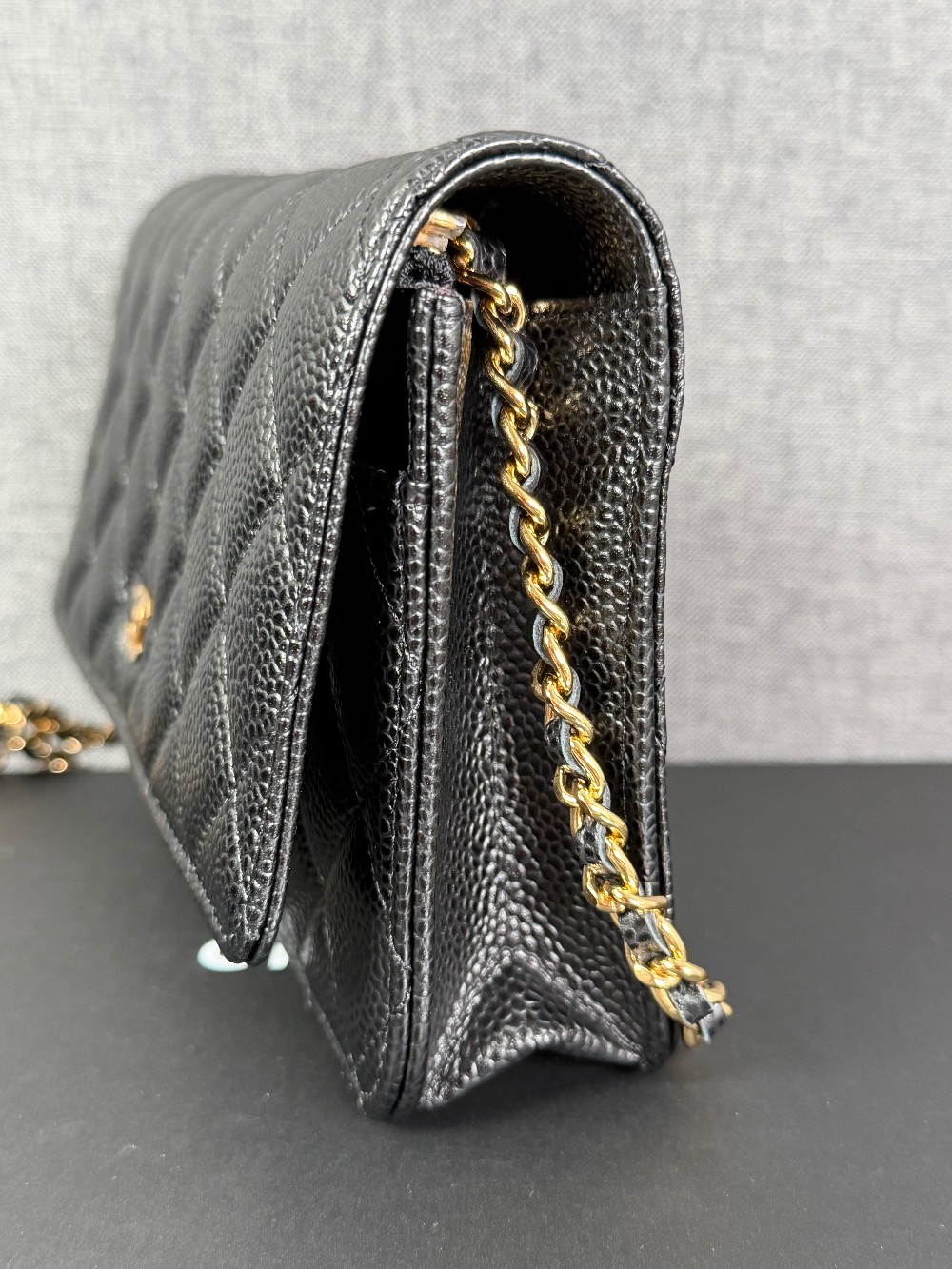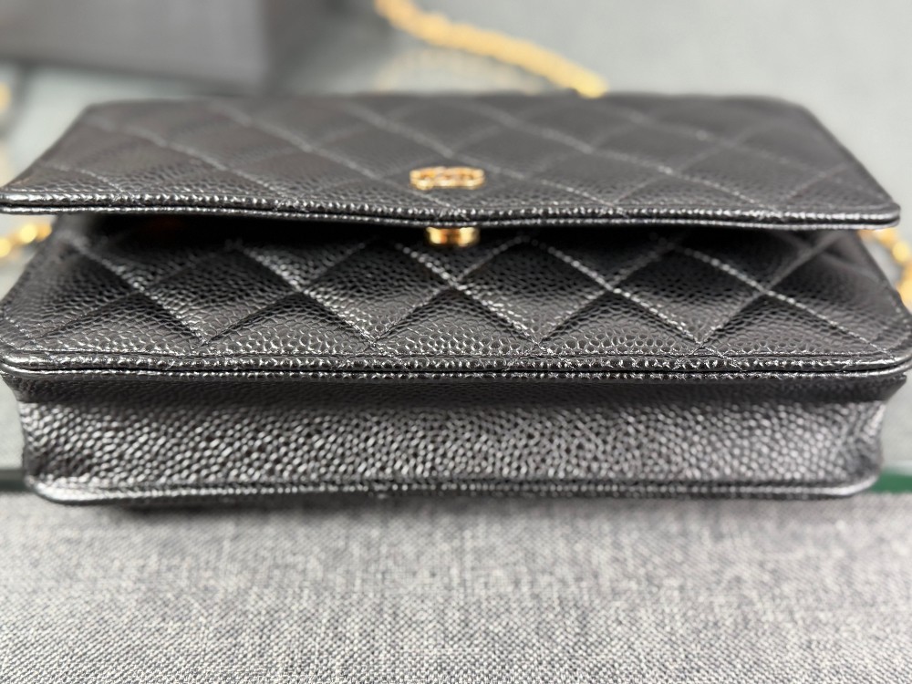 This is an authentic CHANEL Caviar Quilted Wallet On Chain WOC in Black. This stylish wallet is crafted of luxuriously textured diamond quilted caviar leather in black. This shoulder bag features a gold chain-link crossbody strap and a Chanel CC logo on the facing flap. The bag opens to a burgundy fabric interior with a zipper compartment, card slots, and a leather patch pocket.