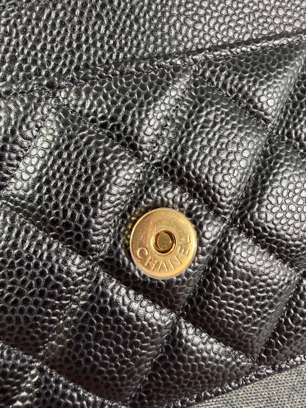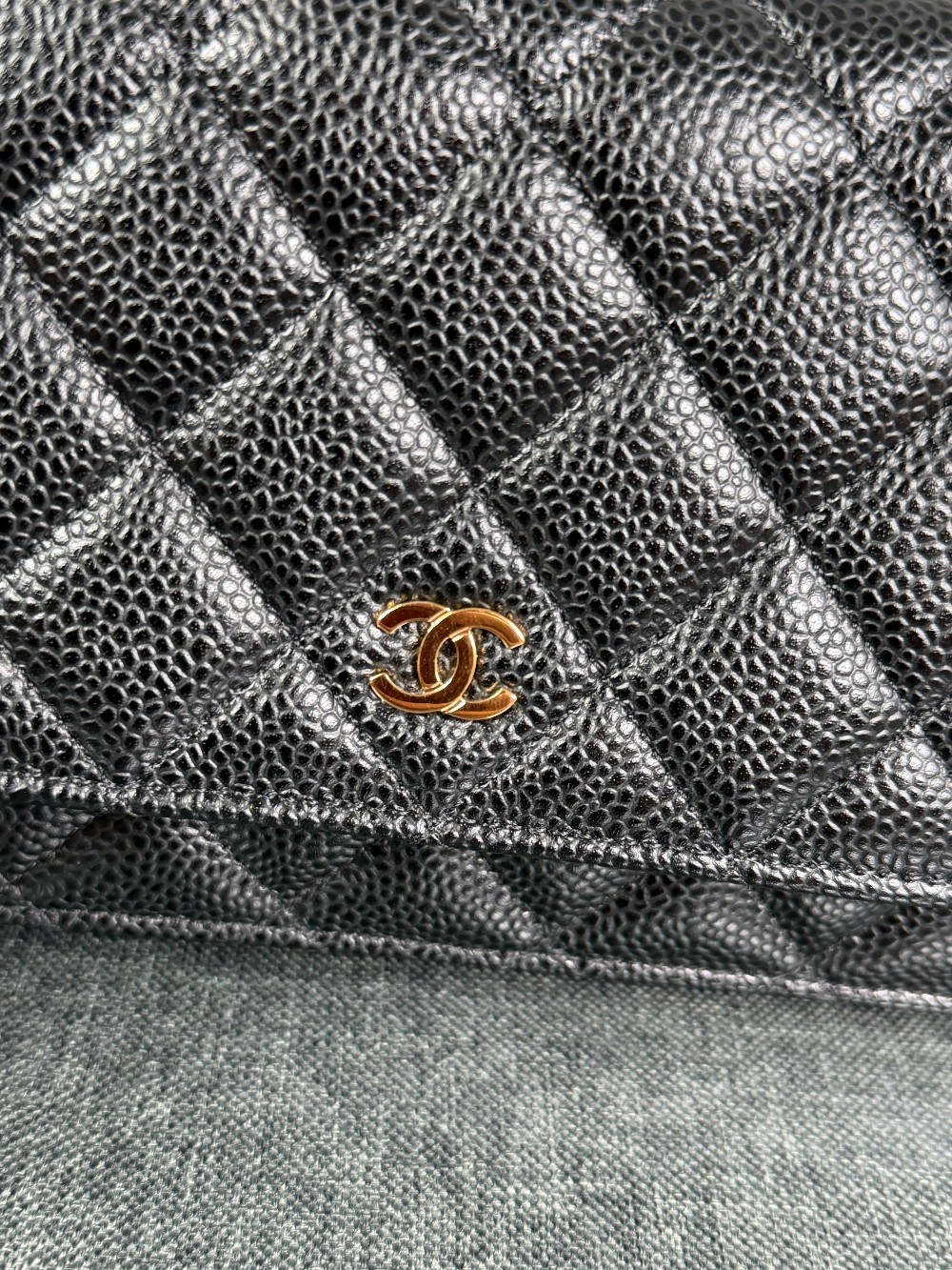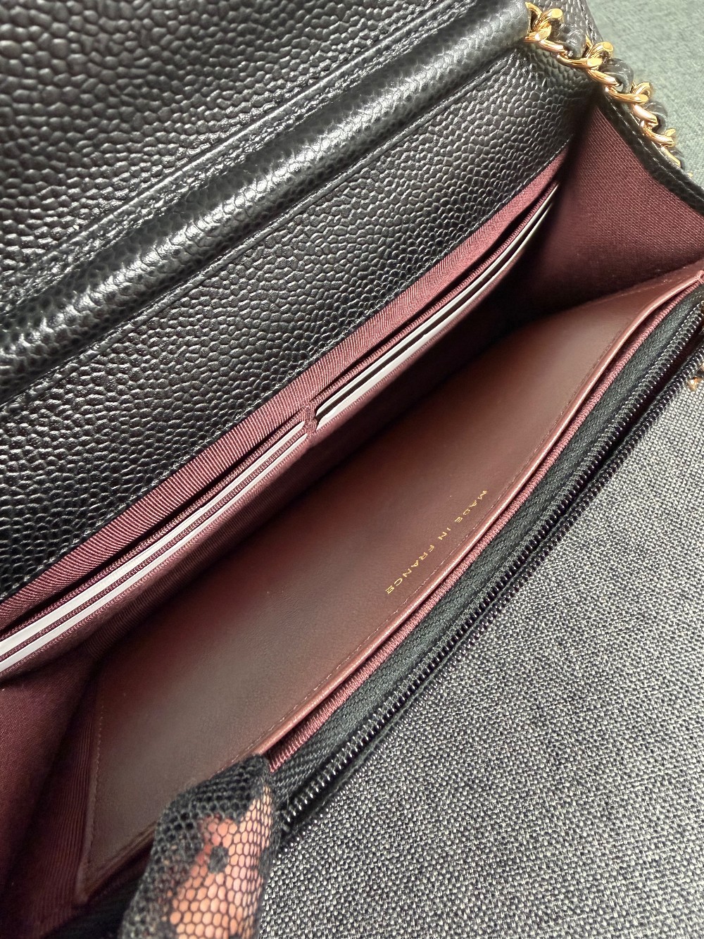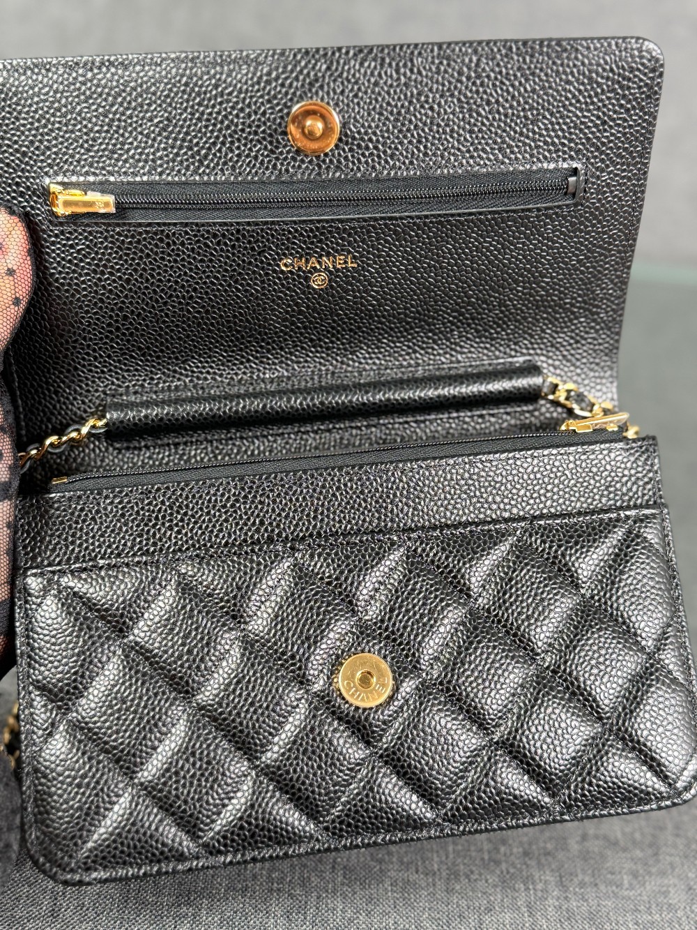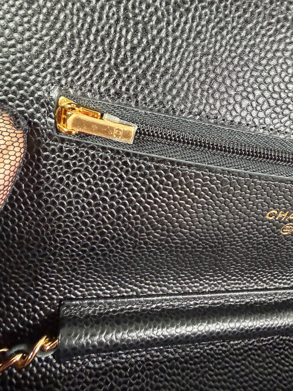 This is an authentic CHANEL Caviar Quilted Wallet On Chain WOC in Black. This stylish wallet is crafted of luxuriously textured diamond quilted caviar leather in black. This shoulder bag features a gold chain-link crossbody strap and a Chanel CC logo on the facing flap. The bag opens to a burgundy fabric interior with a zipper compartment, card slots, and a leather patch pocket.