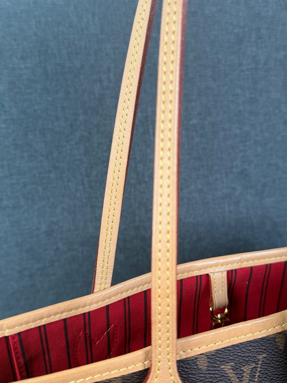 This is an authentic LOUIS VUITTON Monogram Neo Neverfull MM in Cherry. This stylish tote is crafted of a classic Louis Vuitton monogram-coated canvas. This shoulder bag features vachetta cowhide leather shoulder handles, trim, and side cinch cords with polished brass hardware. The wide top is open to a red striped fabric interior with a hanging zipper pocket.