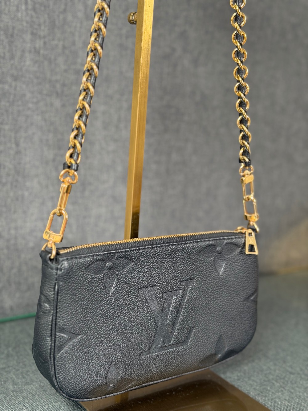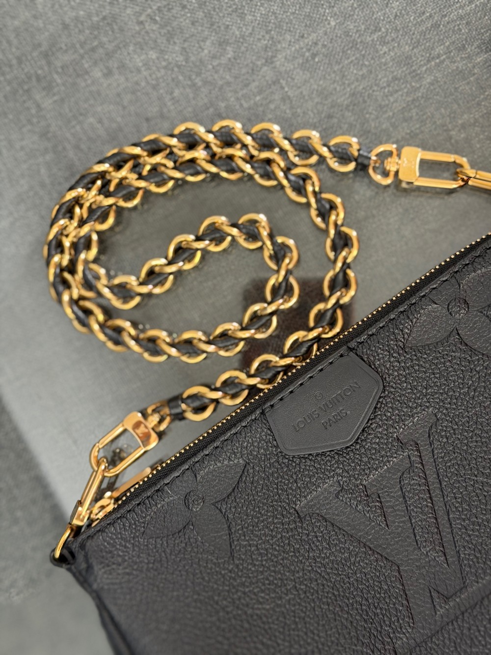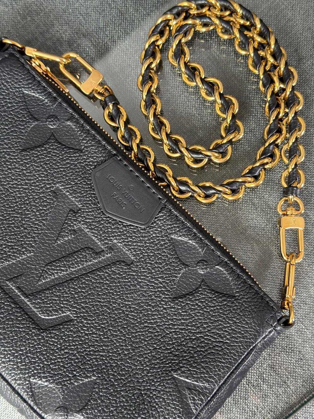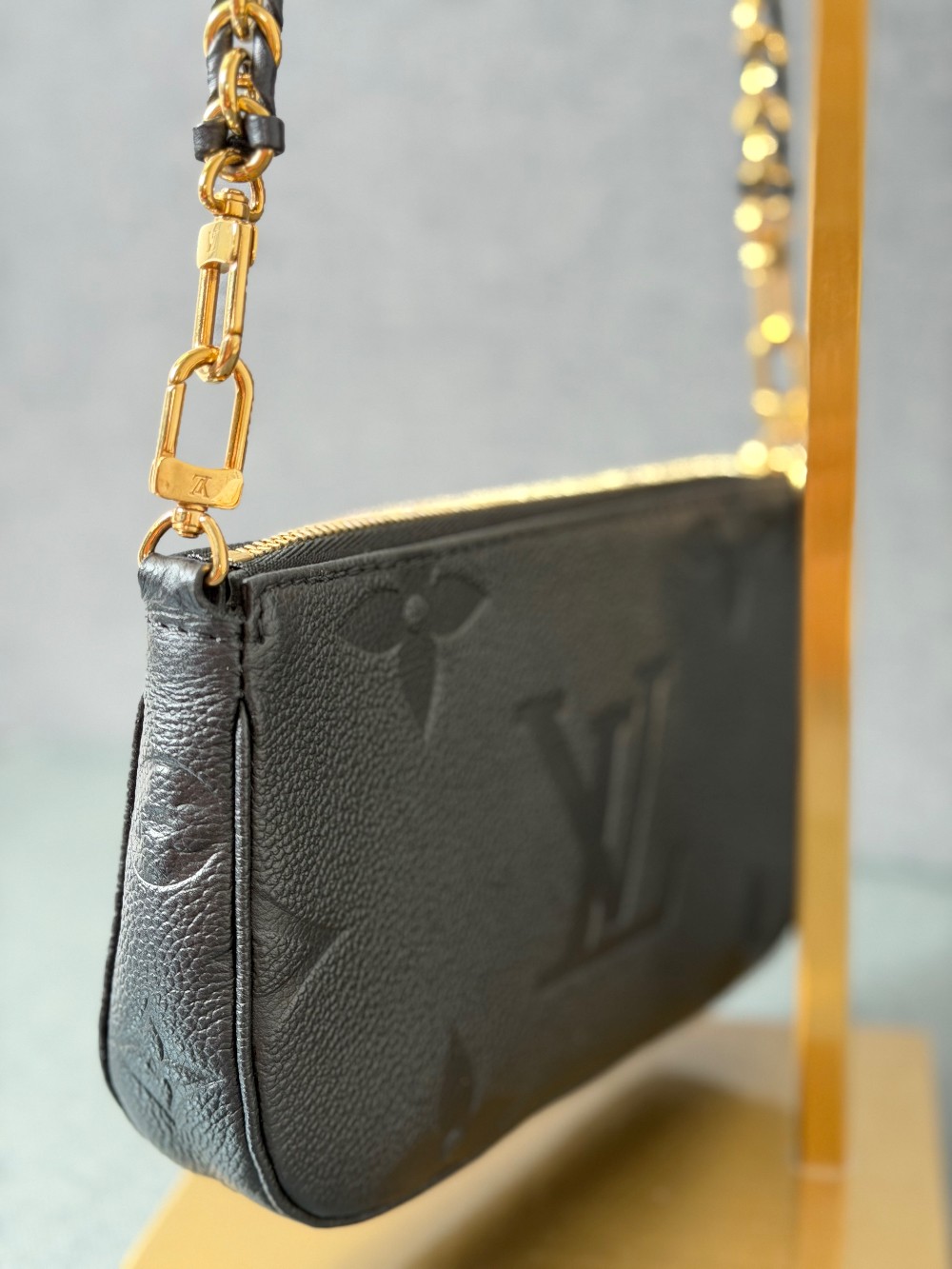 This is an authentic LOUIS VUITTON Empreinte Monogram Giant Multi Pochette Accessories in Black. This pochette is crafted of Louis Vuitton Empreinte monogram in black. It features a removable adjustable black/gold chain shoulder strap and a gold top zipper that opens to a black microfiber interior.