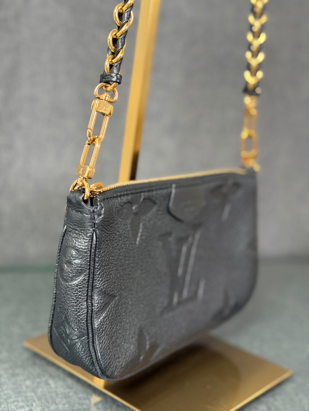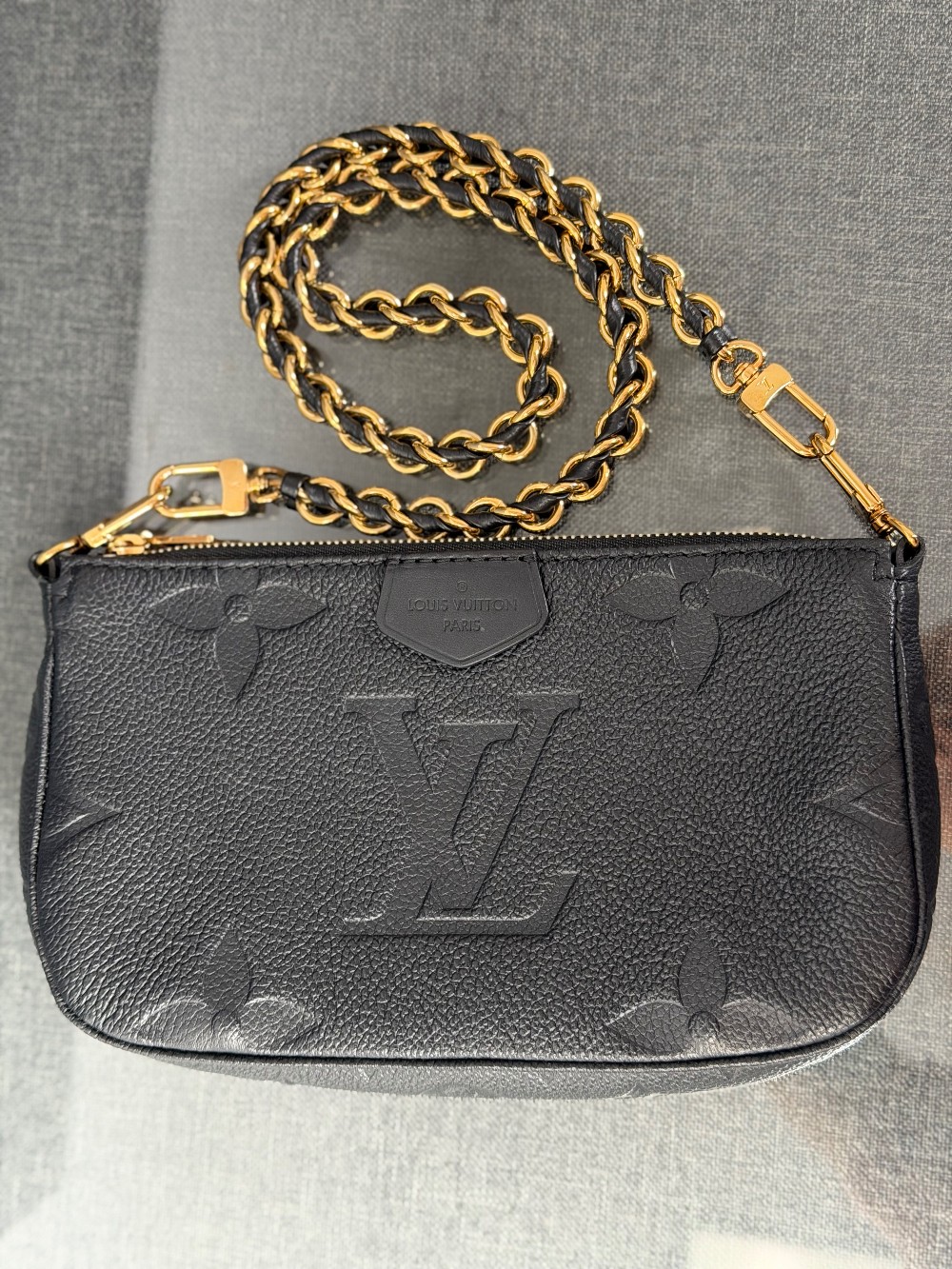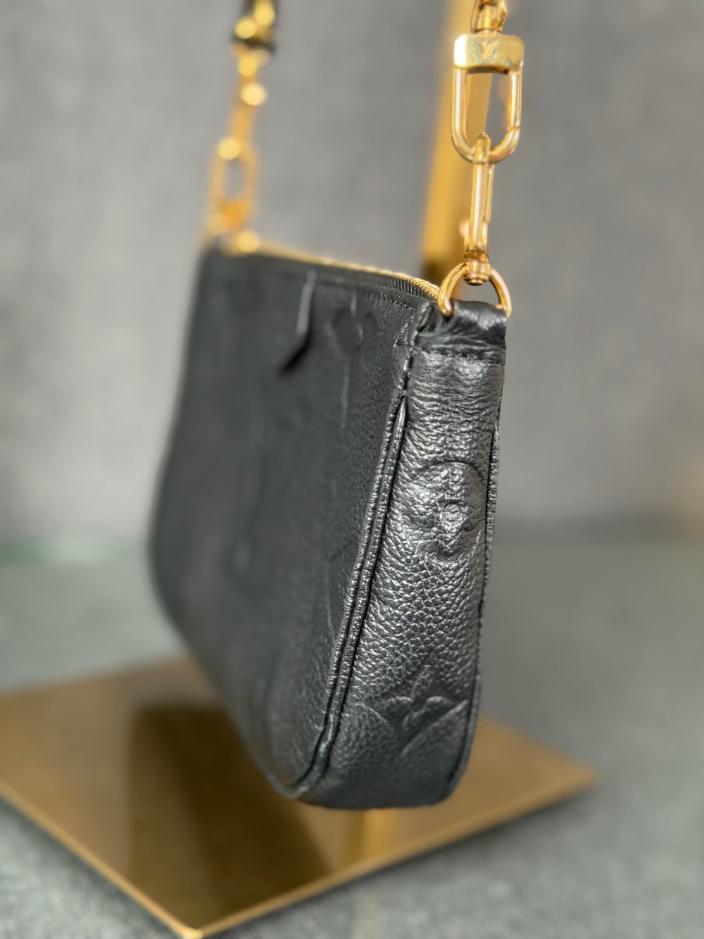 This is an authentic LOUIS VUITTON Empreinte Monogram Giant Multi Pochette Accessories in Black. This pochette is crafted of Louis Vuitton Empreinte monogram in black. It features a removable adjustable black/gold chain shoulder strap and a gold top zipper that opens to a black microfiber interior.