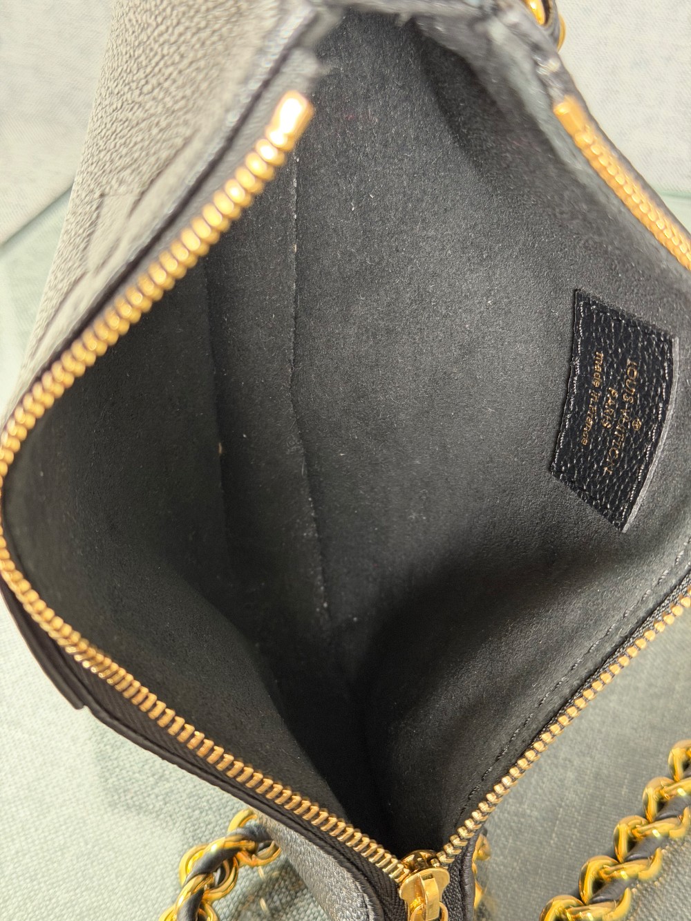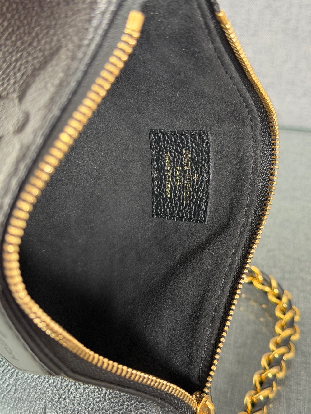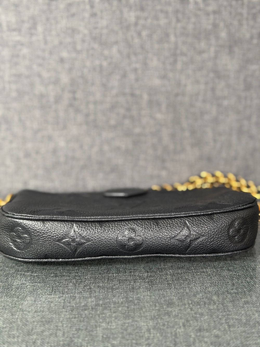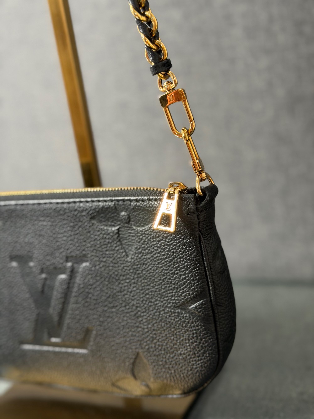 This is an authentic LOUIS VUITTON Empreinte Monogram Giant Multi Pochette Accessories in Black. This pochette is crafted of Louis Vuitton Empreinte monogram in black. It features a removable adjustable black/gold chain shoulder strap and a gold top zipper that opens to a black microfiber interior.