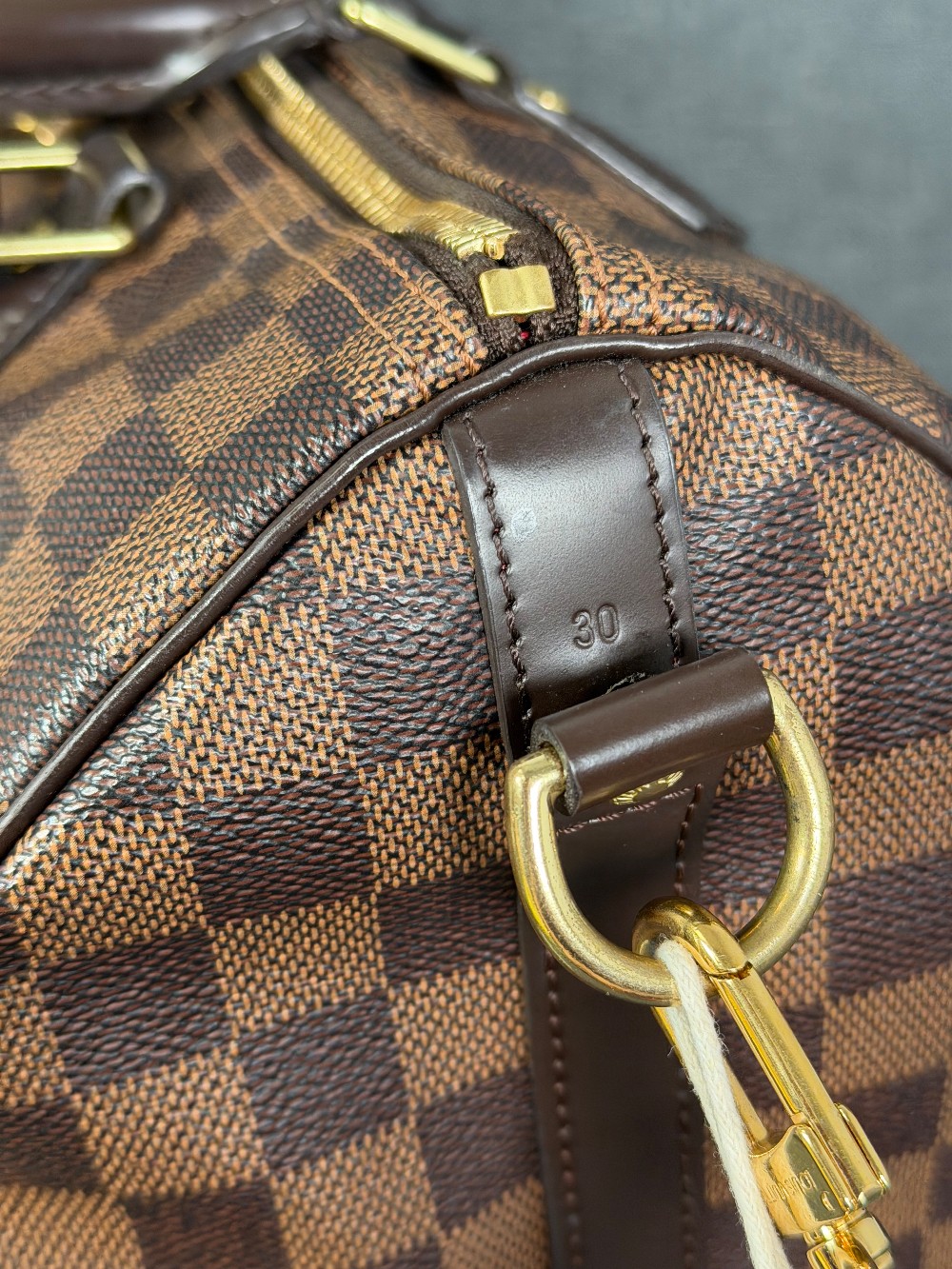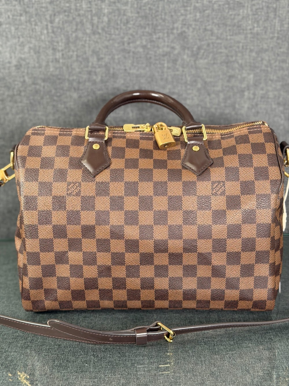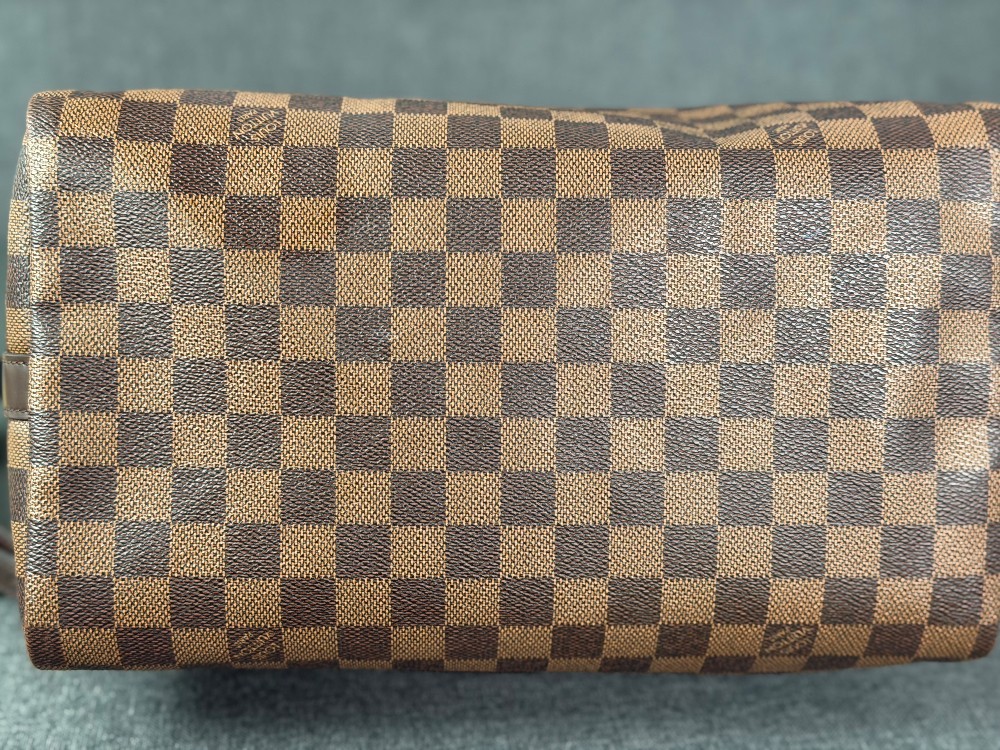 This is an authentic LOUIS VUITTON Damier Ebene Speedy Bandouliere 30. This timeless handbag is crafted of Louis Vuitton's signature Damier coated canvas in brown. The handbag features dark brown rolled leather top handles, adjustable shoulder strap, matching trim, and gold hardware. The top zippers open to a rouge red fabric interior with a hanging pocket.