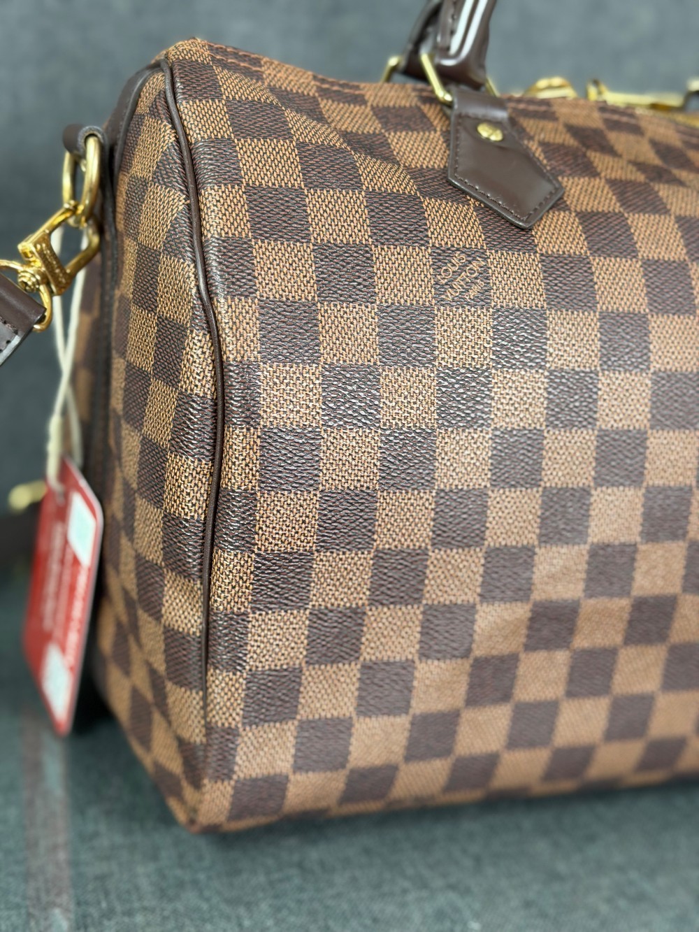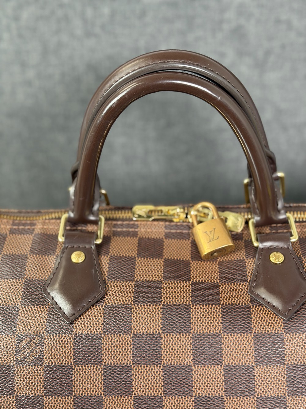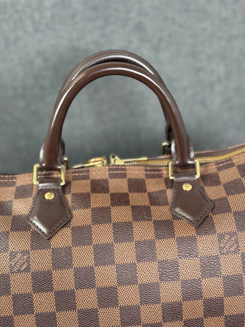 This is an authentic LOUIS VUITTON Damier Ebene Speedy Bandouliere 30. This timeless handbag is crafted of Louis Vuitton's signature Damier coated canvas in brown. The handbag features dark brown rolled leather top handles, adjustable shoulder strap, matching trim, and gold hardware. The top zippers open to a rouge red fabric interior with a hanging pocket.