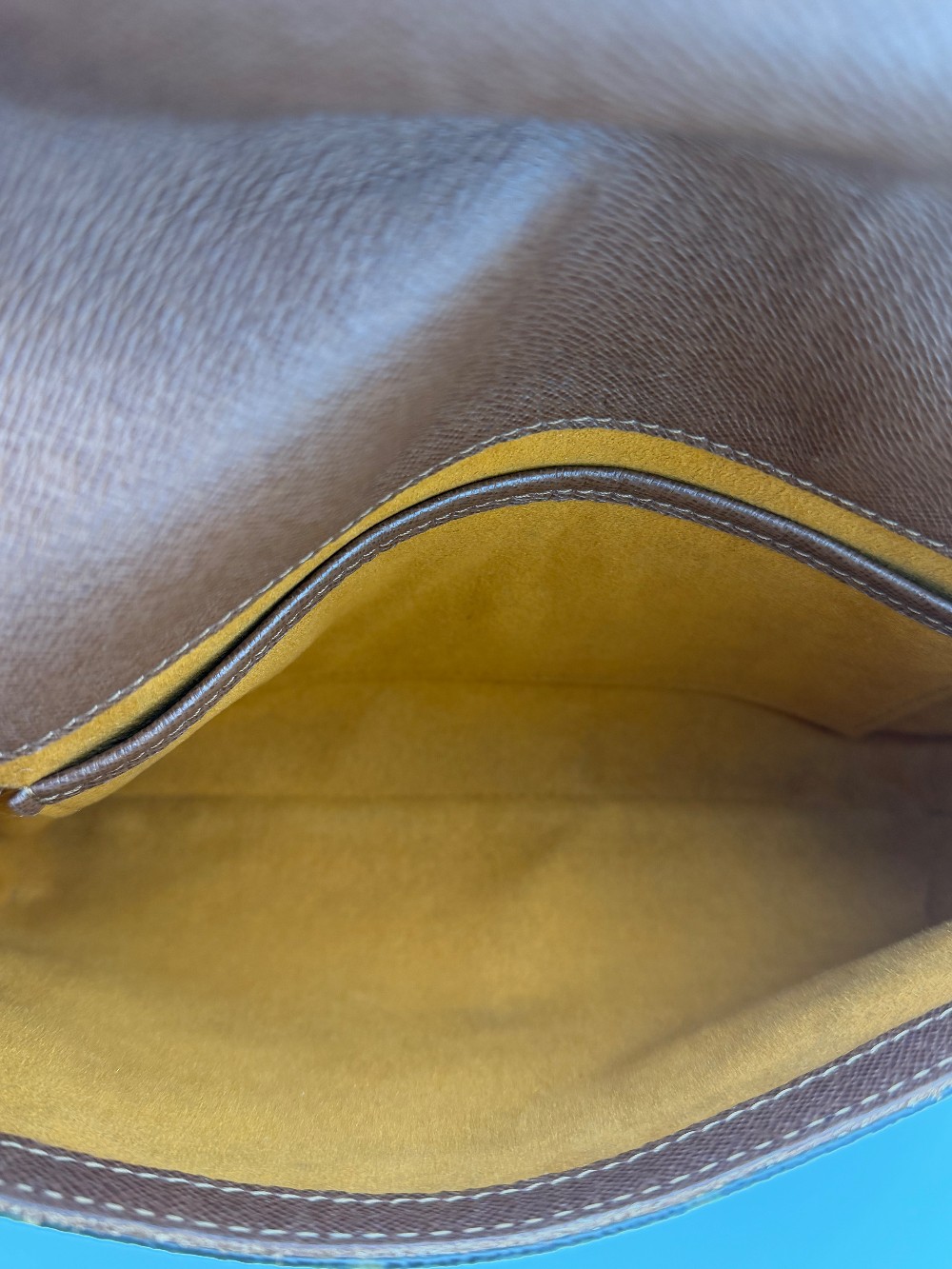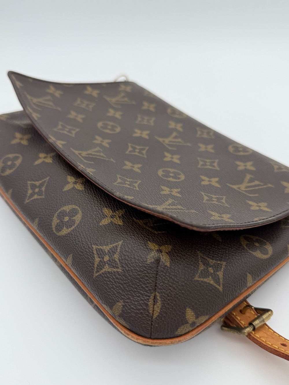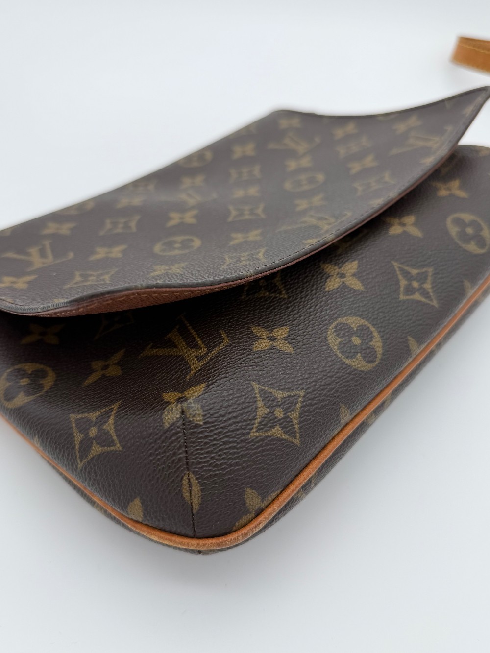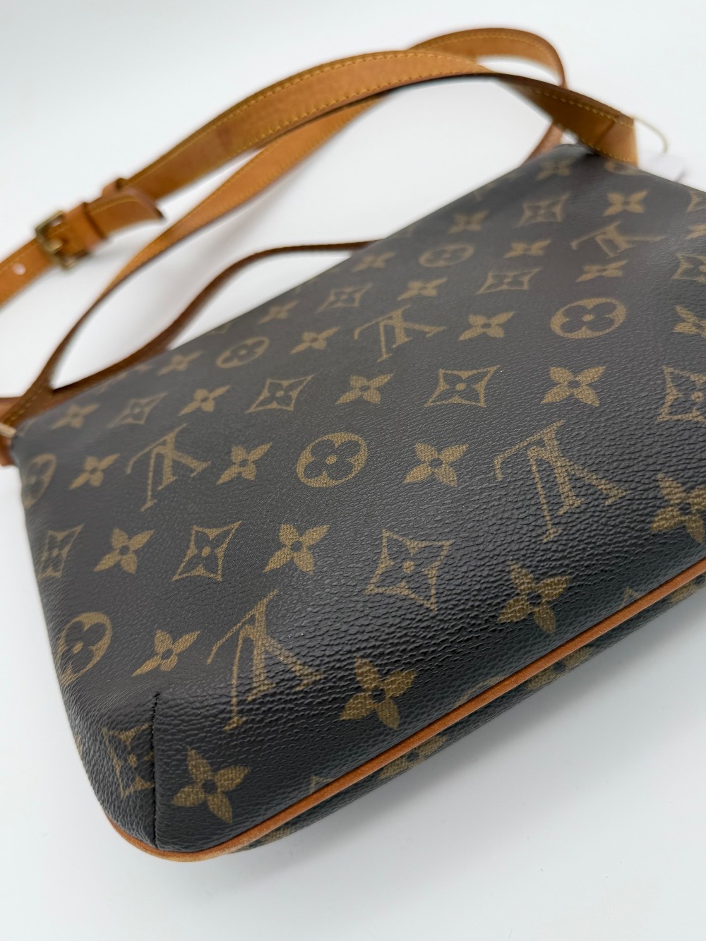 This is an authentic LOUIS VUITTON Monogram Musette in Tango. This chic shoulder bag is finely crafted of Louis Vuitton monogram on coated canvas. The bag features a vachetta cowhide leather shoulder strap with polished brass hardware and a frontal flap. This flap opens to a saffron alcantara microfiber interior with a patch pocket.