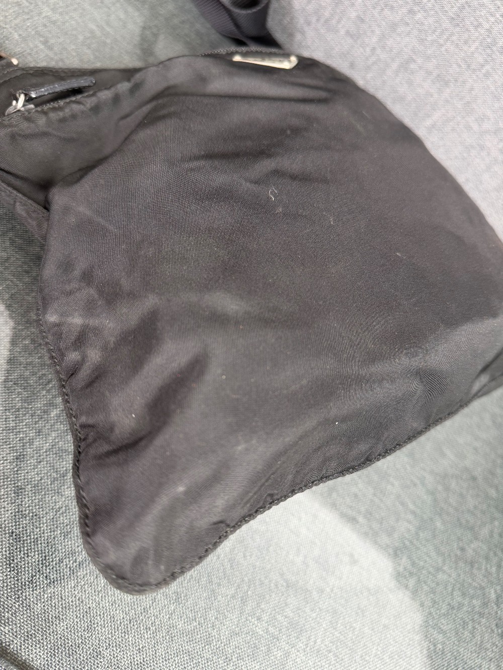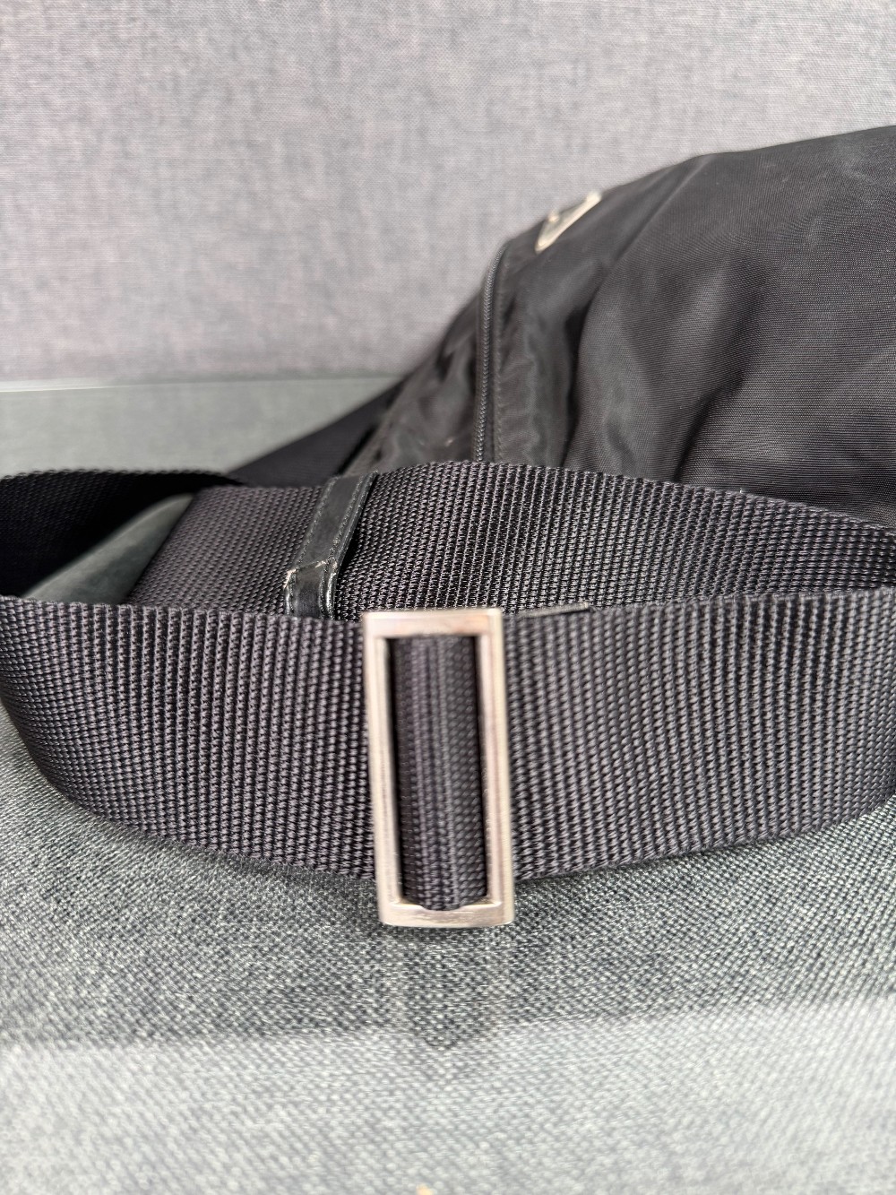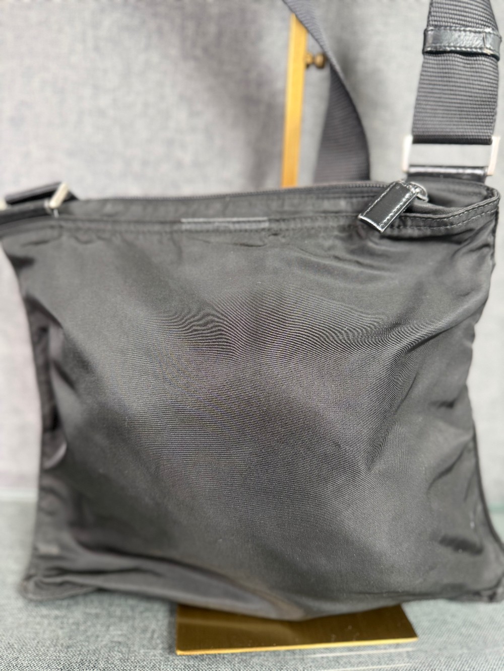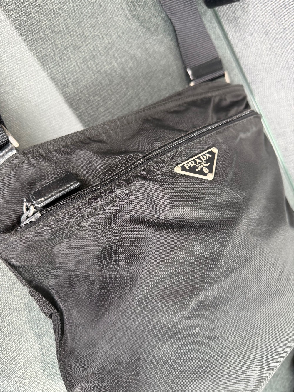 This is an authentic black PRADA nylon shoulder bag. Crafted from durable, lightweight, and water-resistant nylon fabric, which is a signature of the Prada brand. It features a flat, messenger-style design with a main compartment and a front zipper pocket. The iconic enameled metal triangle logo is prominently displayed on the front pocket. It has a long, adjustable woven shoulder strap, allowing it to be worn as a shoulder bag or crossbody bag.