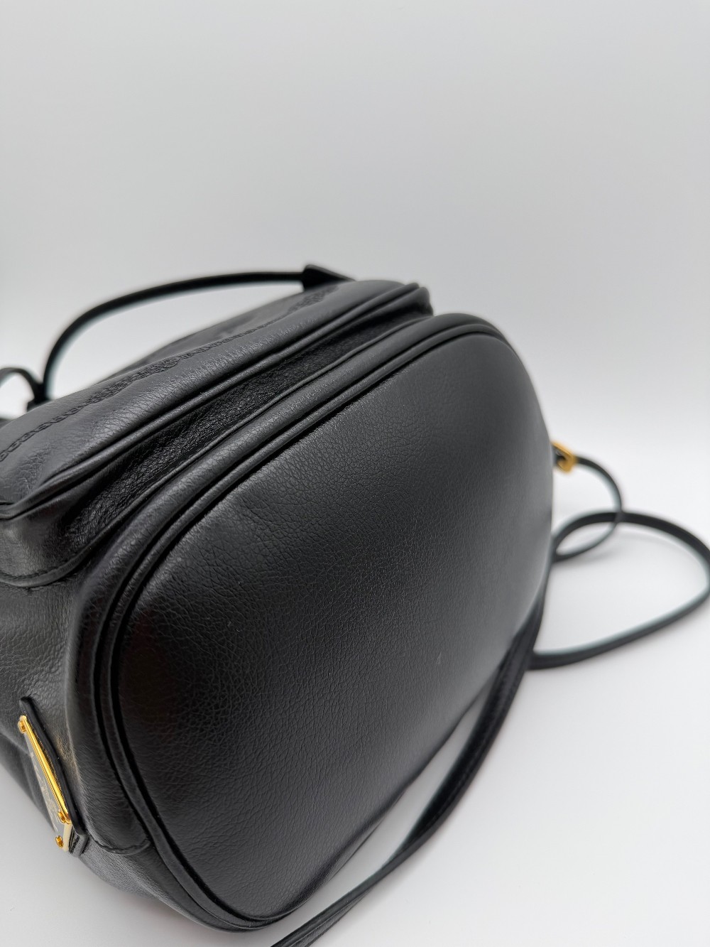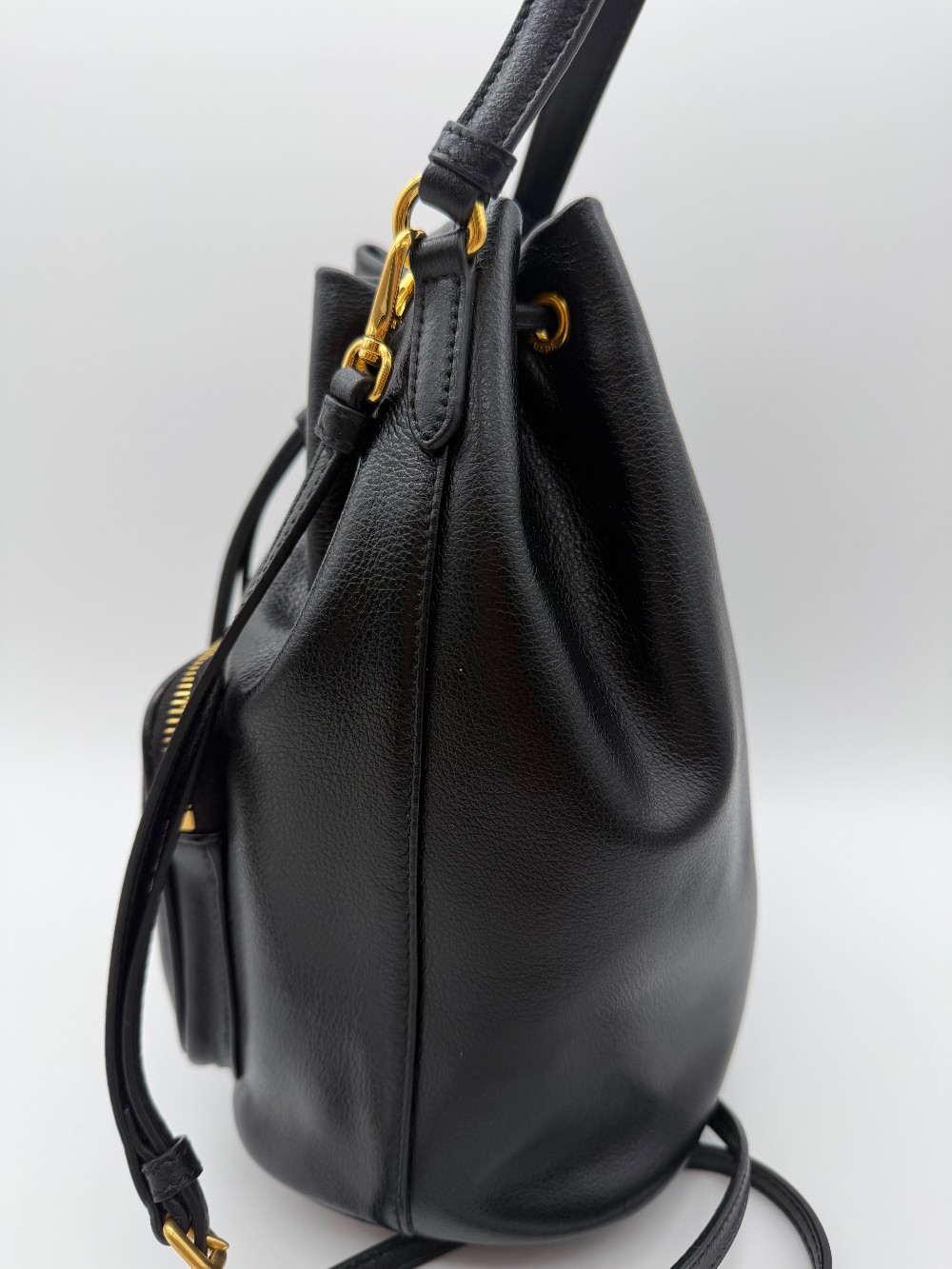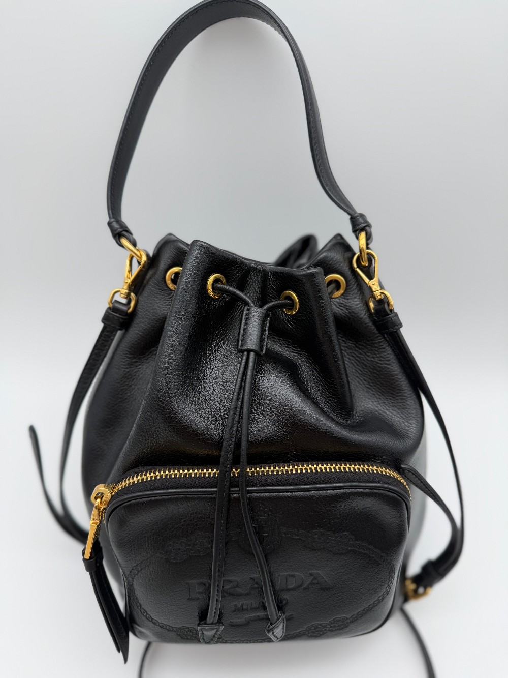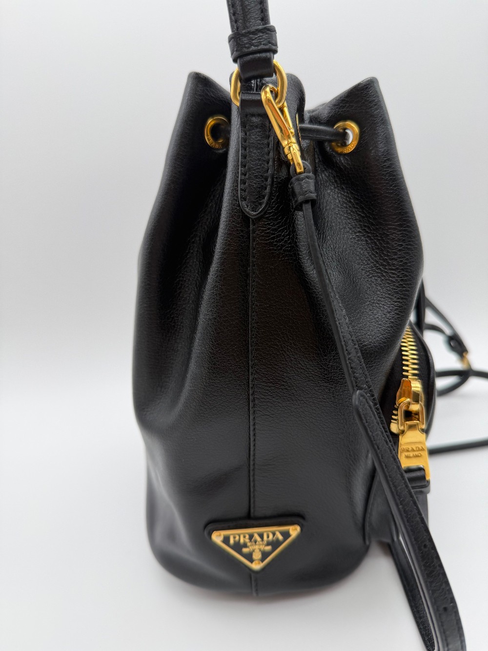 This is an authentic PRADA Mini Bucket Crossbody Bag in Black. This stylish bag is crafted of leather in black and features a facing zipper pocket, a top cinch strap and polished brass buckles and links. The top opens to a Prada jacquard fabric.