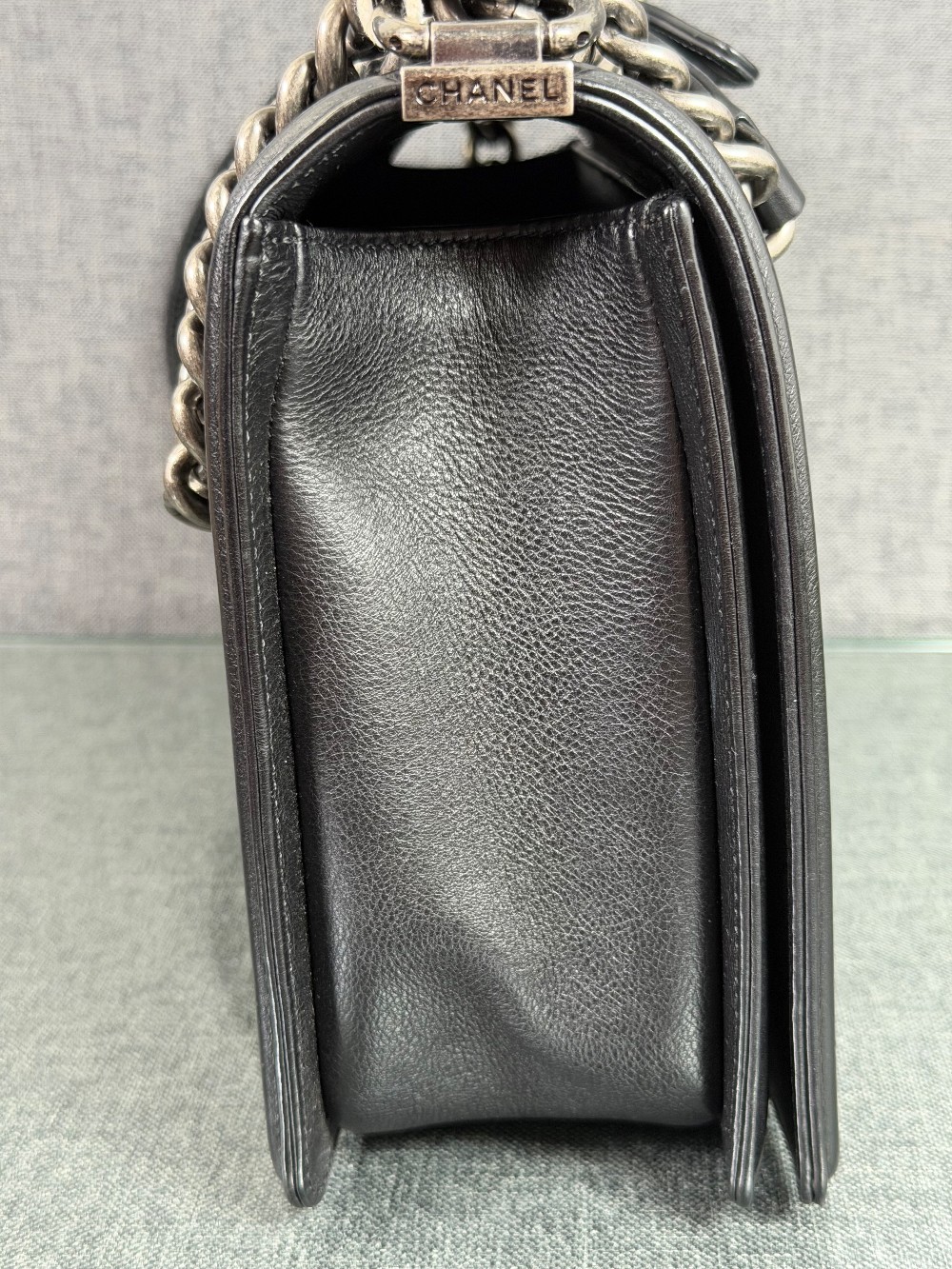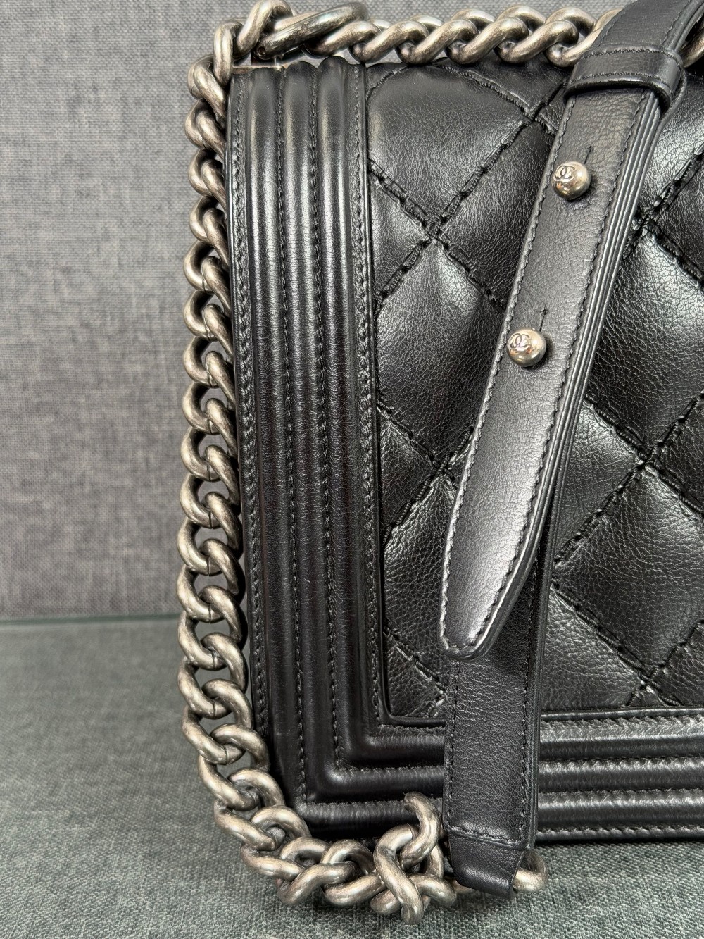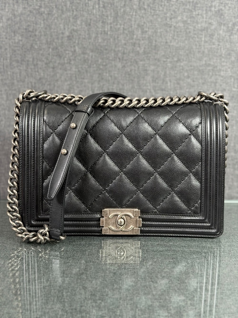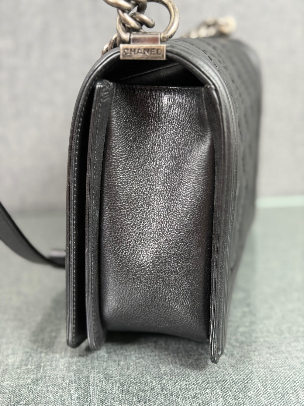 This is an authentic CHANEL Calfskin Embossed Stitch Large Boy Flap in Black. This chic shoulder bag is crafted of stitched diamond quilted calfskin leather in black. The bag features an aged ruthenium chain link shoulder strap with a leather shoulder pad, and a matching ruthenium boy CC push lock on the crossover flap. This opens the bag to a black fabric interior with a patch pocket.