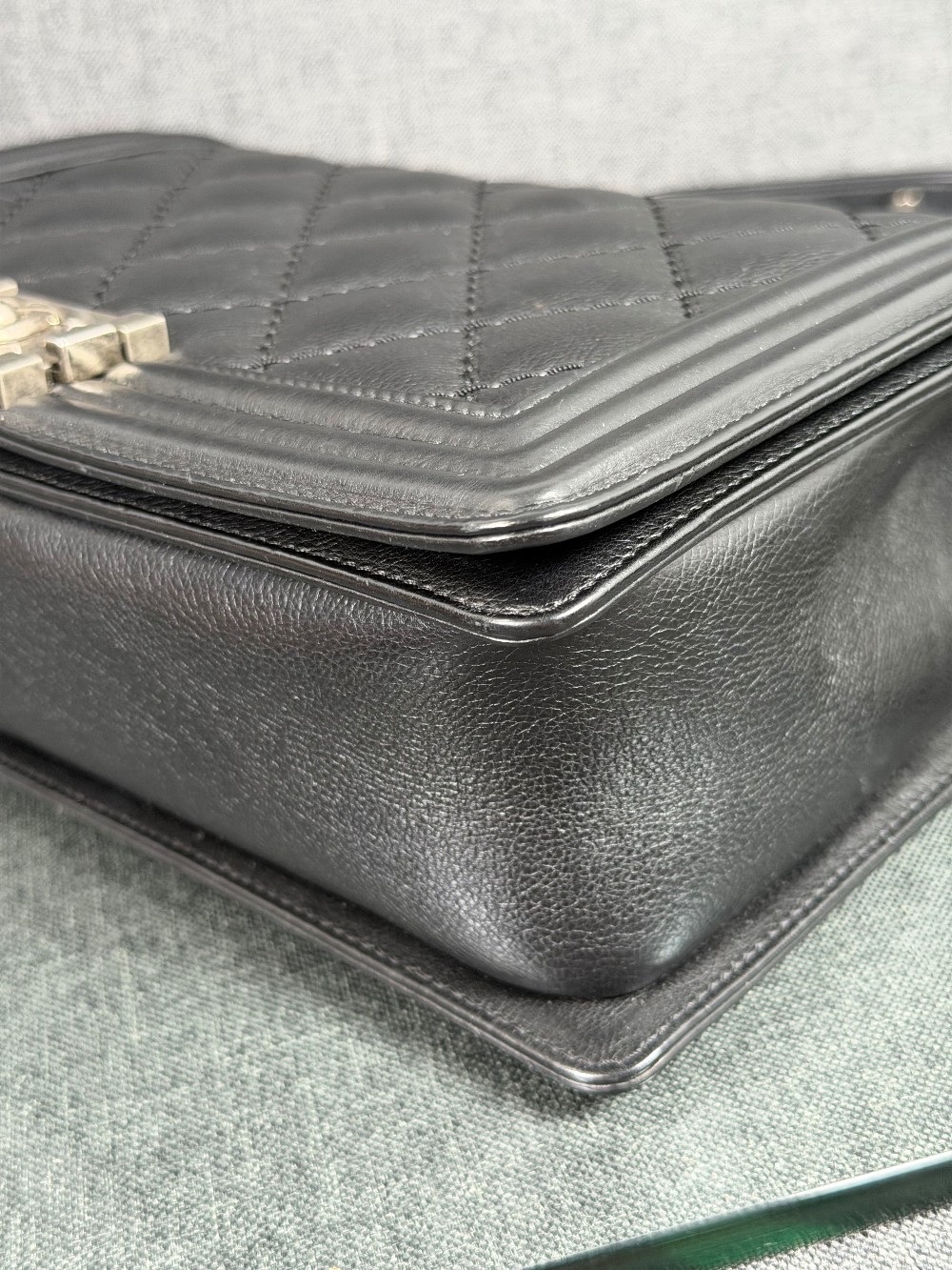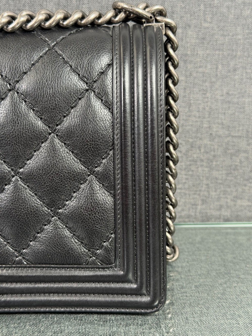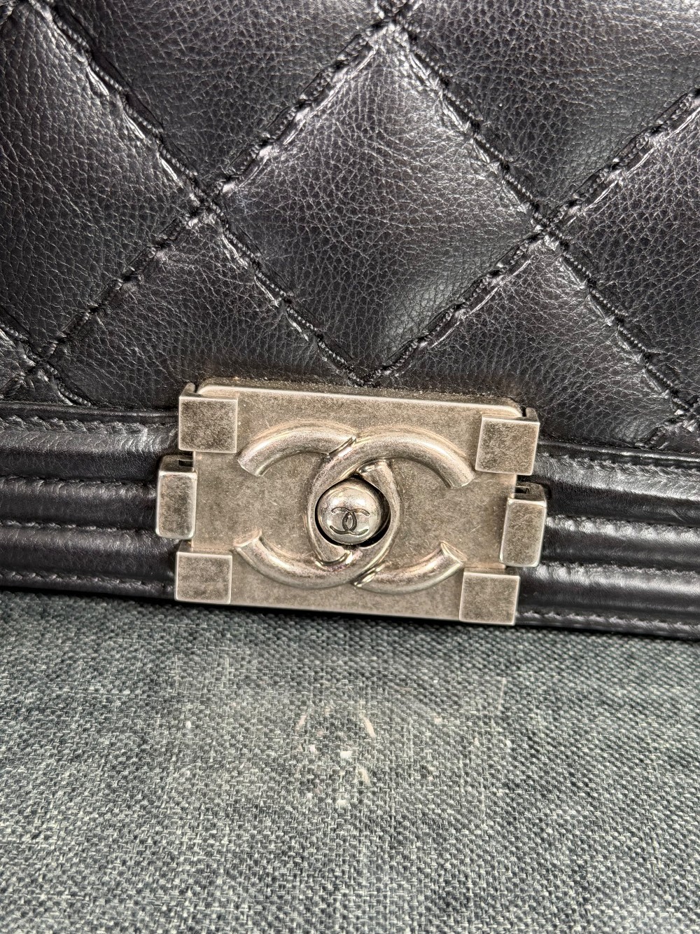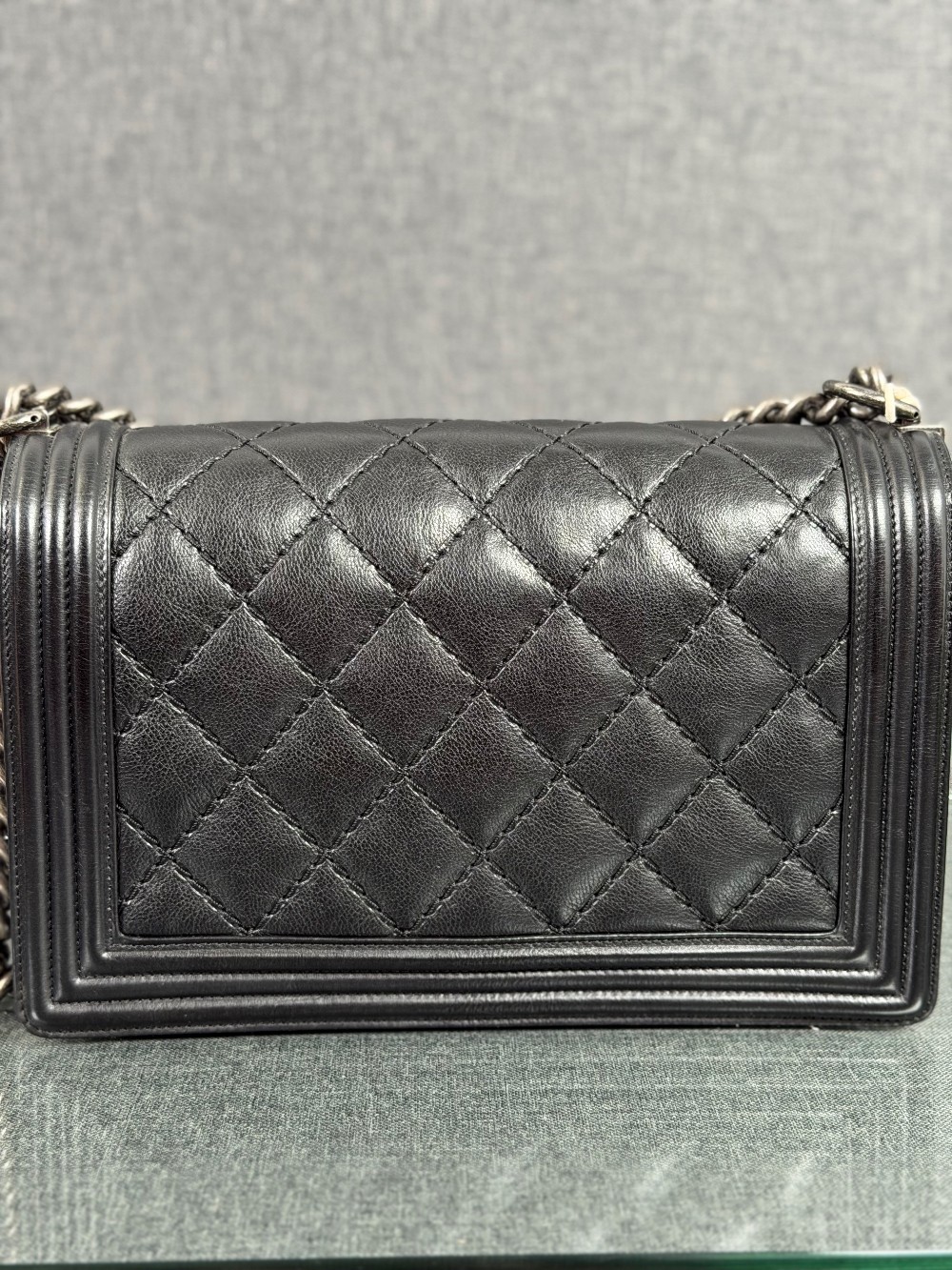 This is an authentic CHANEL Calfskin Embossed Stitch Large Boy Flap in Black. This chic shoulder bag is crafted of stitched diamond quilted calfskin leather in black. The bag features an aged ruthenium chain link shoulder strap with a leather shoulder pad, and a matching ruthenium boy CC push lock on the crossover flap. This opens the bag to a black fabric interior with a patch pocket.