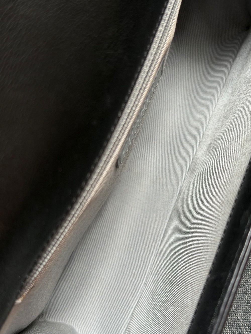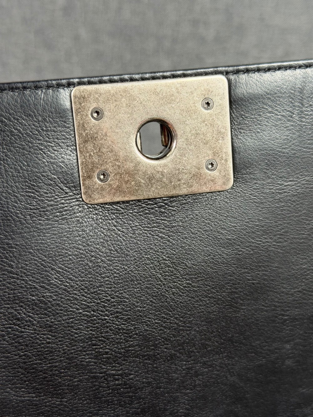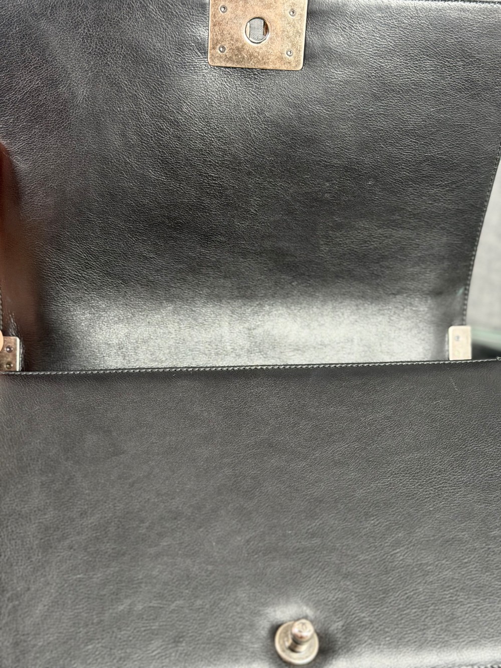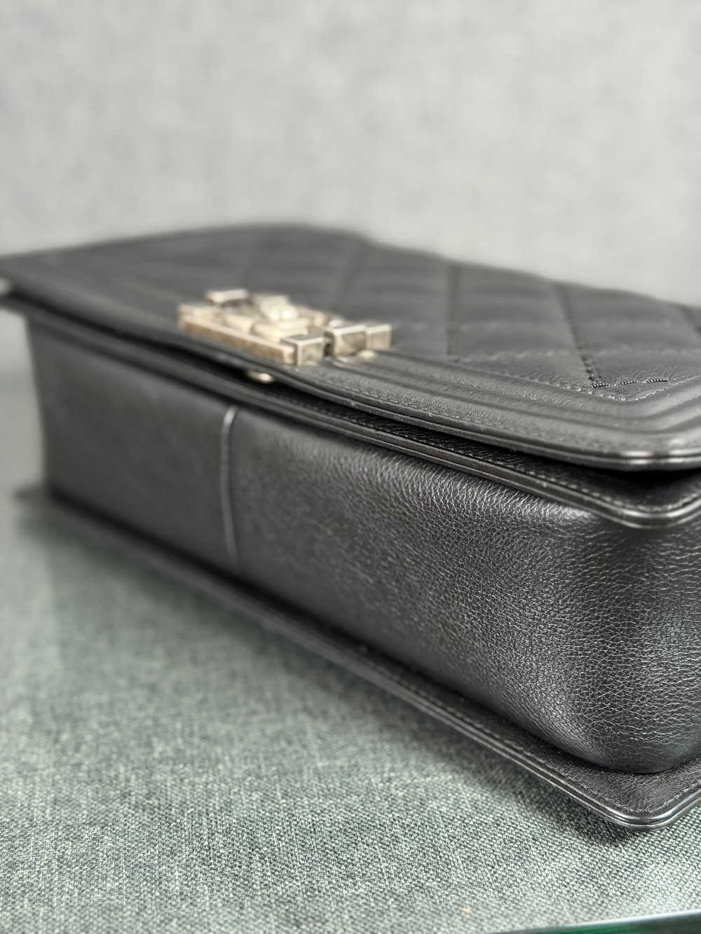 This is an authentic CHANEL Calfskin Embossed Stitch Large Boy Flap in Black. This chic shoulder bag is crafted of stitched diamond quilted calfskin leather in black. The bag features an aged ruthenium chain link shoulder strap with a leather shoulder pad, and a matching ruthenium boy CC push lock on the crossover flap. This opens the bag to a black fabric interior with a patch pocket.
