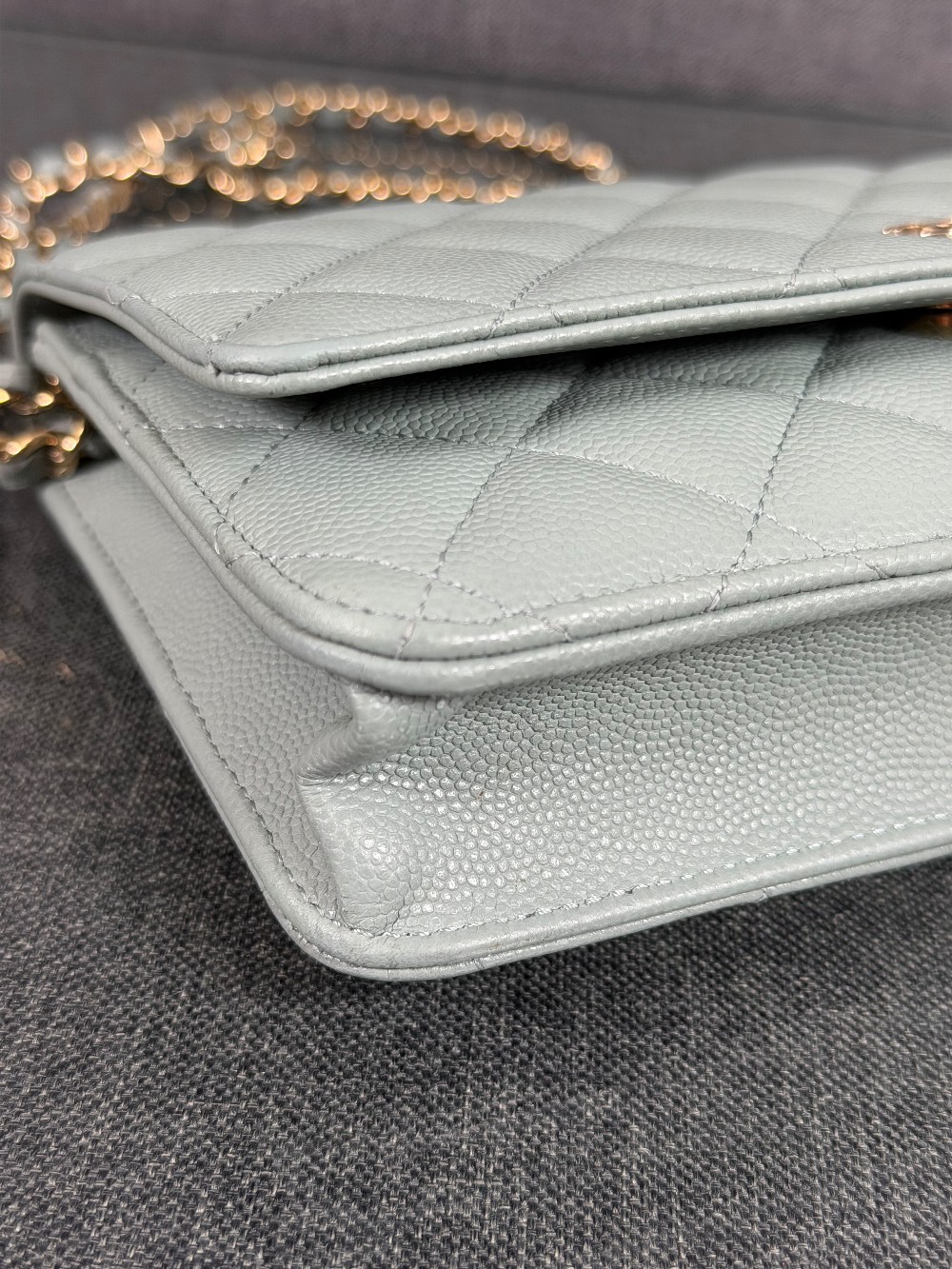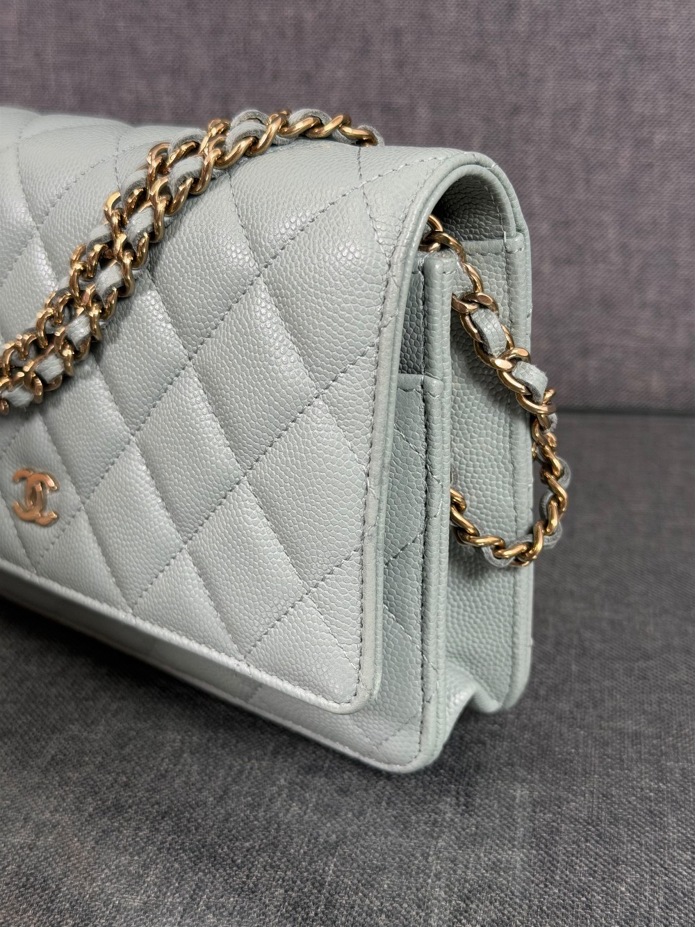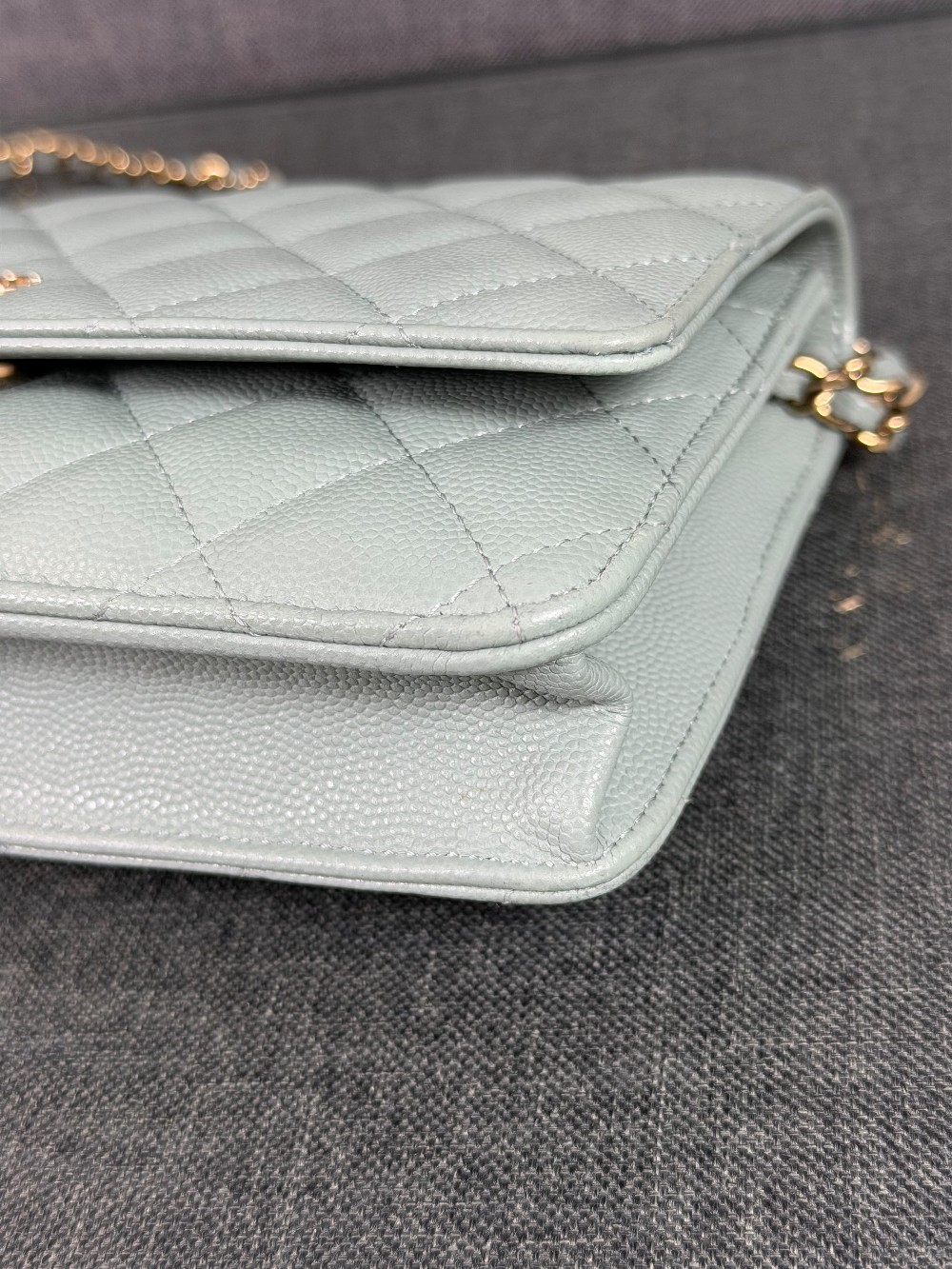 This is an authentic CHANEL Caviar Quilted Wallet On Chain WOC in Light Blue. This stylish wallet on a chain is crafted of luxurious diamond quilted caviar leather in light blue. The bag features a long light gold chain link leather threaded shoulder strap and a frontal Chanel CC. This opens with a magnet to a matching fabric interior with patch pockets, card slots and a zipper pocket.