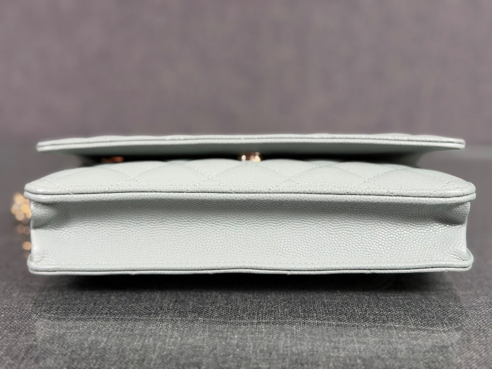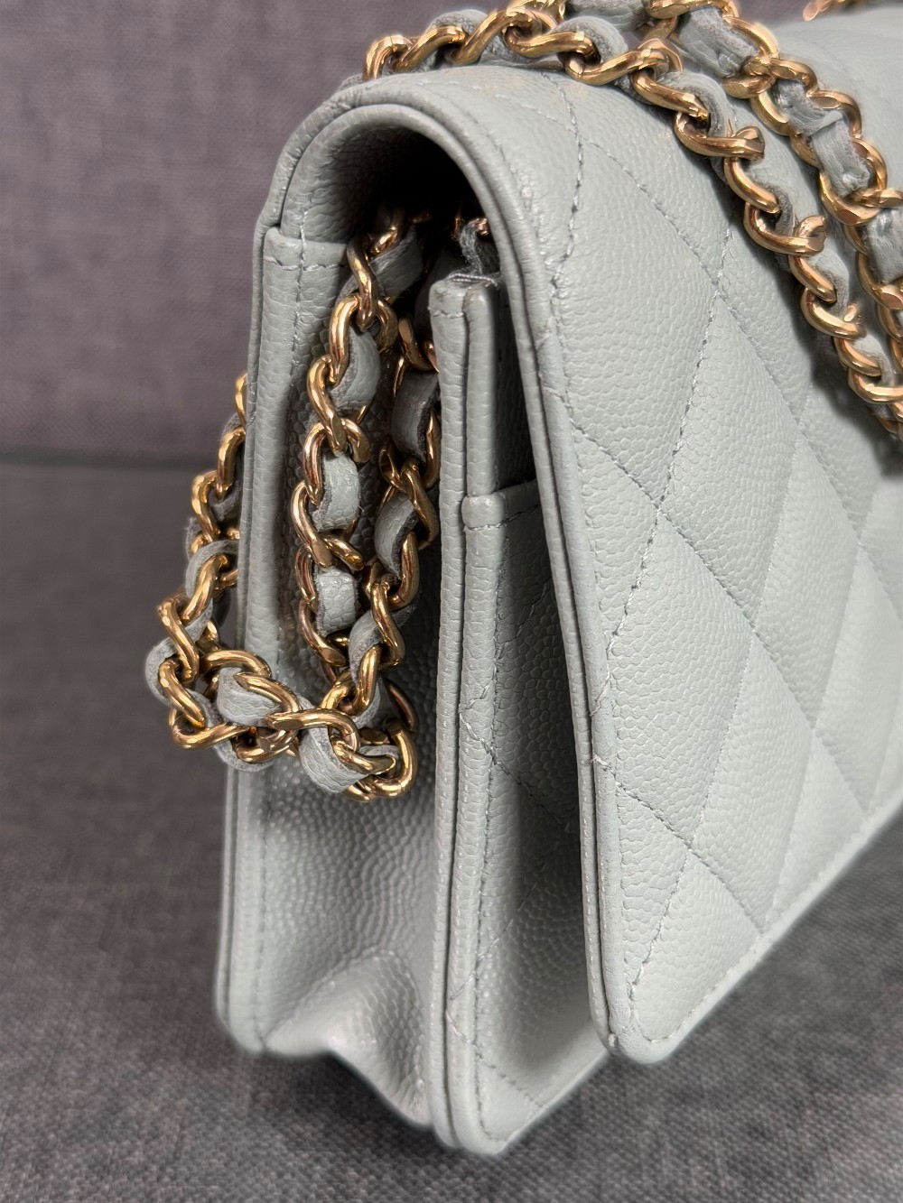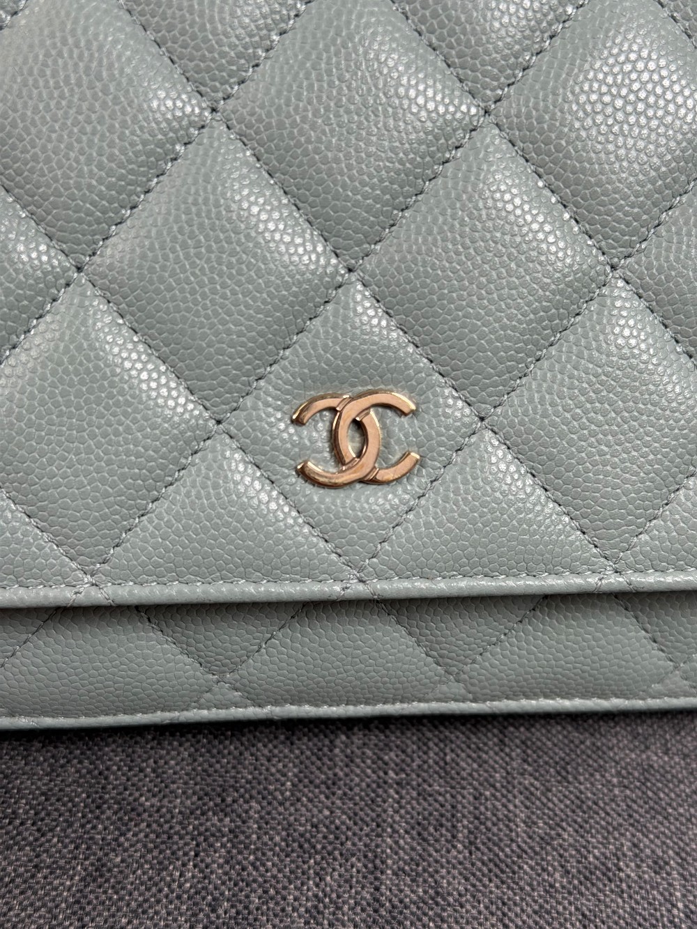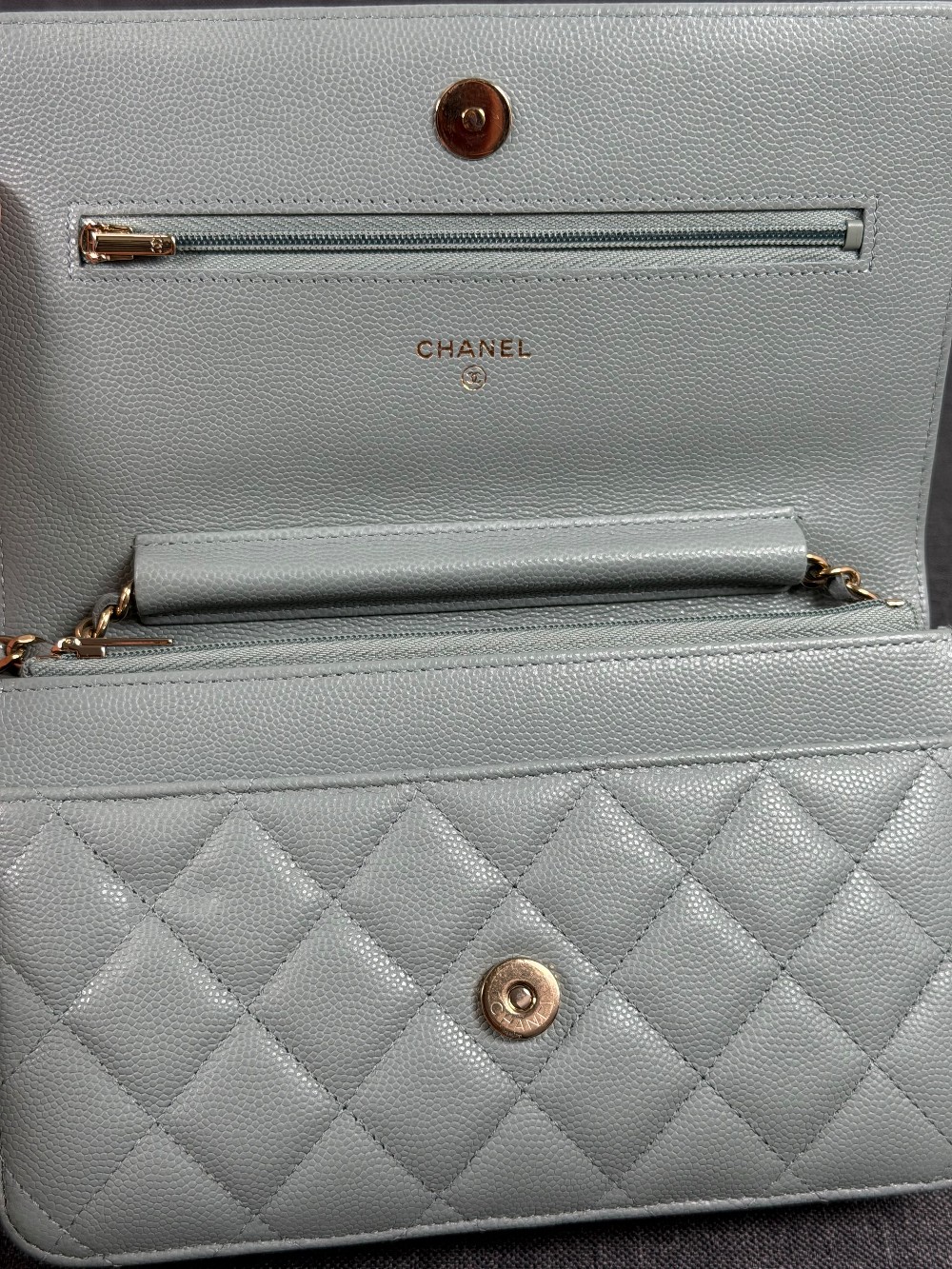 This is an authentic CHANEL Caviar Quilted Wallet On Chain WOC in Light Blue. This stylish wallet on a chain is crafted of luxurious diamond quilted caviar leather in light blue. The bag features a long light gold chain link leather threaded shoulder strap and a frontal Chanel CC. This opens with a magnet to a matching fabric interior with patch pockets, card slots and a zipper pocket.