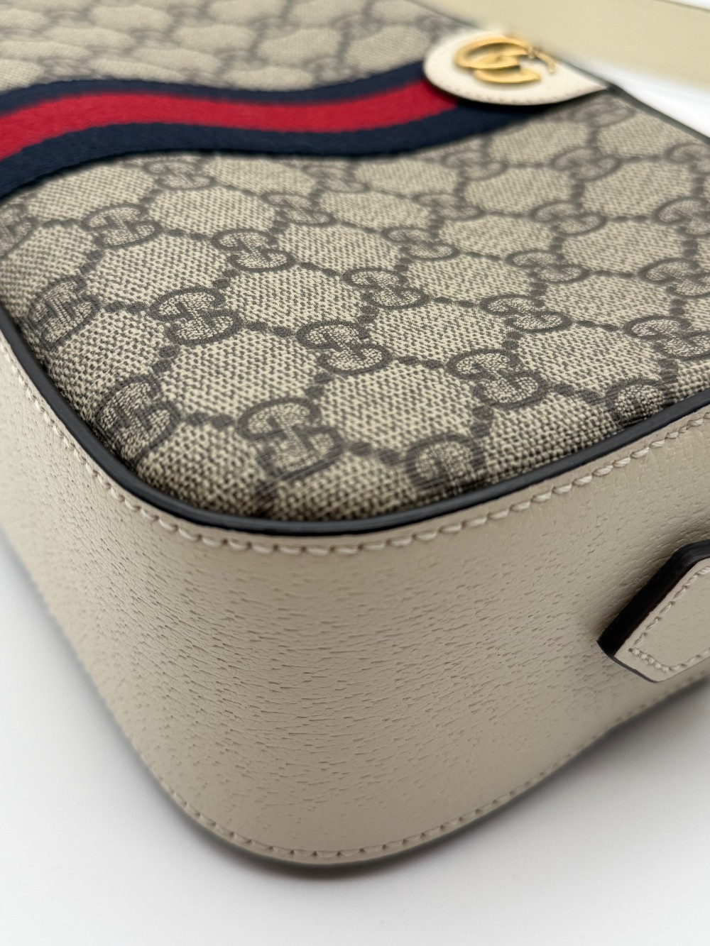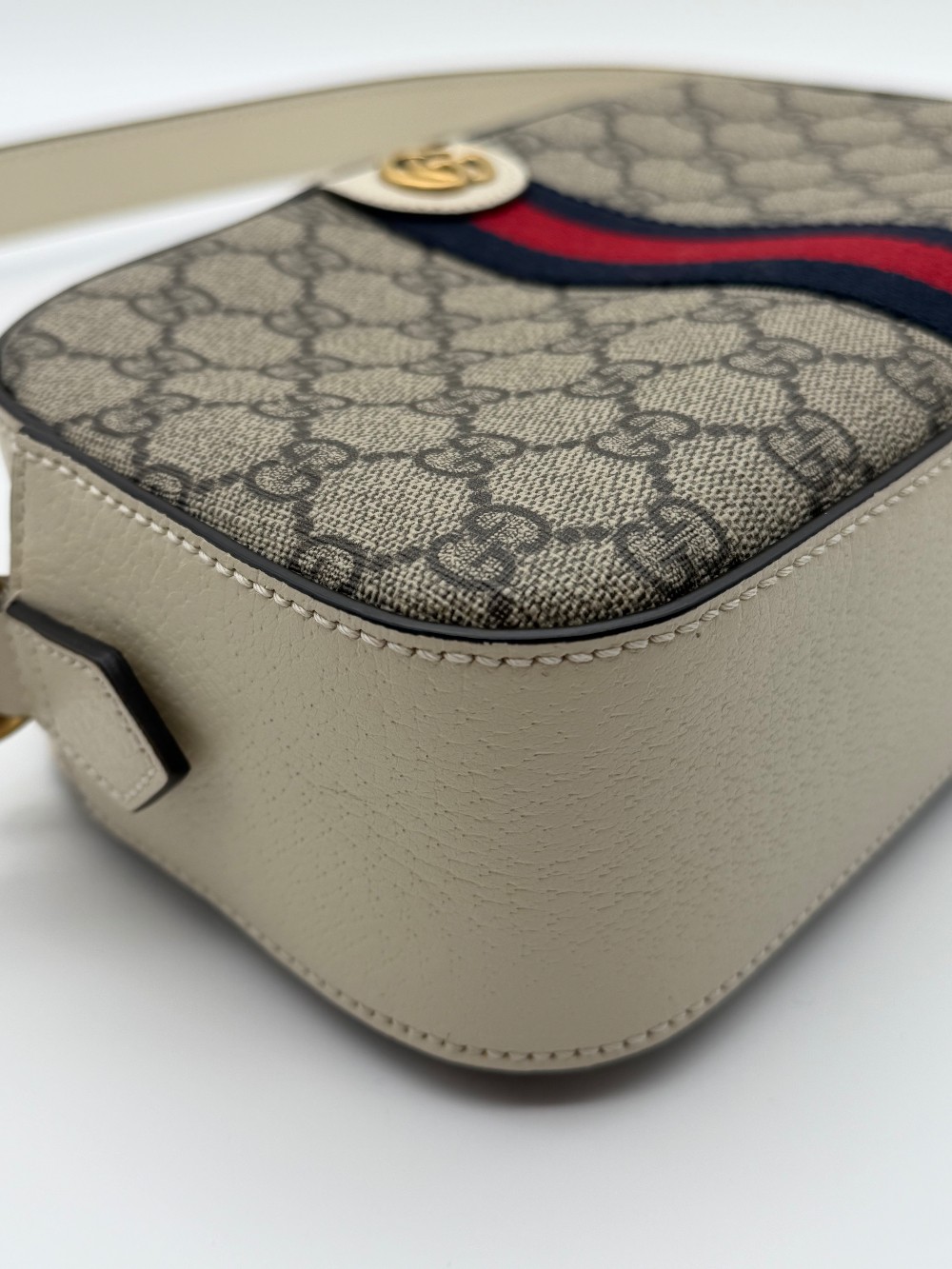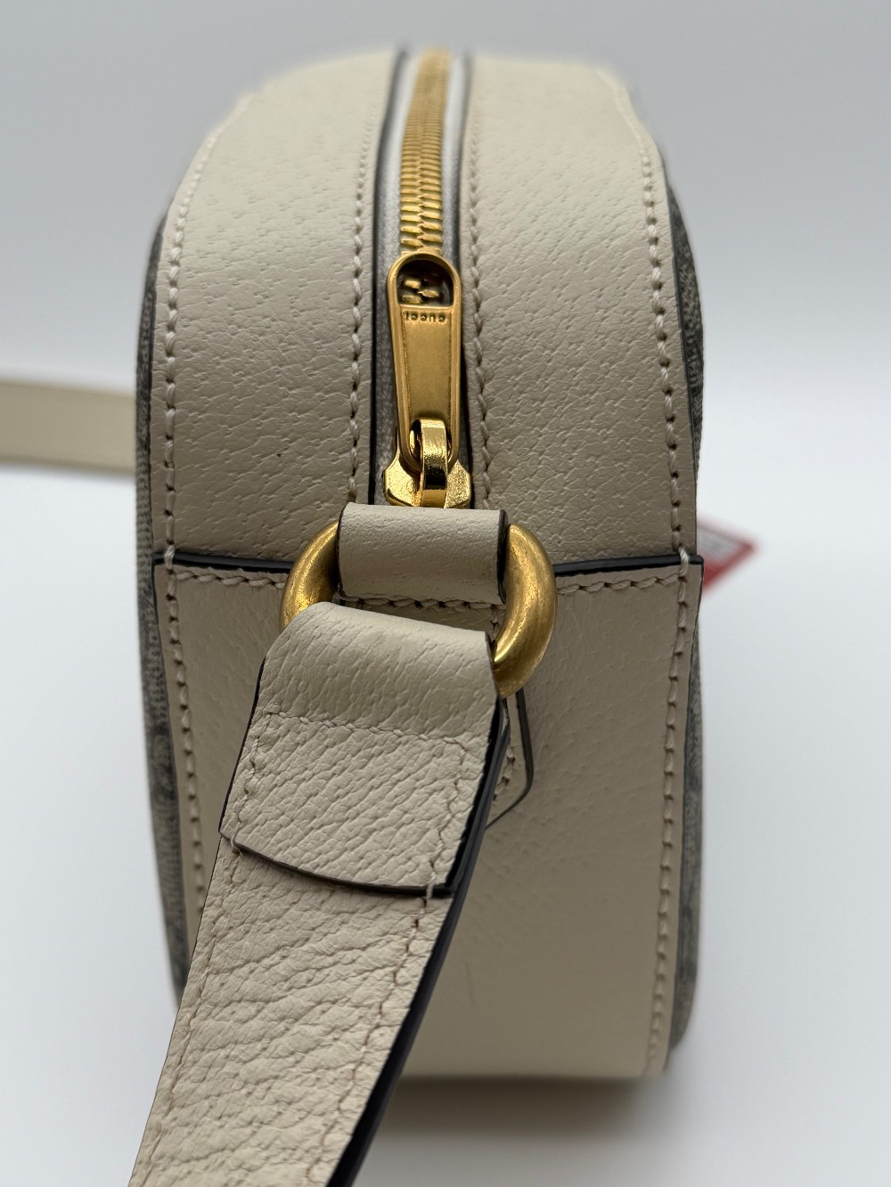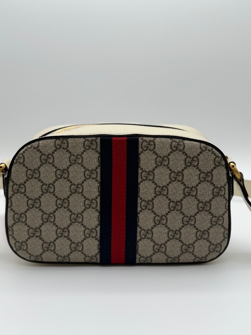 This is an authentic GUCCI GG Supreme Monogram Web Small Ophidia Camera Bag in Beige and Mystic White. This chic shoulder bag is finely crafted of brown on beige and ebony Gucci GG monogram coated canvas with a web stripe detail. The shoulder bag features a beige leather shoulder strap and aged gold hardware. The zipper opens to a beige fabric interior with a leather patch pocket.