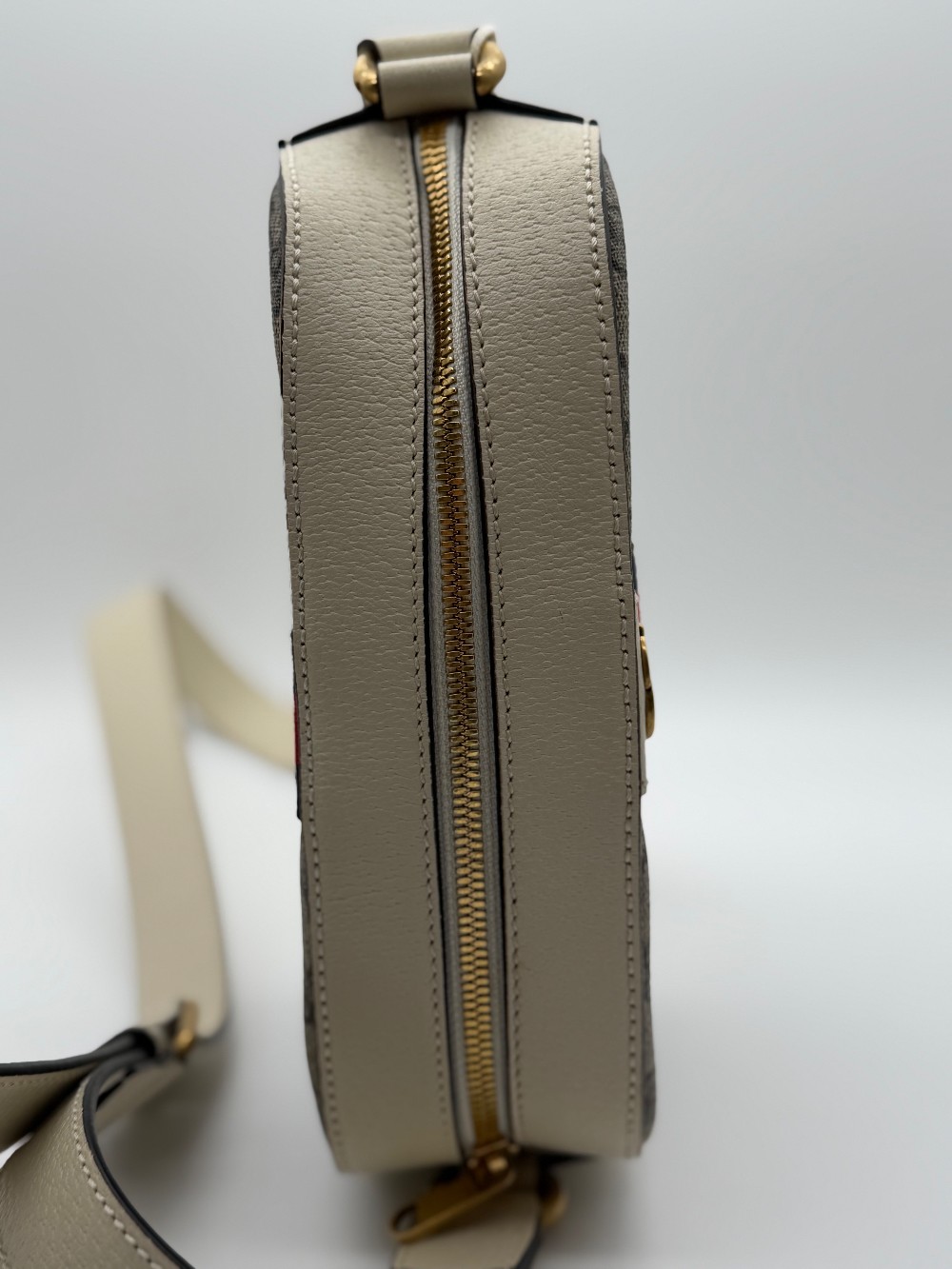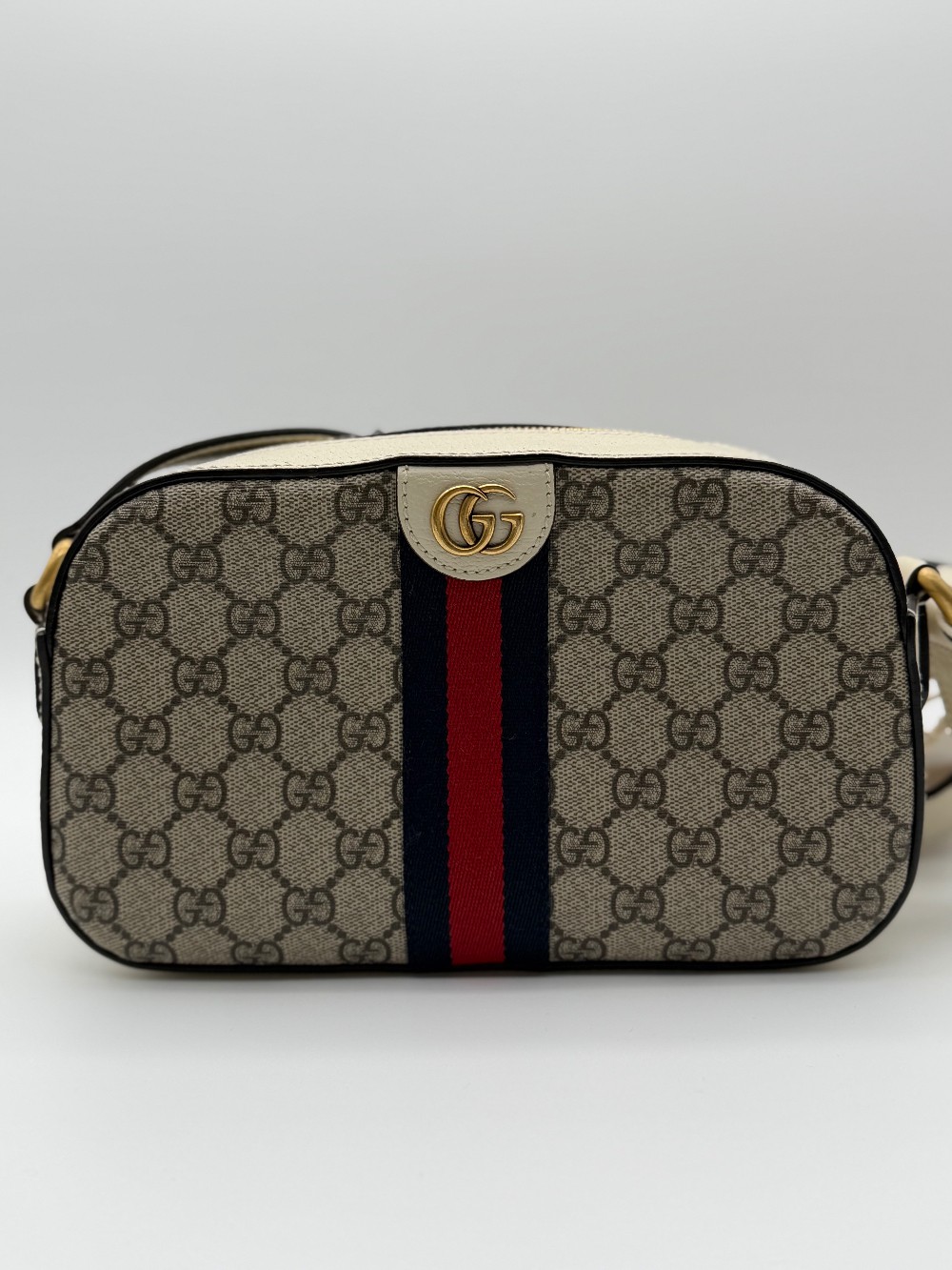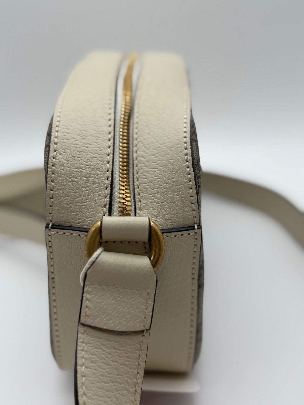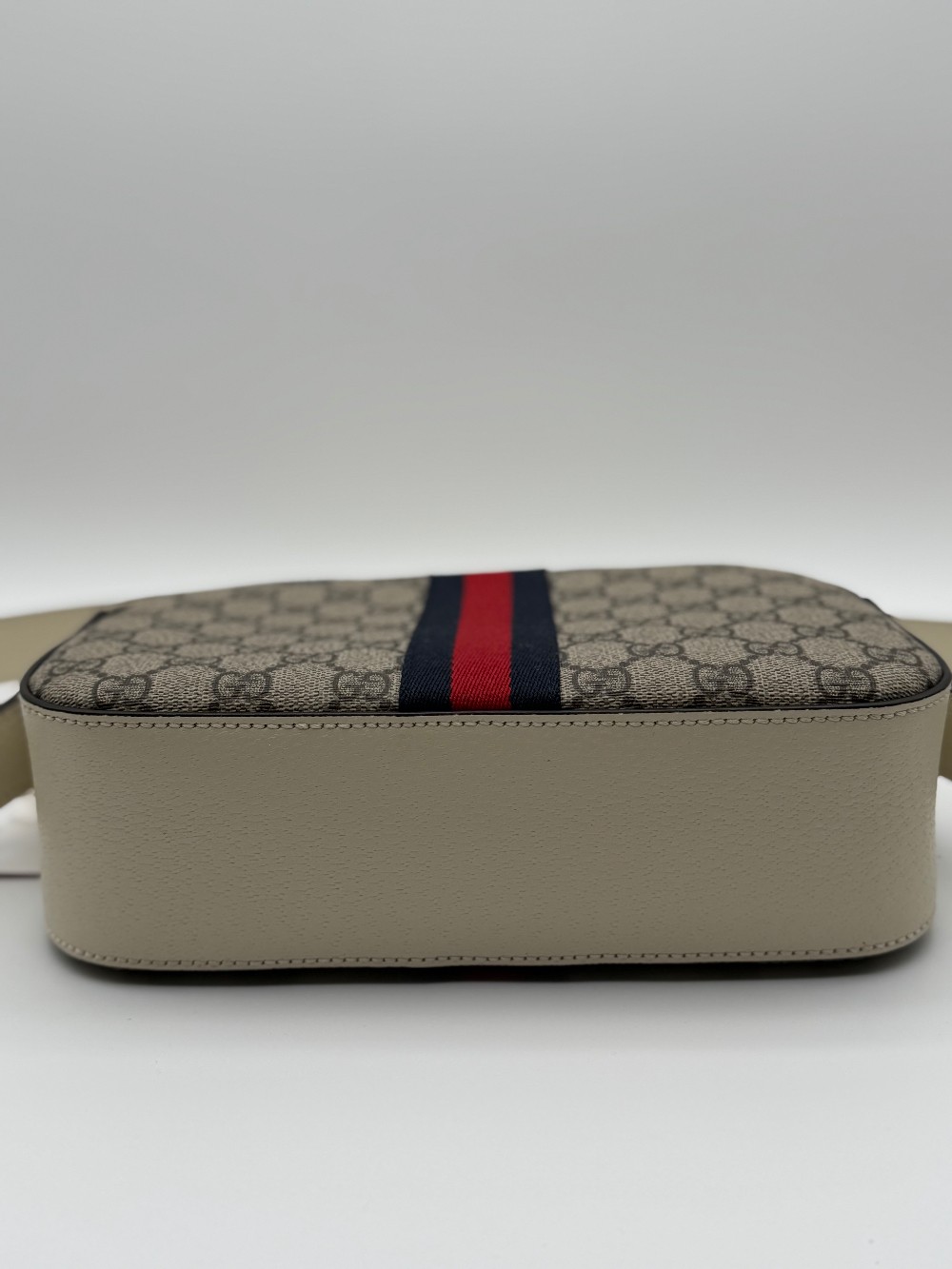 This is an authentic GUCCI GG Supreme Monogram Web Small Ophidia Camera Bag in Beige and Mystic White. This chic shoulder bag is finely crafted of brown on beige and ebony Gucci GG monogram coated canvas with a web stripe detail. The shoulder bag features a beige leather shoulder strap and aged gold hardware. The zipper opens to a beige fabric interior with a leather patch pocket.