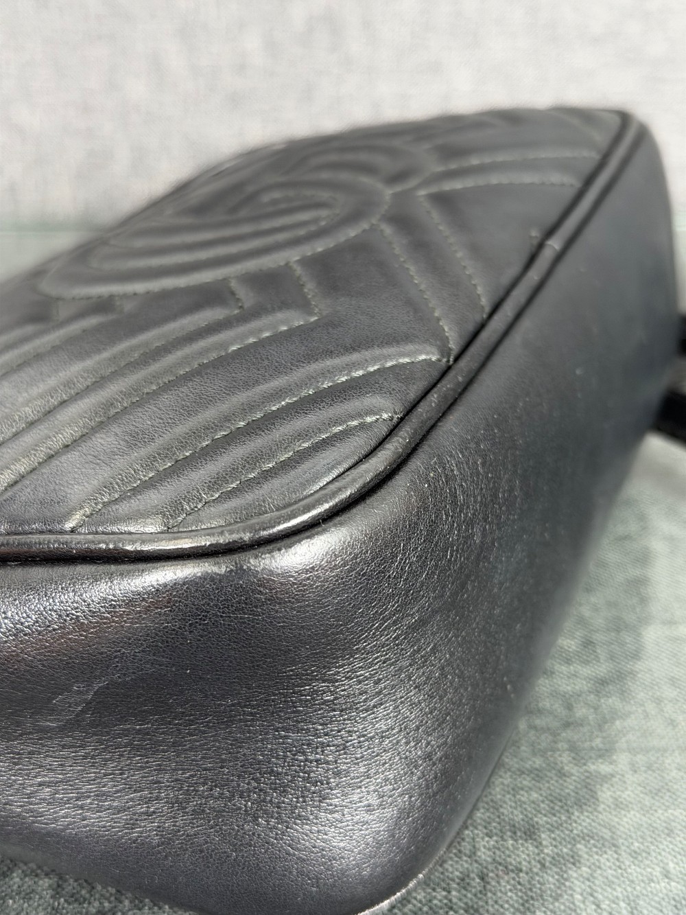 This is an authentic GUCCI Calfskin Matelasse Small GG Marmont Chain Shoulder Bag in Black. This shoulder bag is crafted of smooth and supple calfskin leather in black. This bag features an aged gold chain with a leather shoulder pad and a Gucci GG logo on the front. The top zipper opens to a beige microfiber interior with a flat pocket.