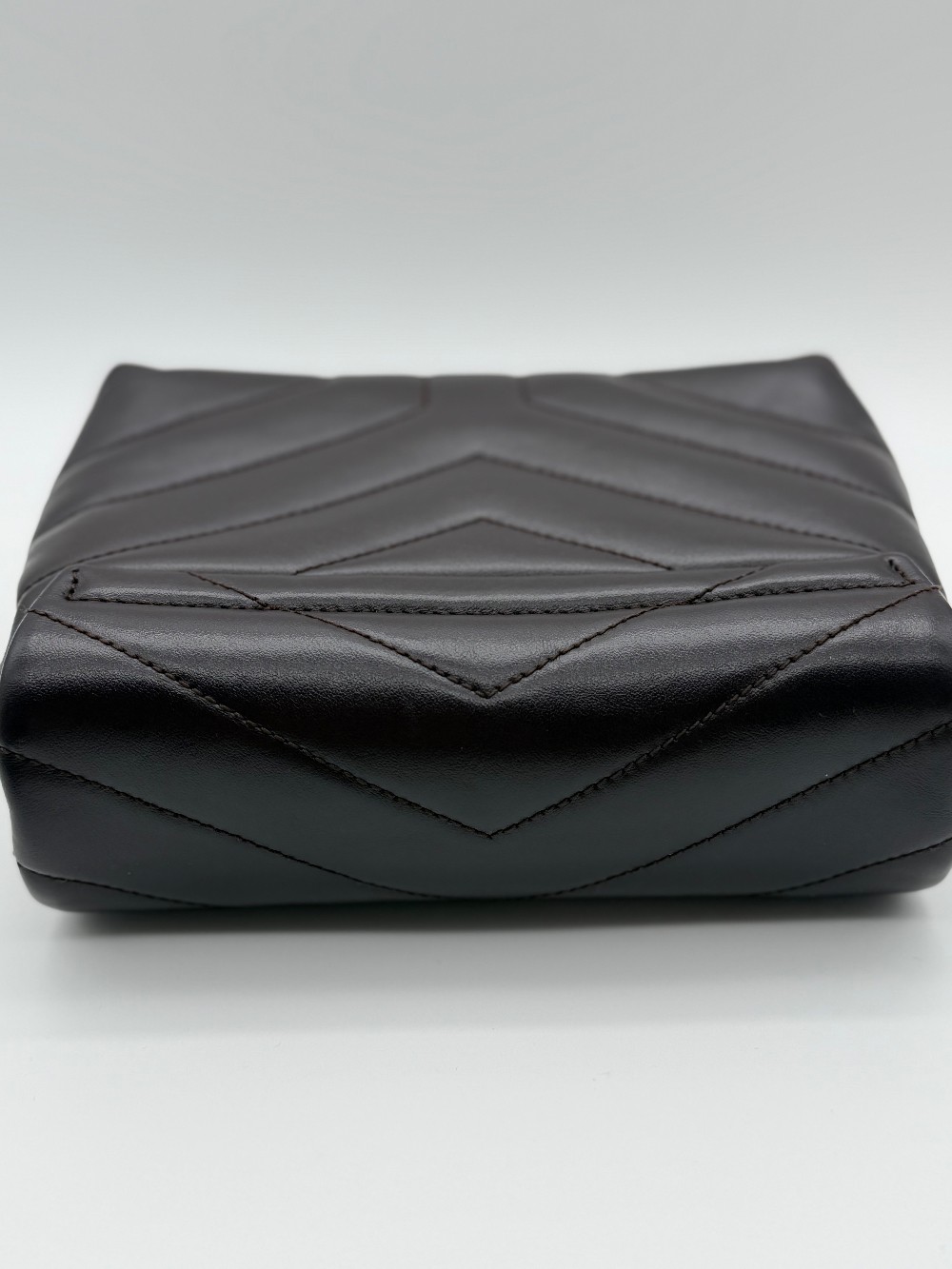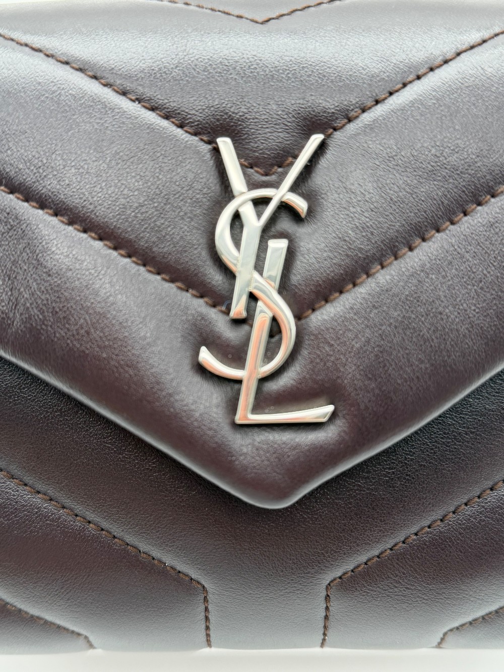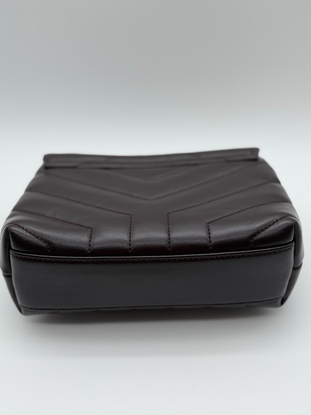 This is an authentic SAINT LAURENT Calfskin Y Quilted Monogram Monochrome Toy Loulou Crossbody Bag in Bordeaux. This mini bag is crafted of chevron-quilted calfskin leather in Bordeaux. It features a removable adjustable Bordeaux leather crossbody strap and a crossover flap with silver hardware YSL emblem. The flap opens with a magnetic snap to a partitioned black fabric interior with a zippered pocket and card slots.