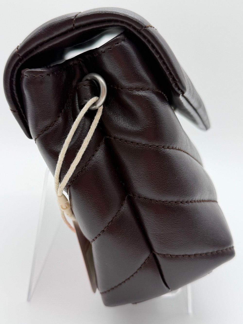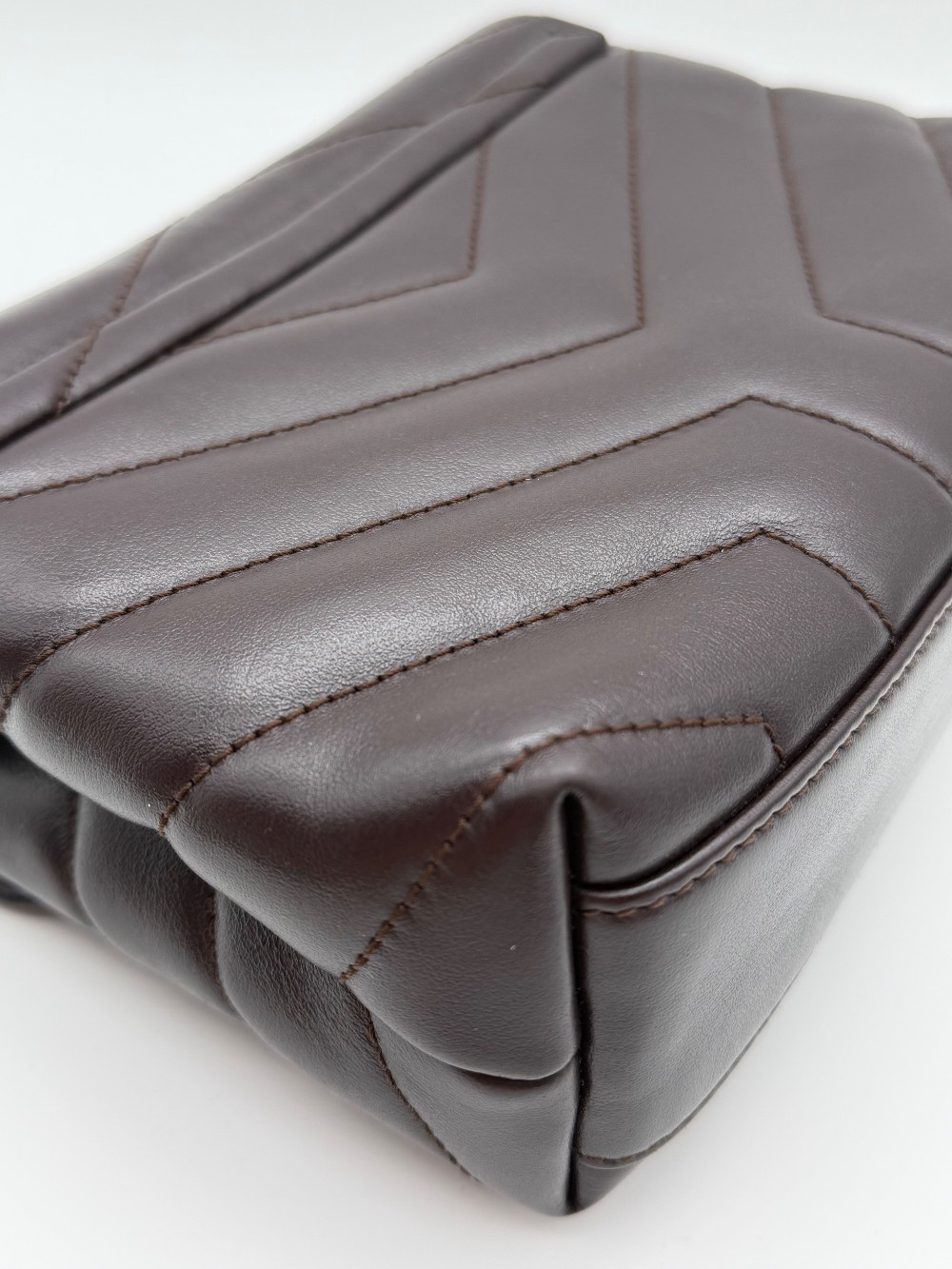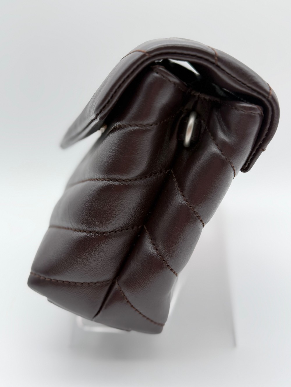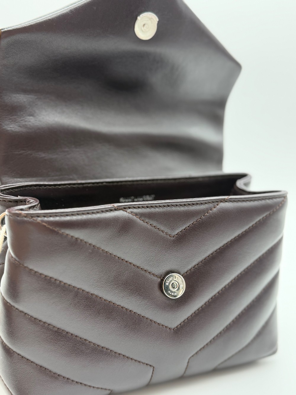 This is an authentic SAINT LAURENT Calfskin Y Quilted Monogram Monochrome Toy Loulou Crossbody Bag in Bordeaux. This mini bag is crafted of chevron-quilted calfskin leather in Bordeaux. It features a removable adjustable Bordeaux leather crossbody strap and a crossover flap with silver hardware YSL emblem. The flap opens with a magnetic snap to a partitioned black fabric interior with a zippered pocket and card slots.