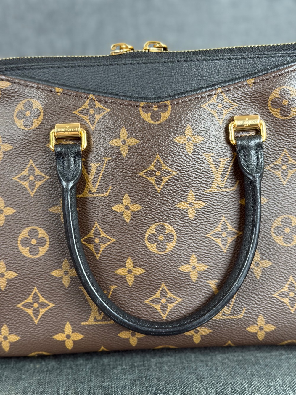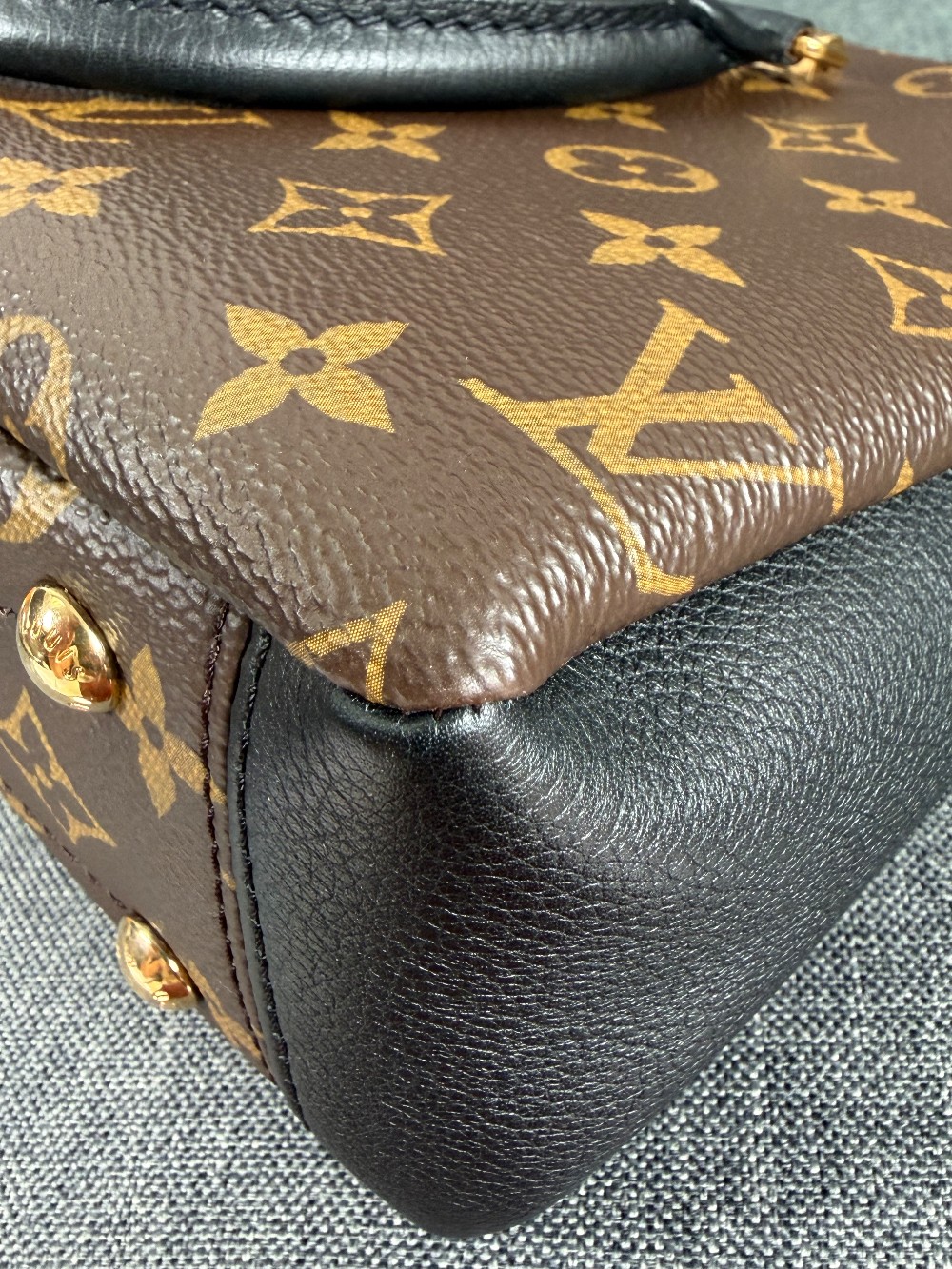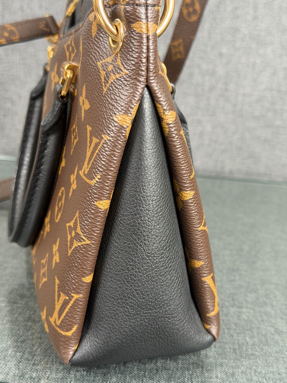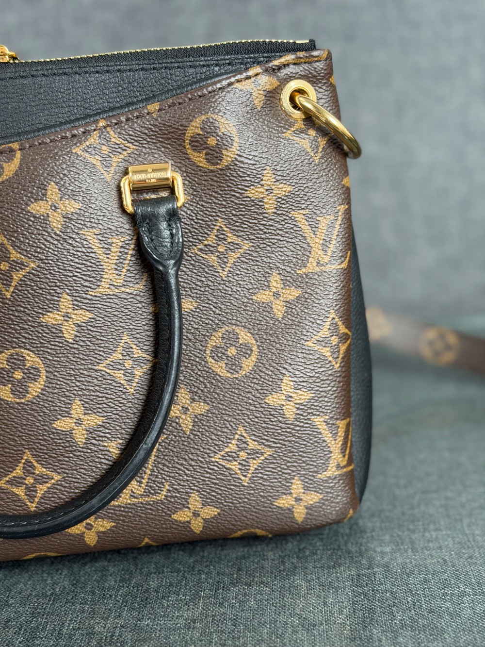 This is an authentic LOUIS VUITTON Monogram Pallas Full BB in Black. This petite tote is crafted of Louis Vuitton monogram coated canvas. The bag features treated rolled leather top handles, an optional monogram coated canvas shoulder strap, side pockets on either side of the main compartment, and gold hardware. The top zippers opens to a black microfiber interior with a patch pocket.