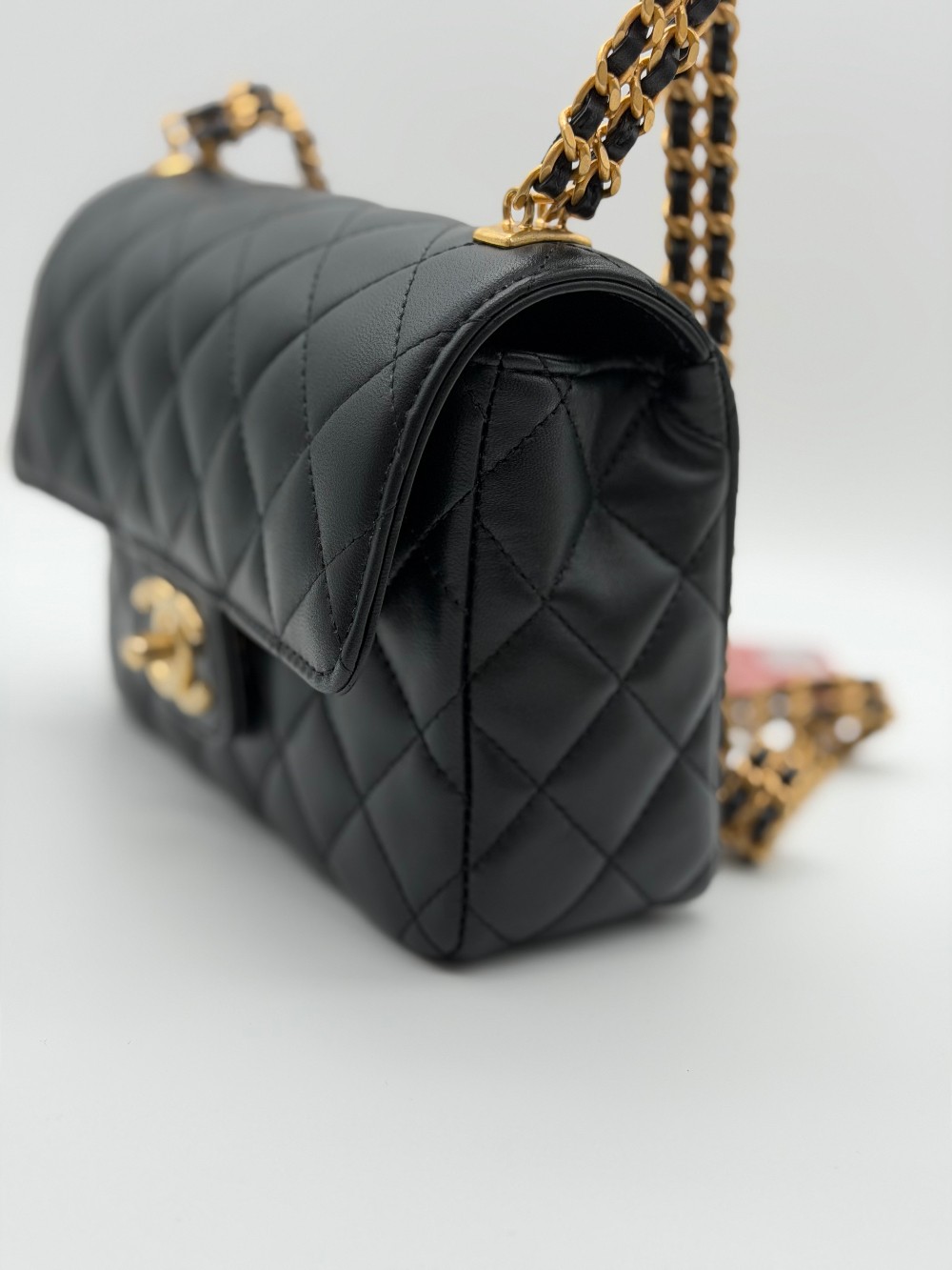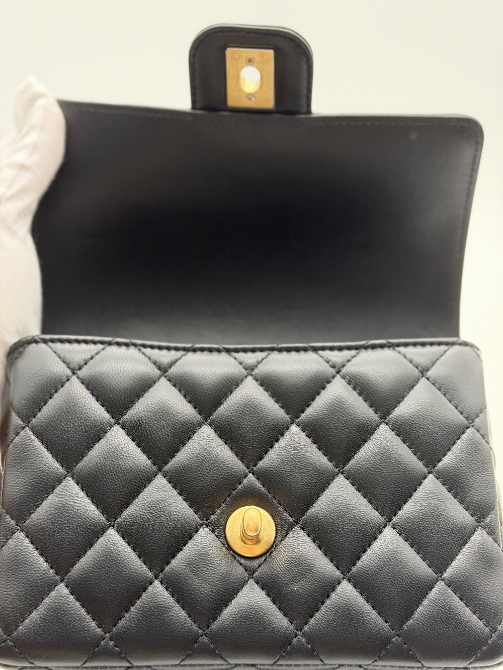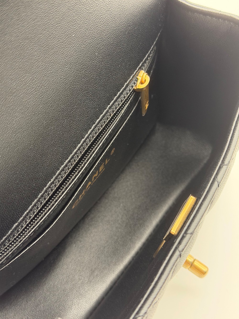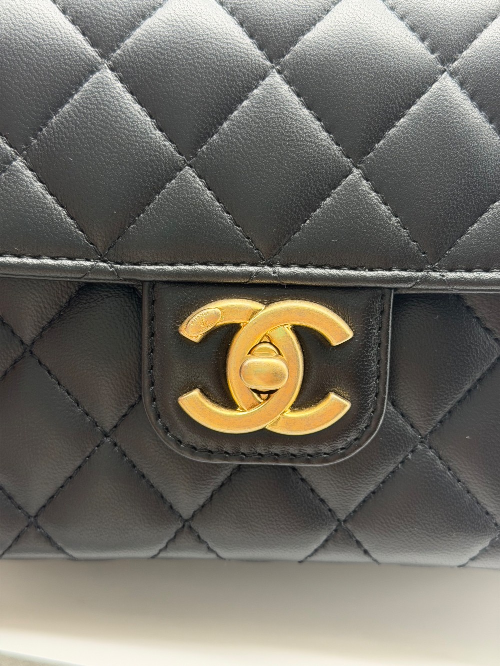 This particular model features a single flapwith the iconic interlocking CC turn-lock closure in gold-tone metal.