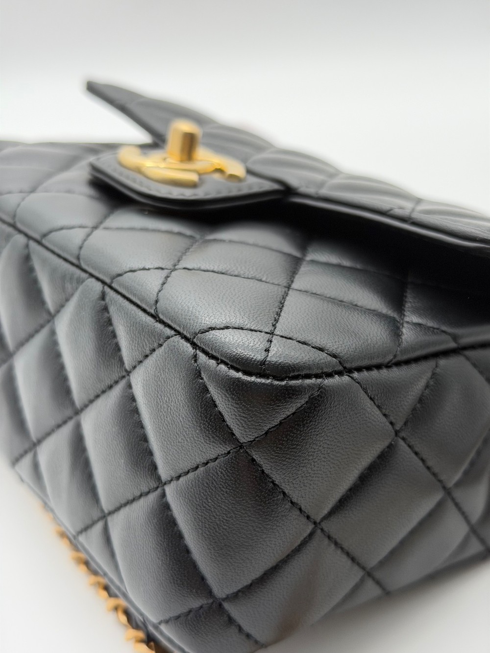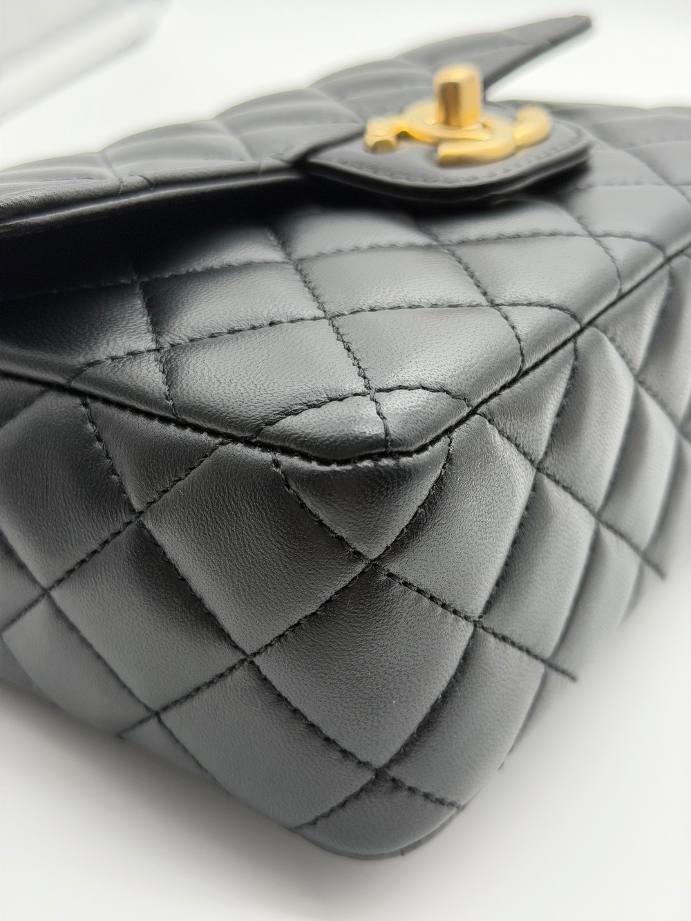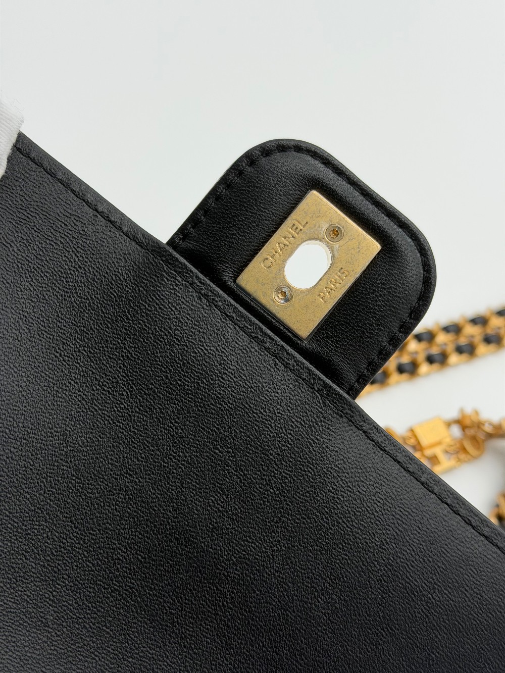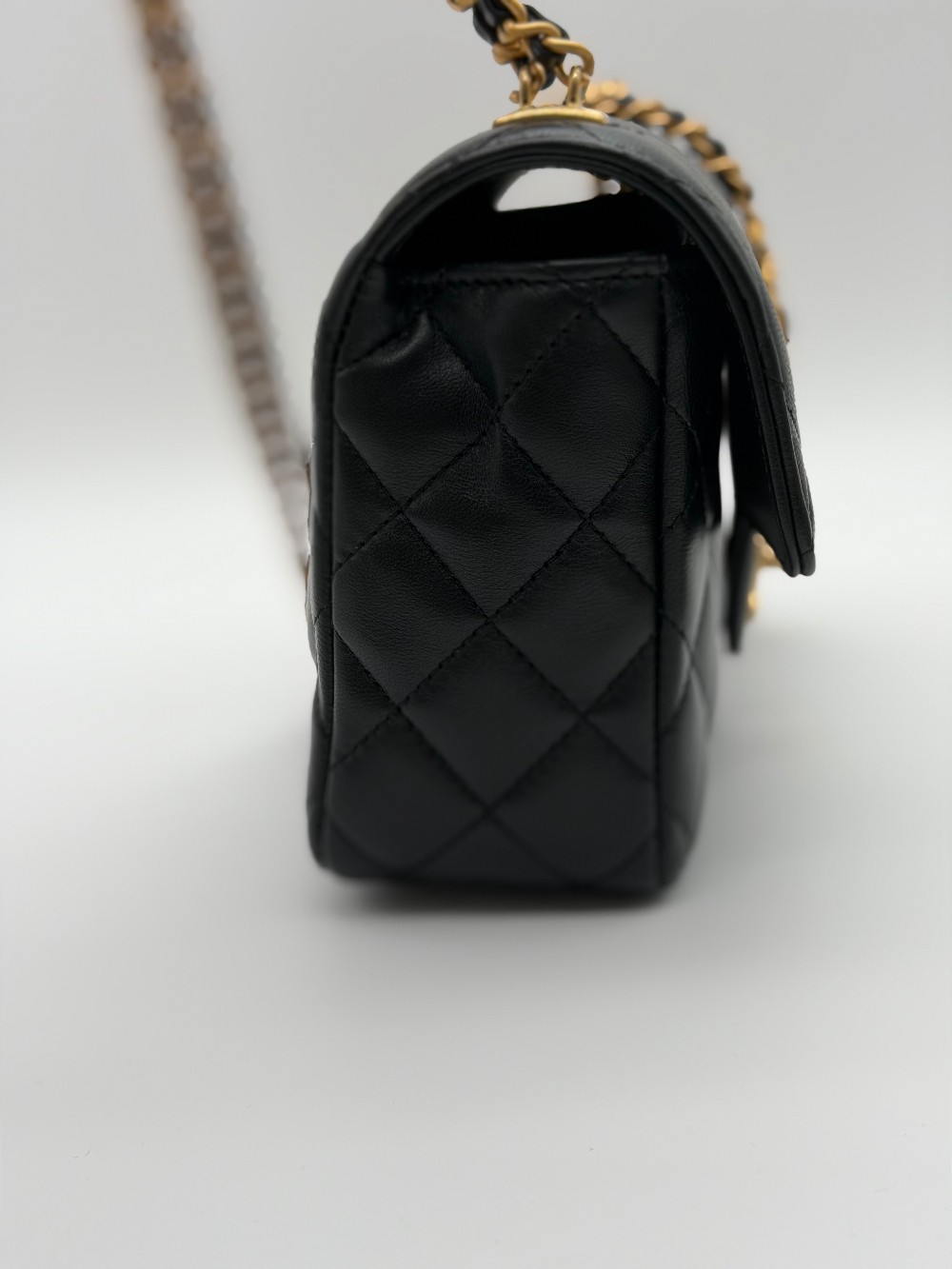 This particular model features a single flapwith the iconic interlocking CC turn-lock closure in gold-tone metal.