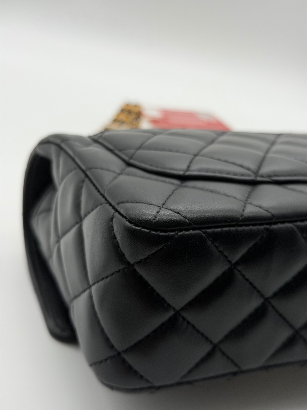 It is crafted from luxurious black lambskin leather, known for its soft, buttery feel and classic quilted finish.