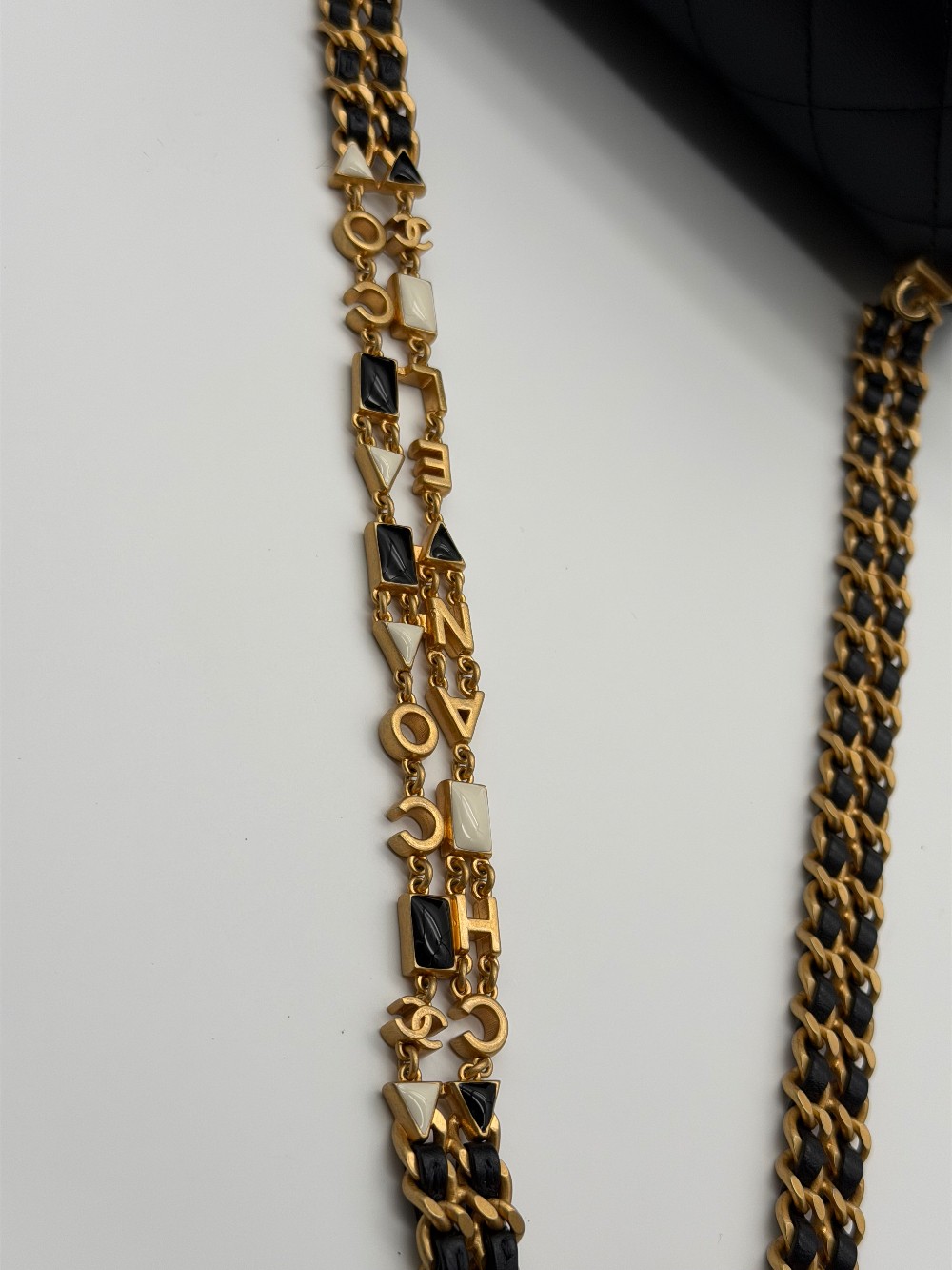 A standout feature of this specific version is the ornate gold-tone and resin chain. The strap is intricately detailed with square and circular resin charms, some featuring the "CHANEL" name or CC logos, interspersed with a traditional leather-interlaced chain.