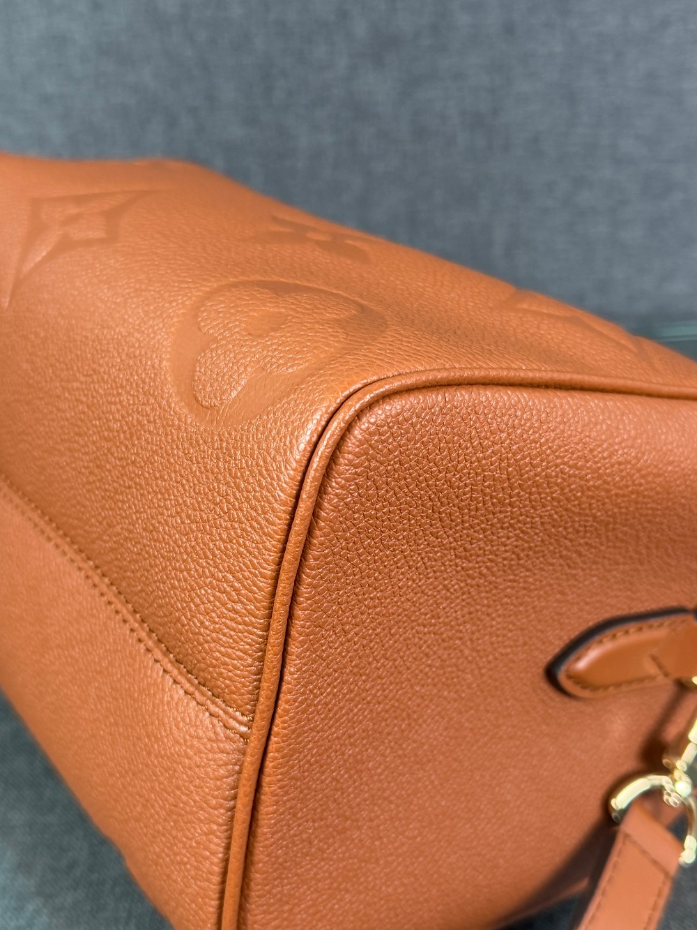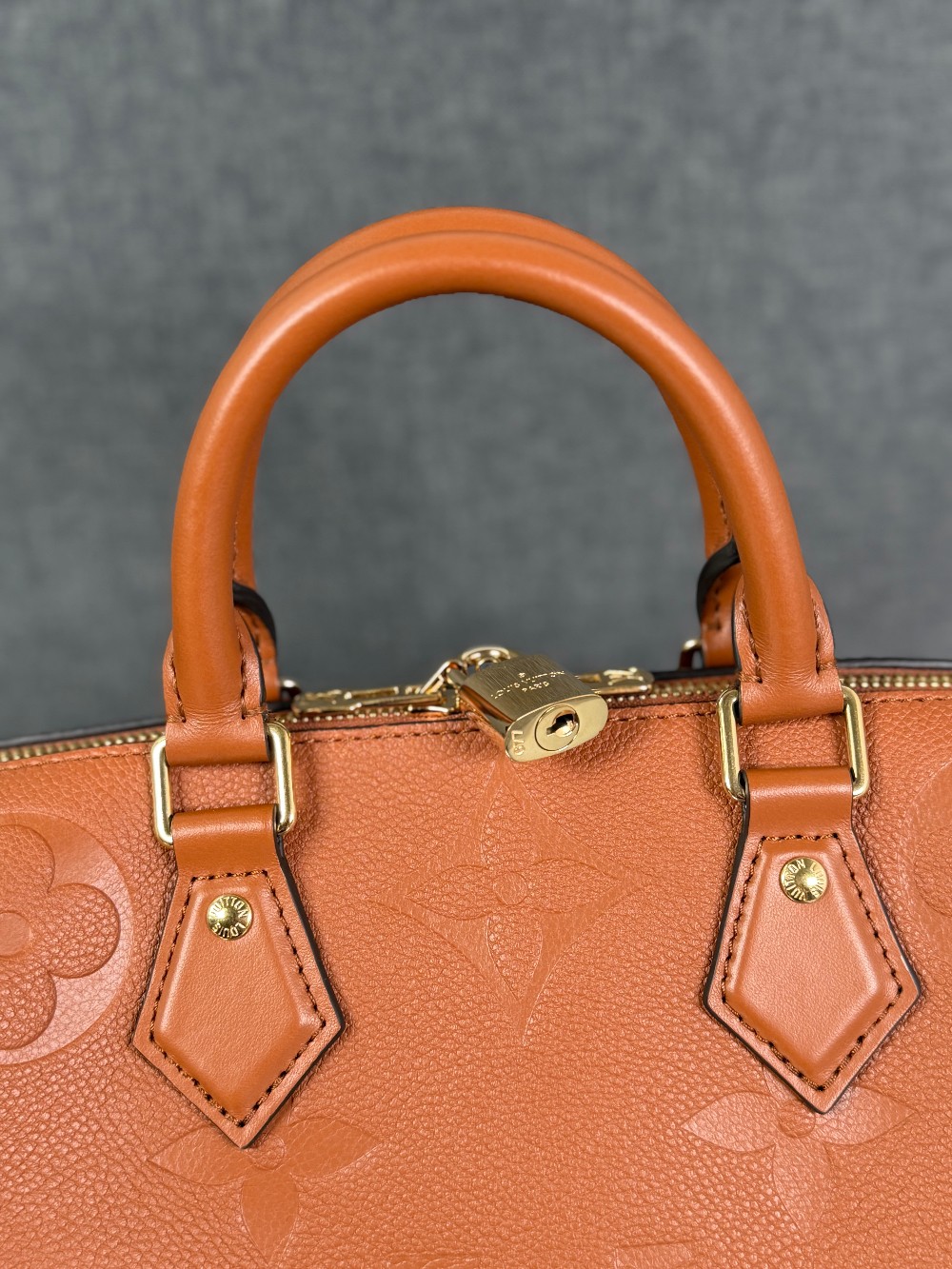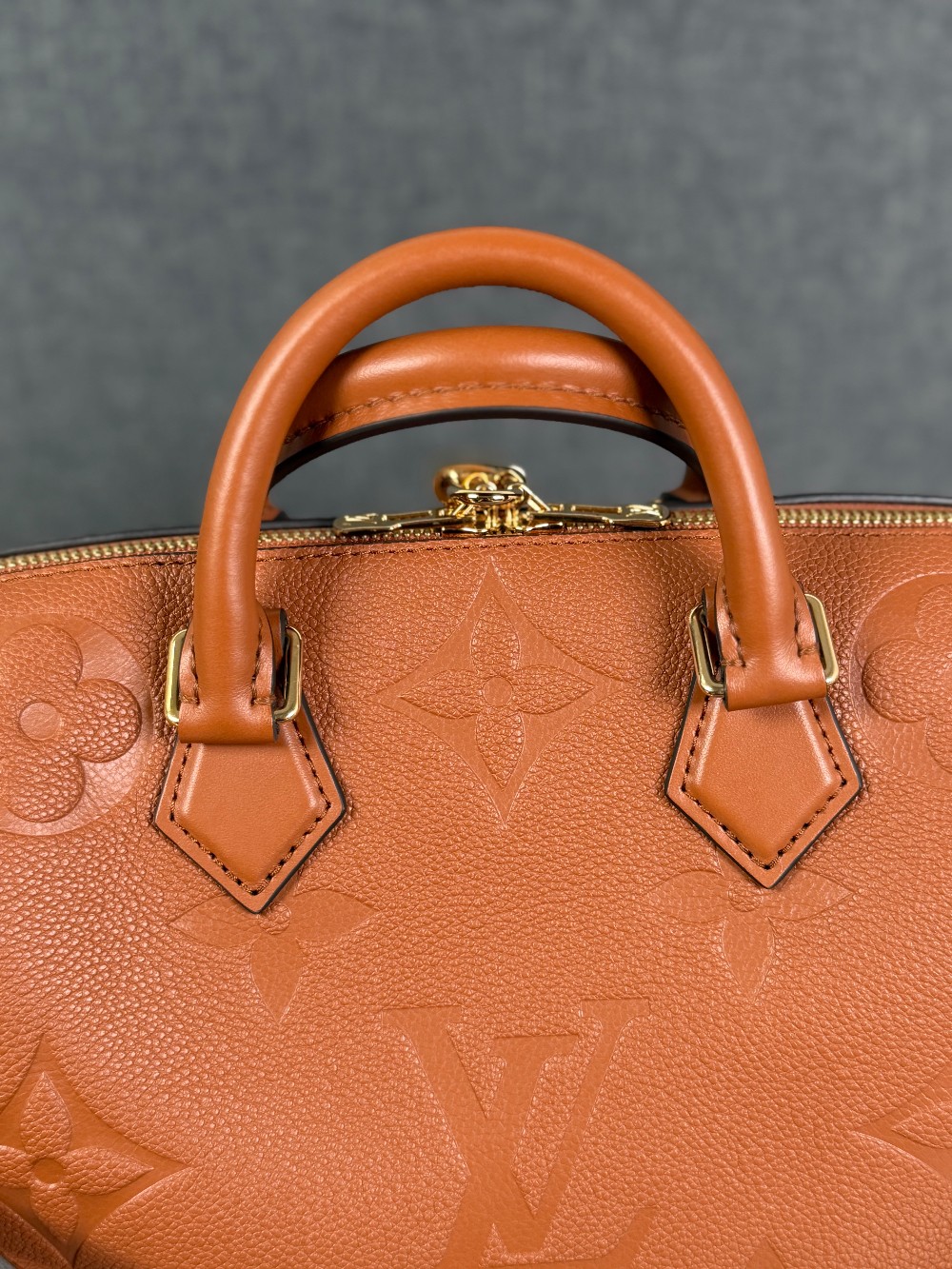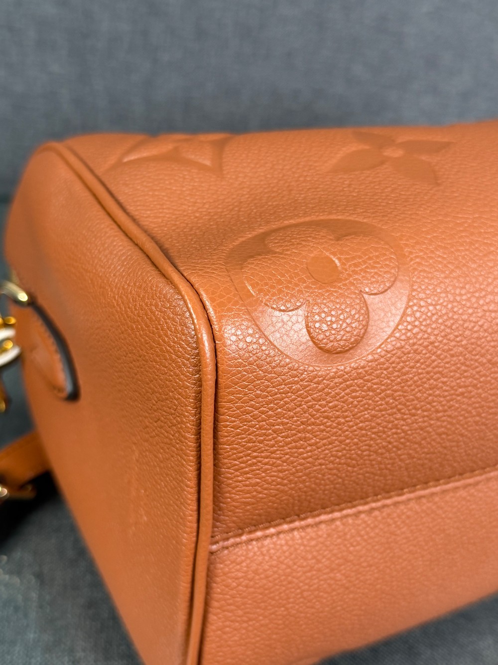 This is an authentic LOUIS VUITTON Empreinte Monogram Giant Speedy Bandouliere 25 in Cognac. This classic handbag is crafted of oversized monogram embossed cowhide leather in cognac brown. The bag features cowhide leather rolled leather top handles, an optional leather shoulder strap, and gold-toned hardware. The top zipper opens to a matching brown microfiber interior with zipper and patch pockets.