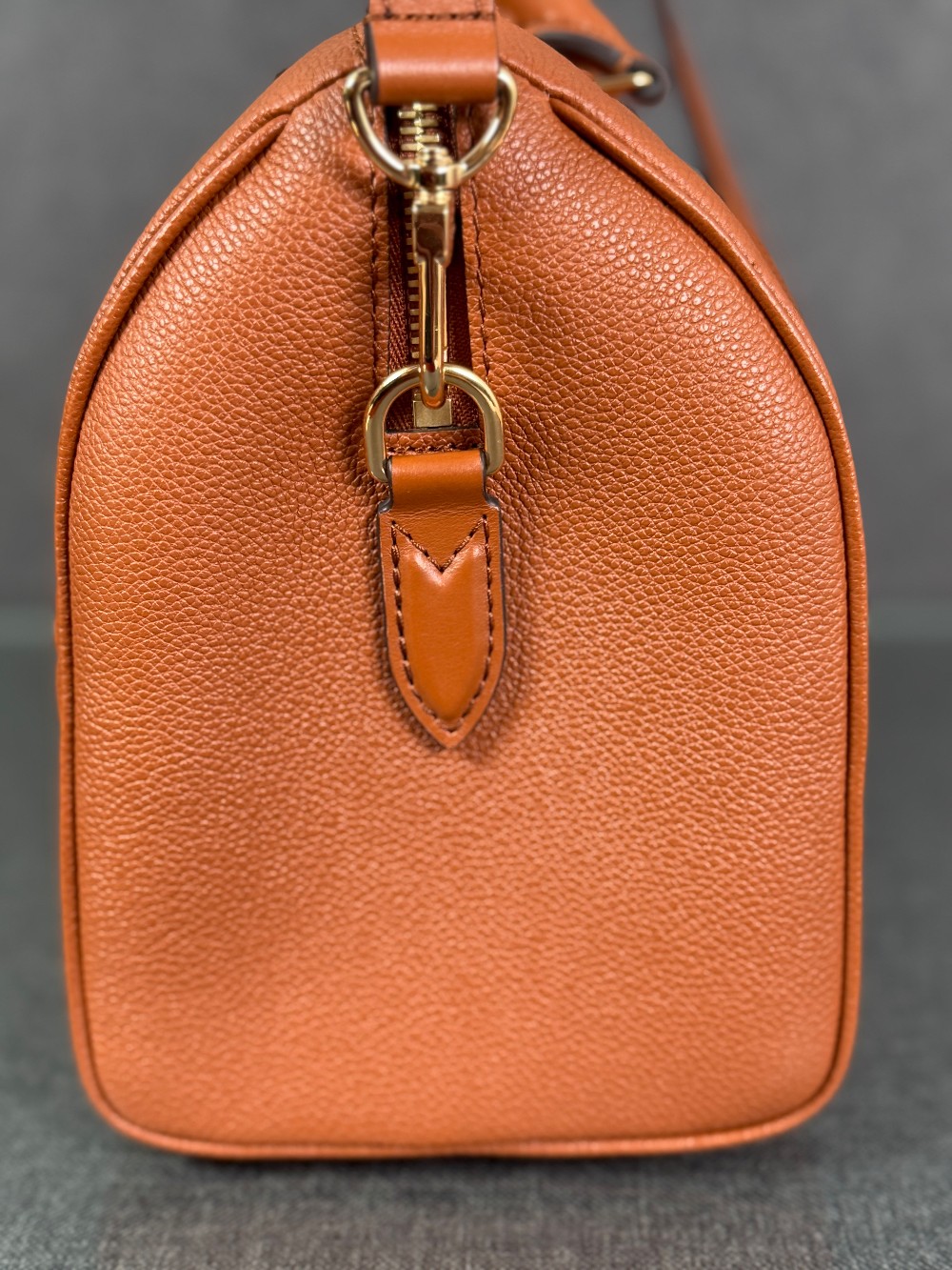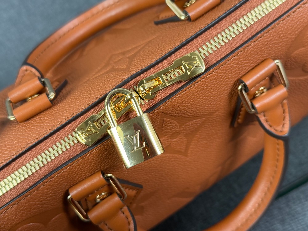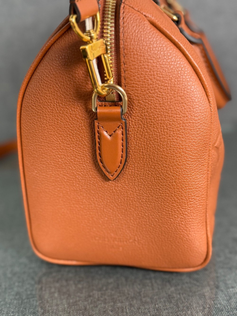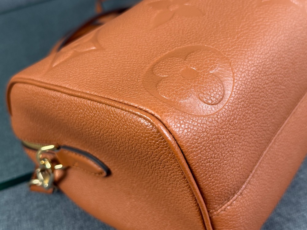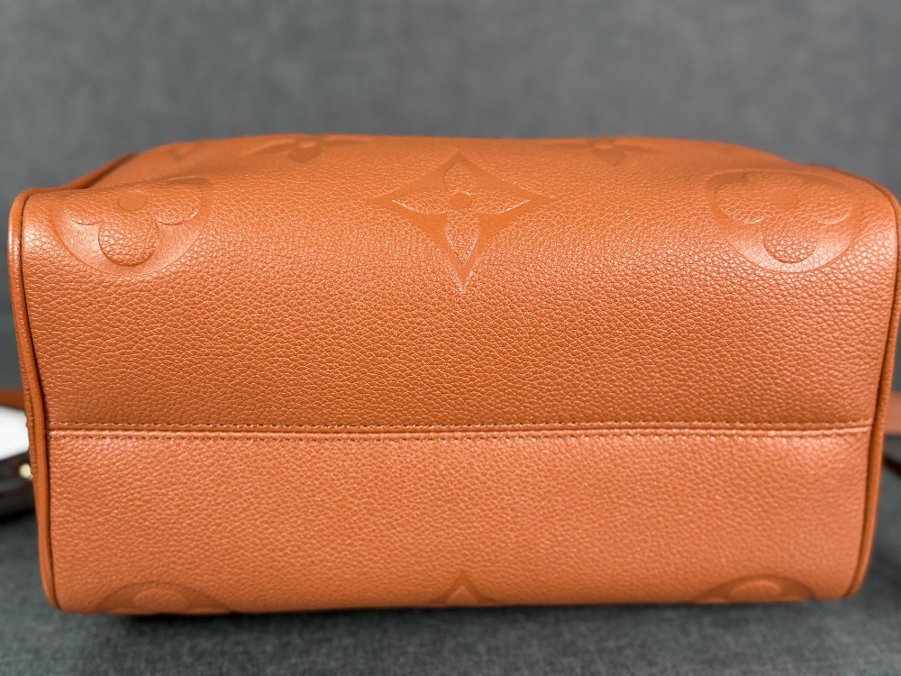 This is an authentic LOUIS VUITTON Empreinte Monogram Giant Speedy Bandouliere 25 in Cognac. This classic handbag is crafted of oversized monogram embossed cowhide leather in cognac brown. The bag features cowhide leather rolled leather top handles, an optional leather shoulder strap, and gold-toned hardware. The top zipper opens to a matching brown microfiber interior with zipper and patch pockets.