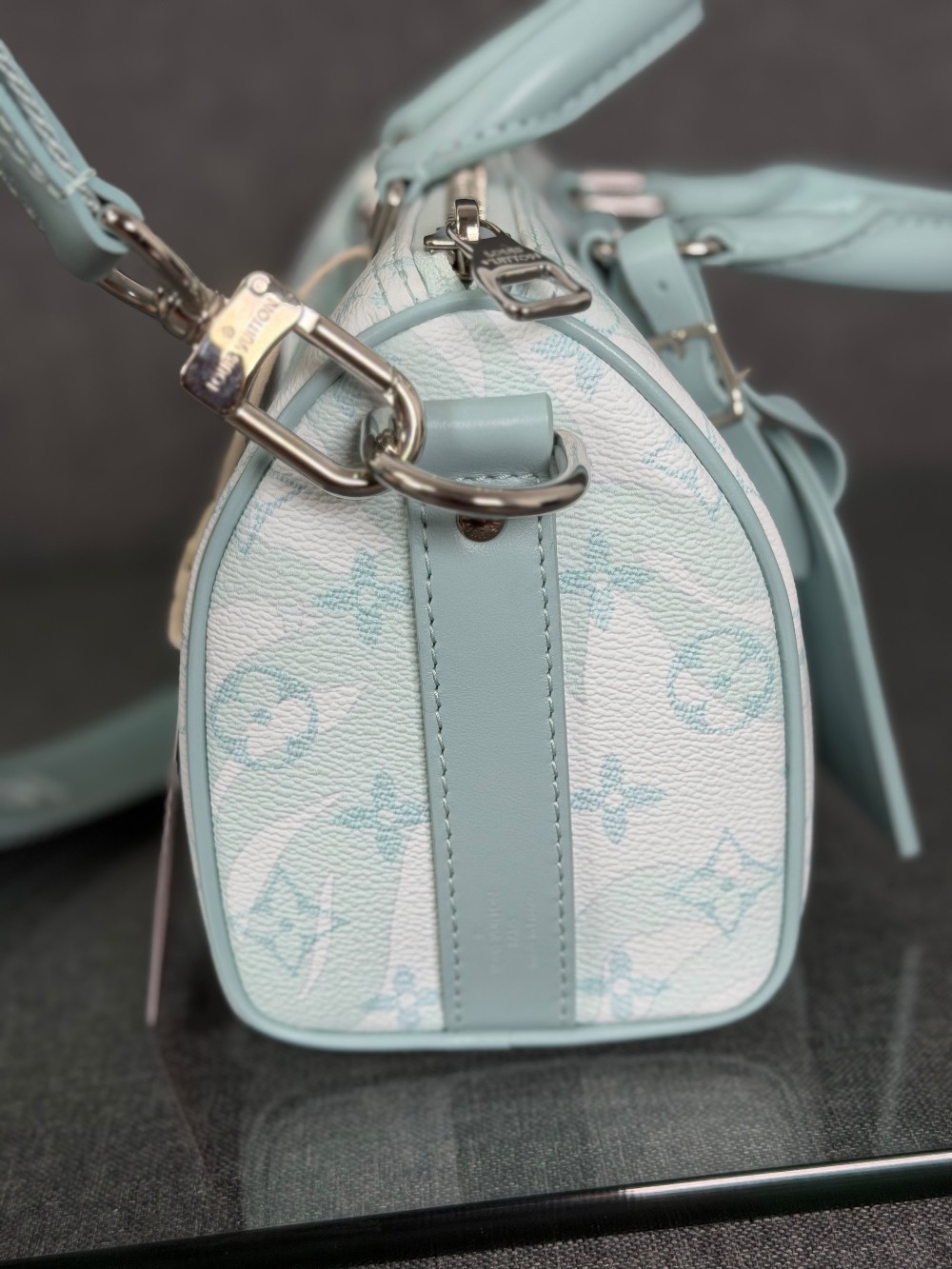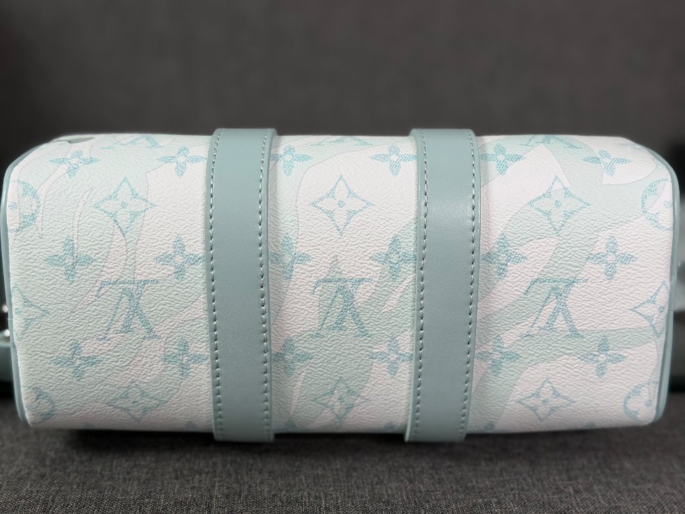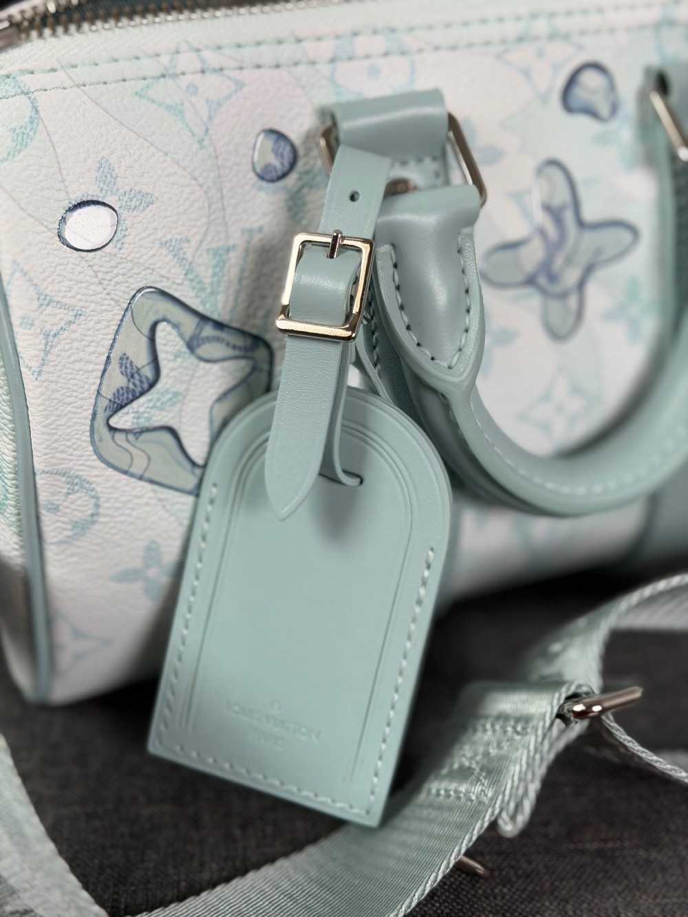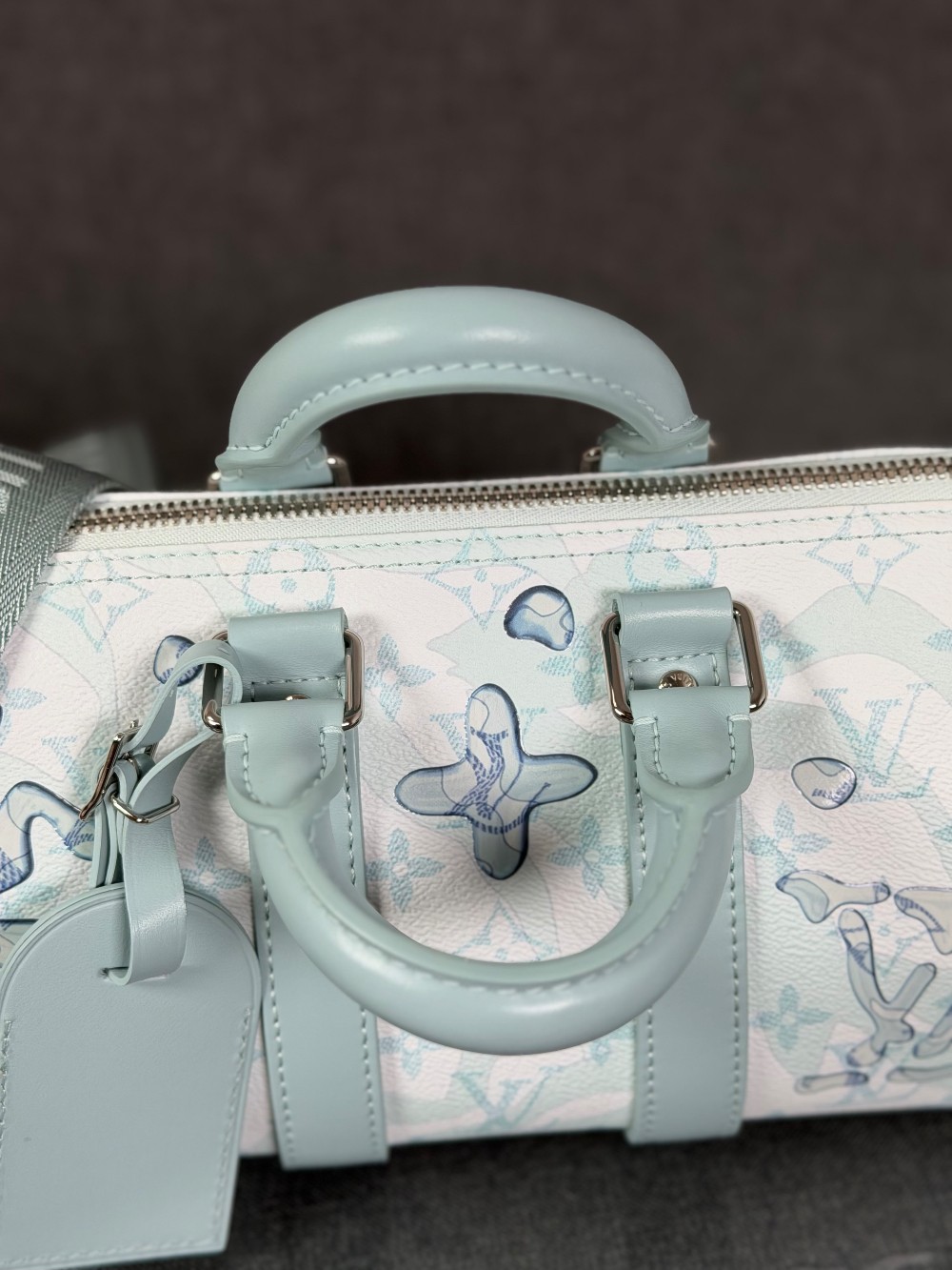 This is an authentic LOUIS VUITTON Monogram Aquagarden Keepall Bandouliere 25 in Crystal Blue. This mini bag is crafted of Louis Vuitton monogram coated canvas in blue and white with water droplet-effect accents. The bag features matching blue leather top handles and trim with an adjustable canvas shoulder strap. The top zipper opens to a matching fabric interior with a patch pocket.