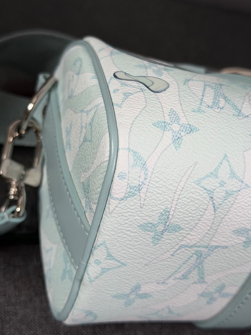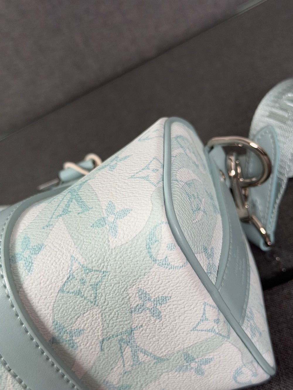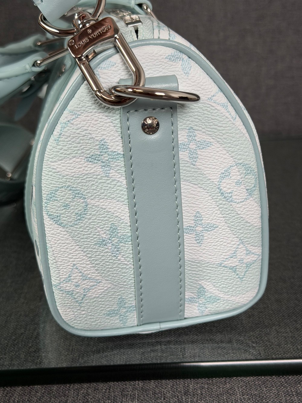 This is an authentic LOUIS VUITTON Monogram Aquagarden Keepall Bandouliere 25 in Crystal Blue. This mini bag is crafted of Louis Vuitton monogram coated canvas in blue and white with water droplet-effect accents. The bag features matching blue leather top handles and trim with an adjustable canvas shoulder strap. The top zipper opens to a matching fabric interior with a patch pocket.