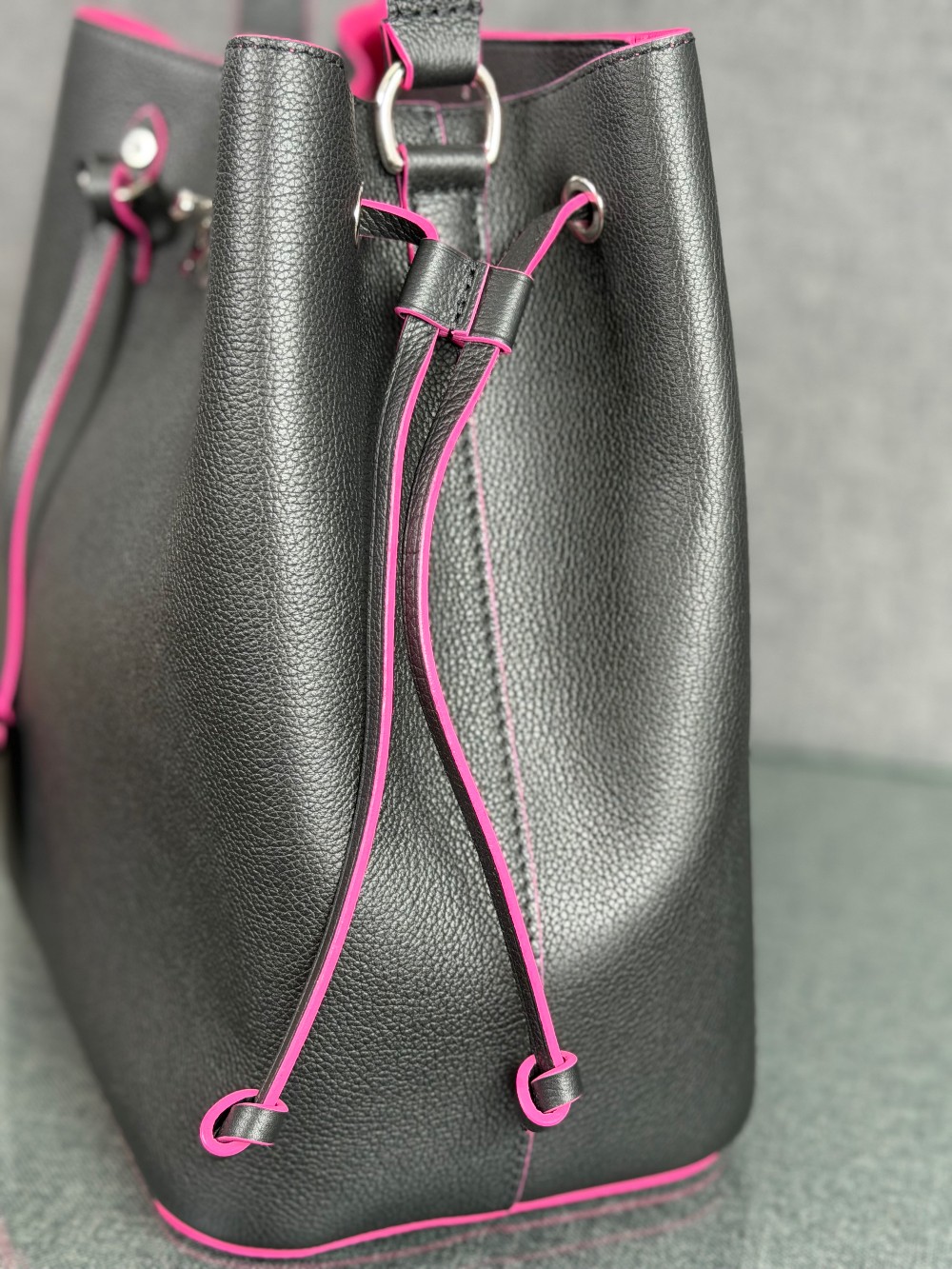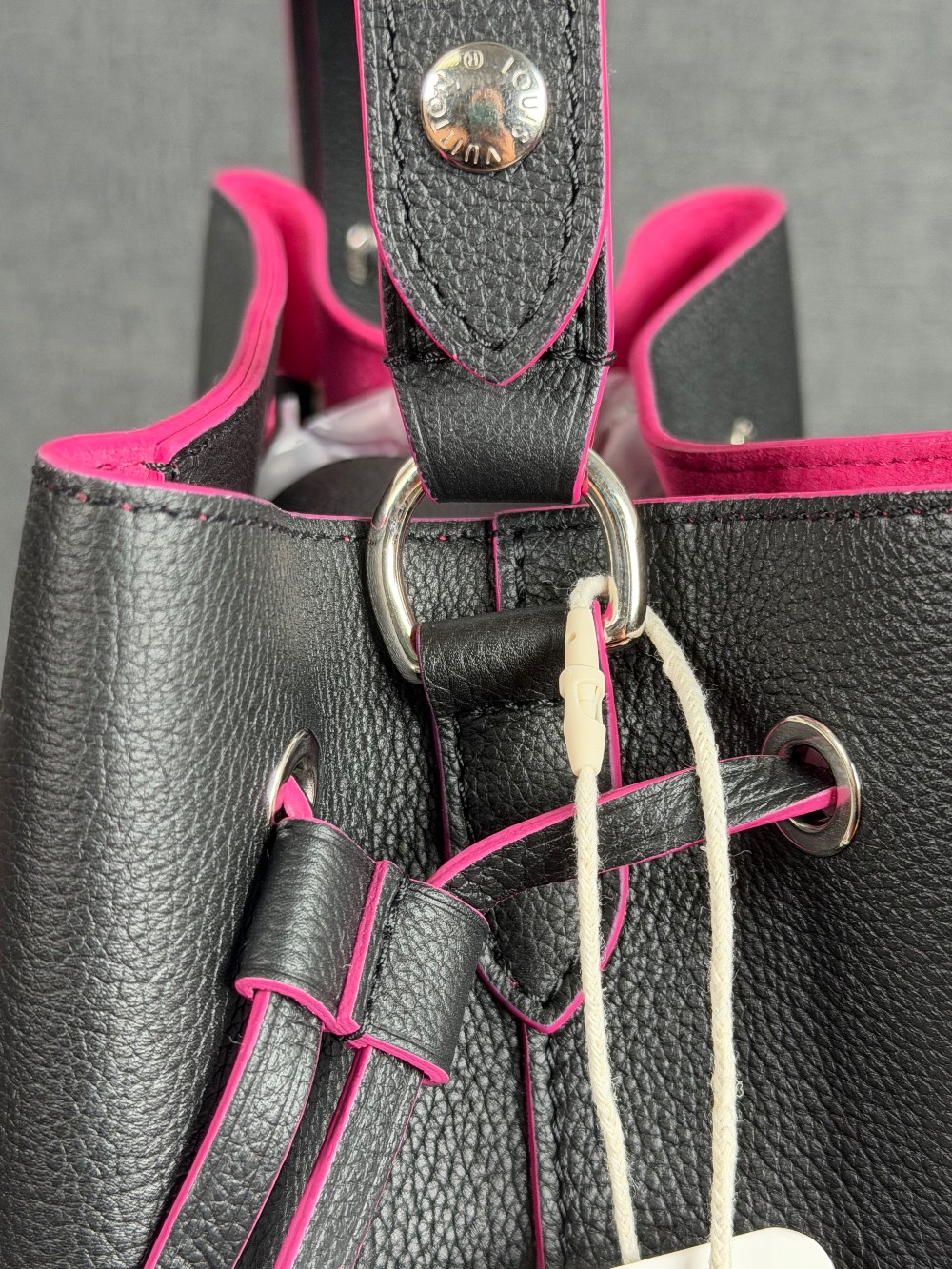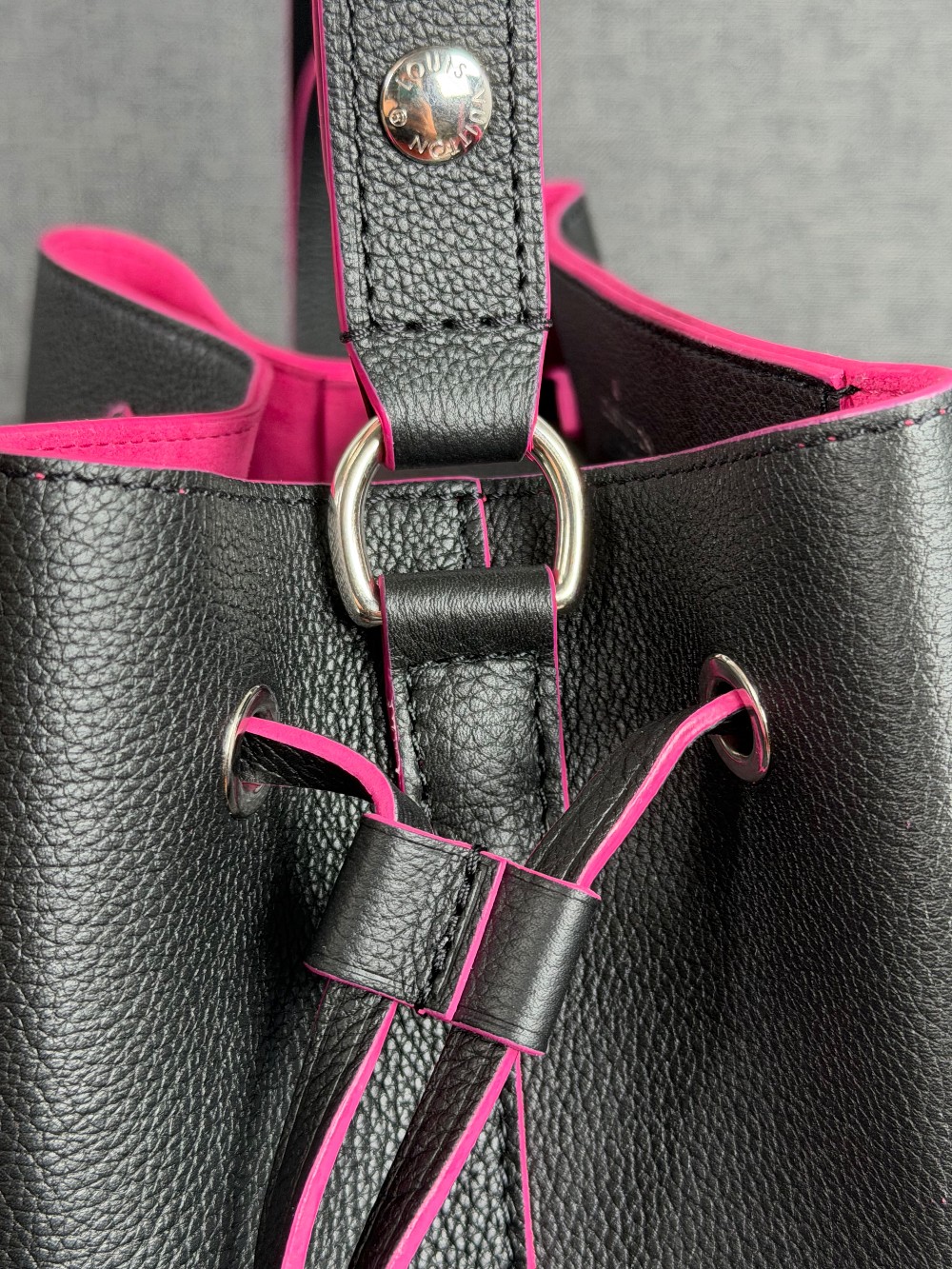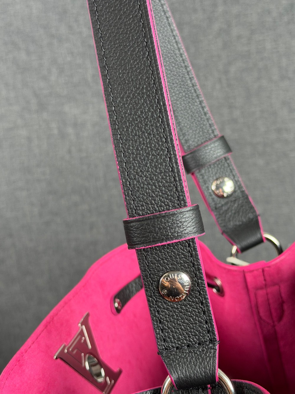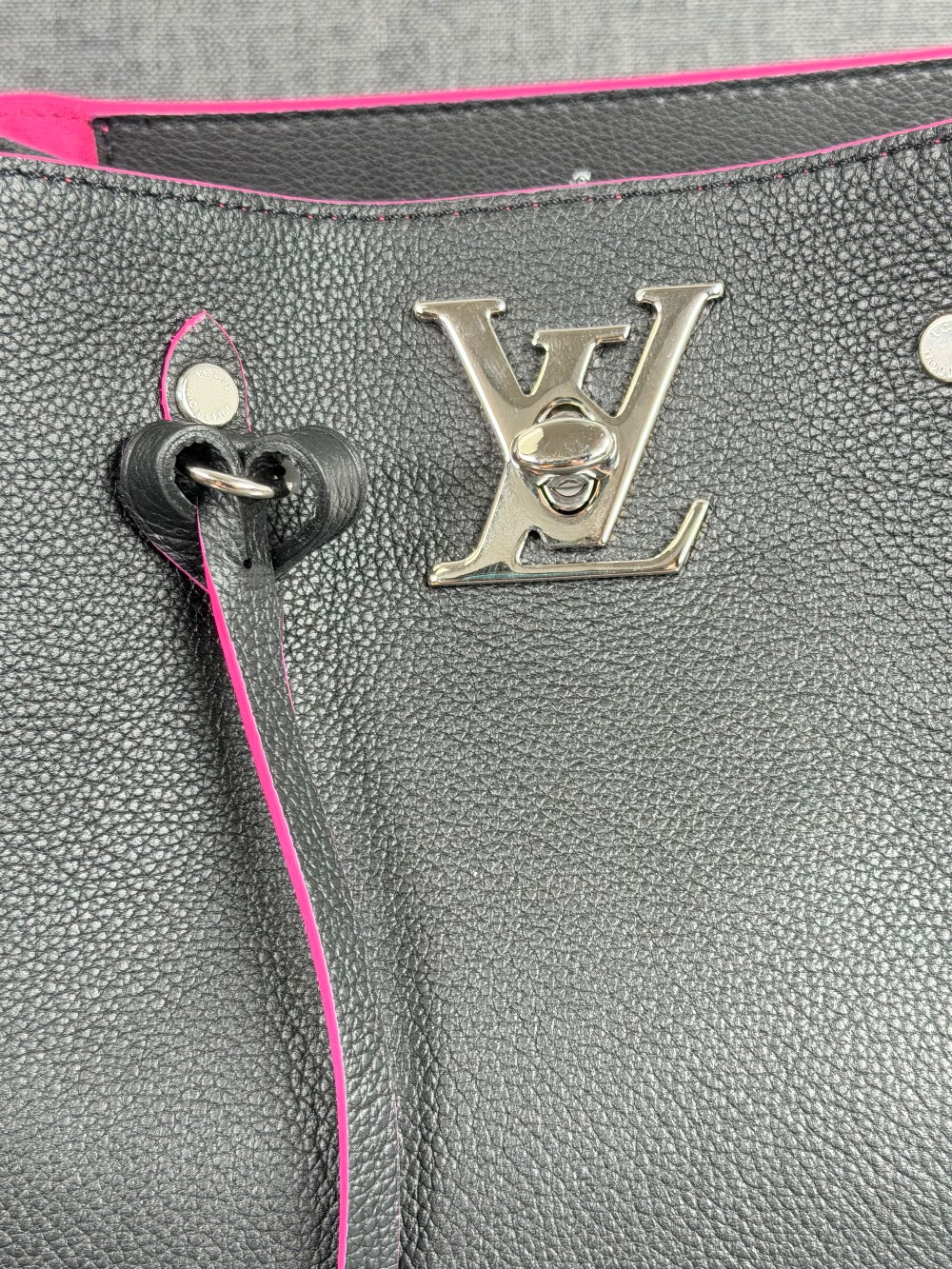 This is an authentic LOUIS VUITTON Calfskin Lockme Bucket in Black. This chic shoulder bag is crafted of textured calfskin leather in black, with vibrant pink resin glazing. The tote features an adjustable leather shoulder strap with polished silver hardware and side cinch cords. The top is open to a matching pink microfiber interior with zipper and flat pockets.