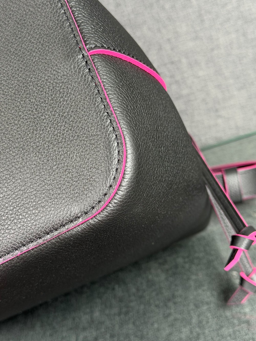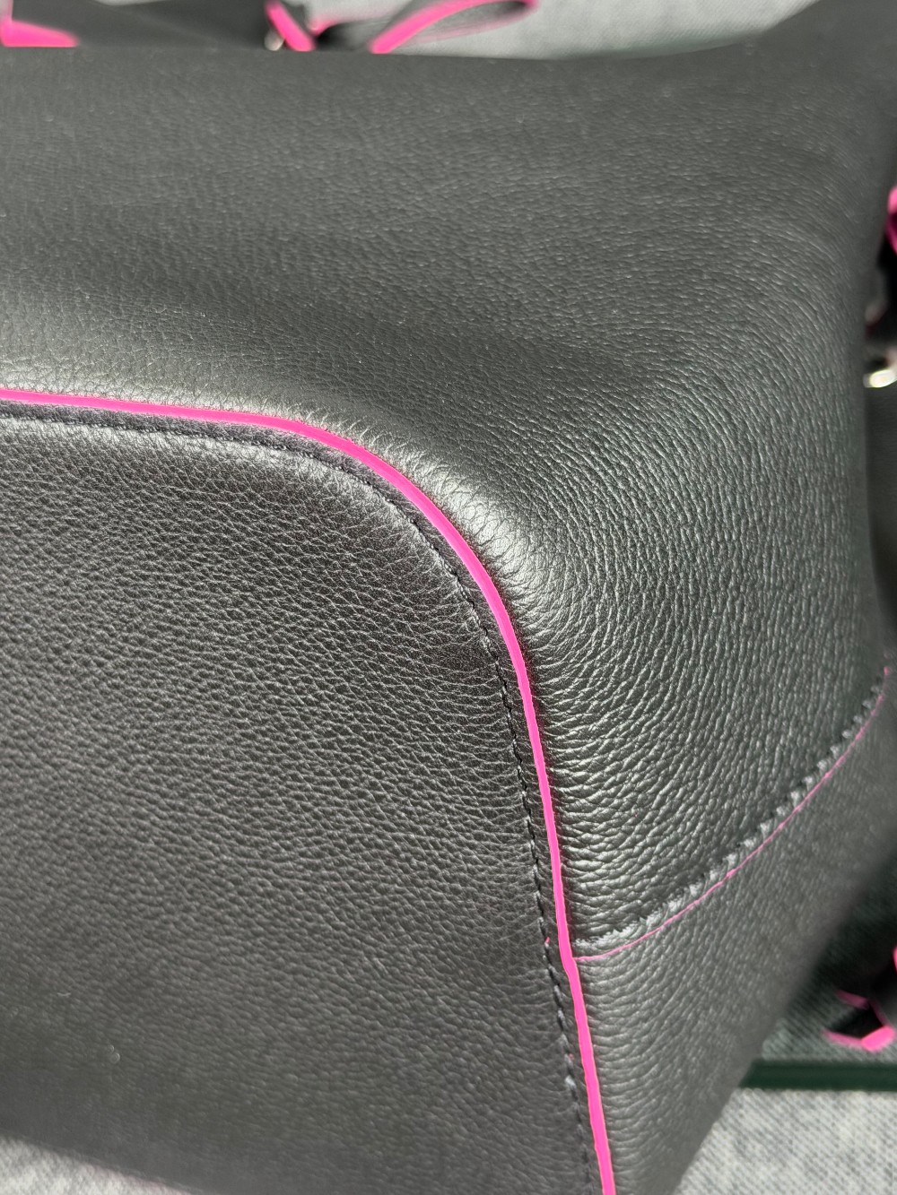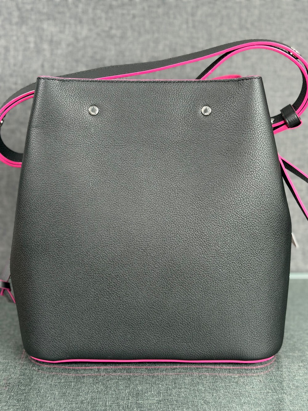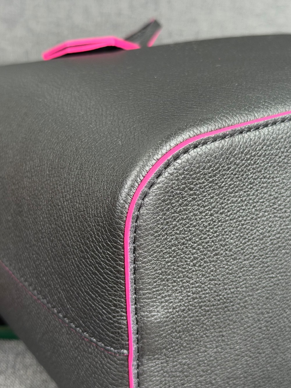 This is an authentic LOUIS VUITTON Calfskin Lockme Bucket in Black. This chic shoulder bag is crafted of textured calfskin leather in black, with vibrant pink resin glazing. The tote features an adjustable leather shoulder strap with polished silver hardware and side cinch cords. The top is open to a matching pink microfiber interior with zipper and flat pockets.