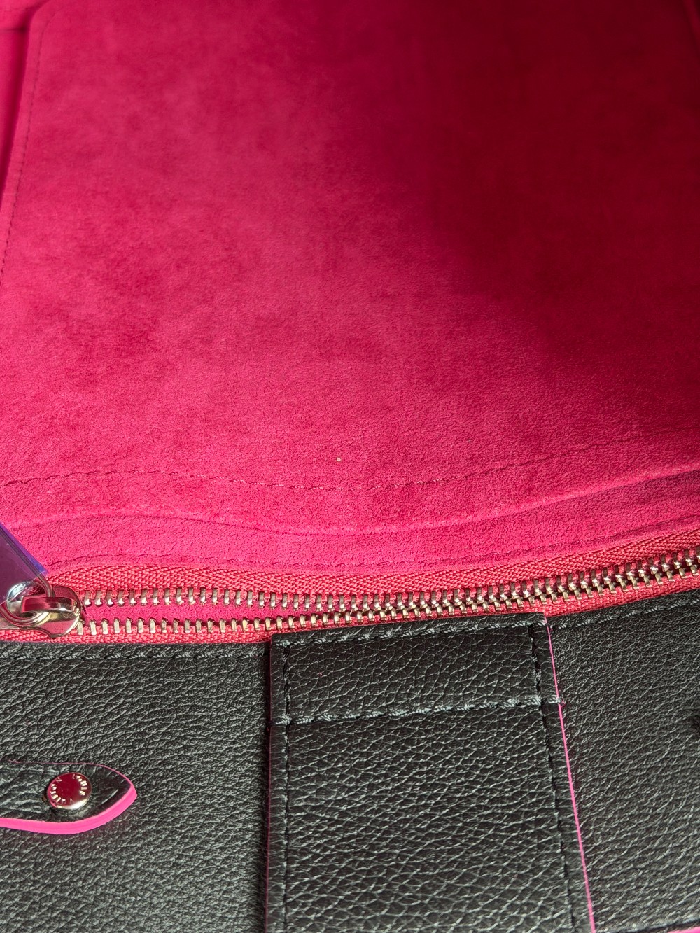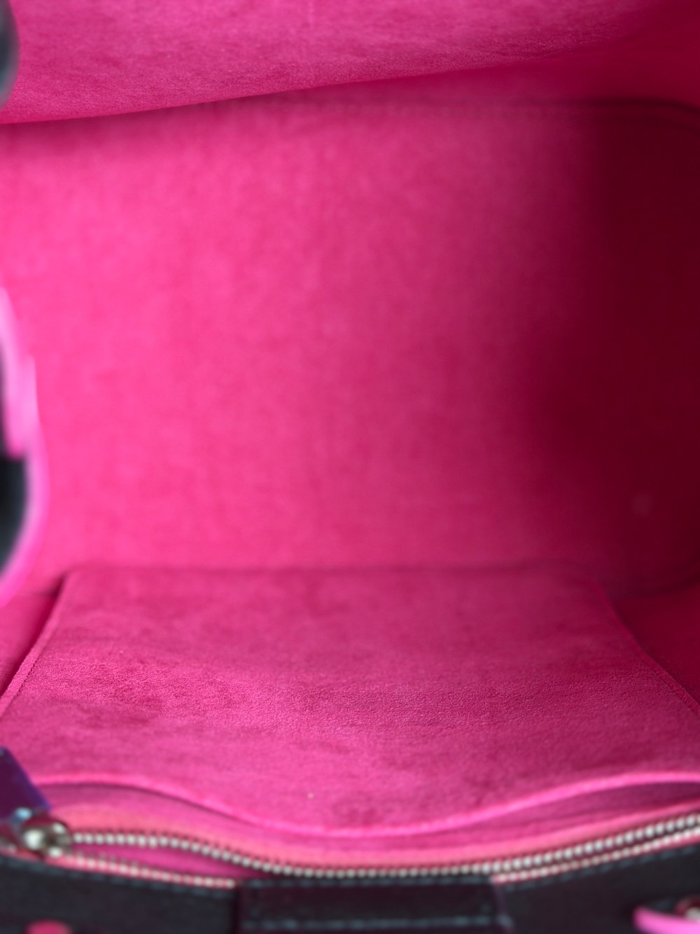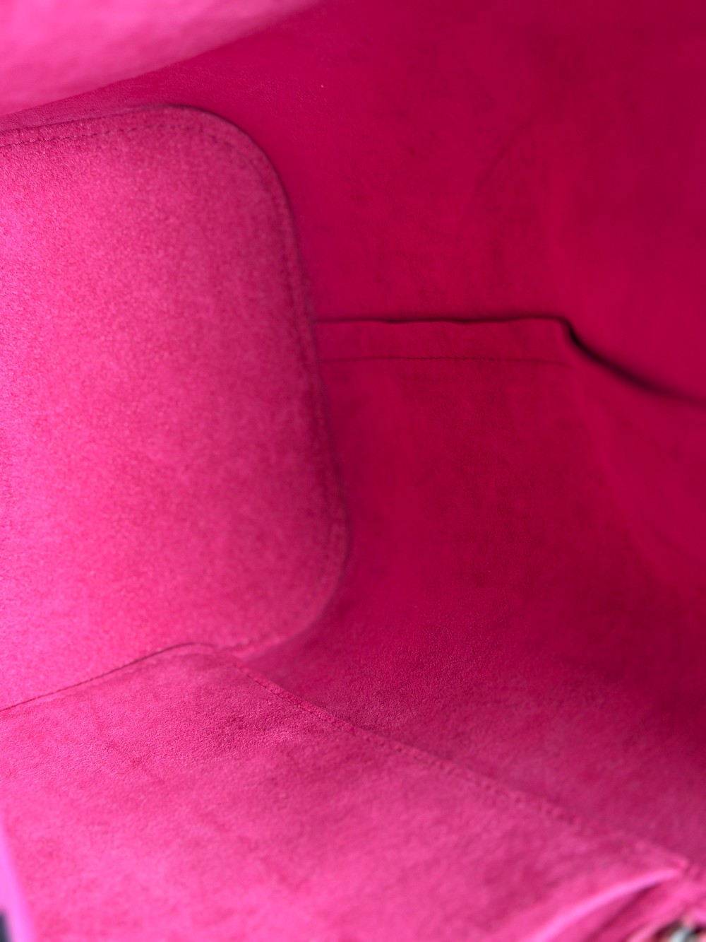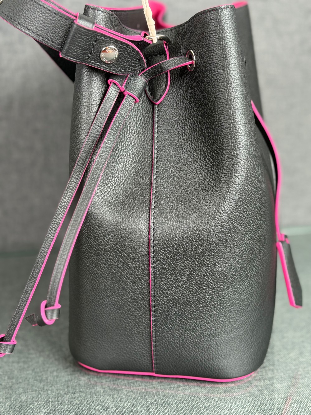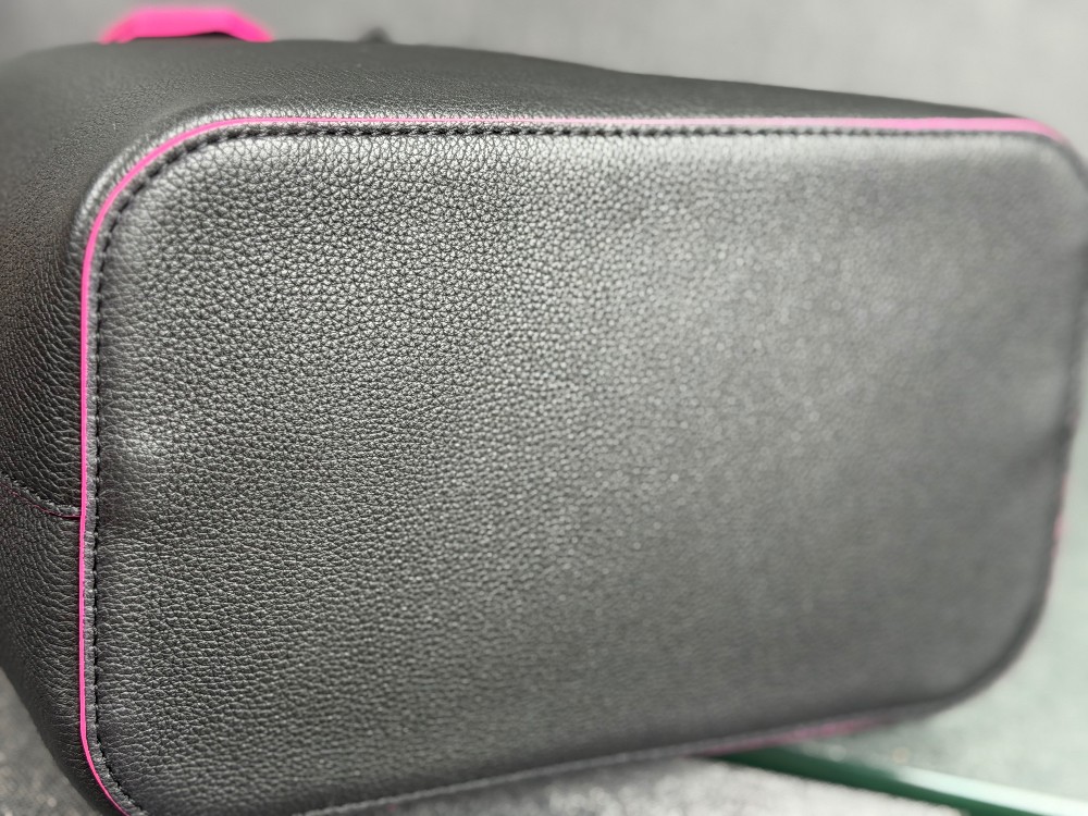 This is an authentic LOUIS VUITTON Calfskin Lockme Bucket in Black. This chic shoulder bag is crafted of textured calfskin leather in black, with vibrant pink resin glazing. The tote features an adjustable leather shoulder strap with polished silver hardware and side cinch cords. The top is open to a matching pink microfiber interior with zipper and flat pockets.