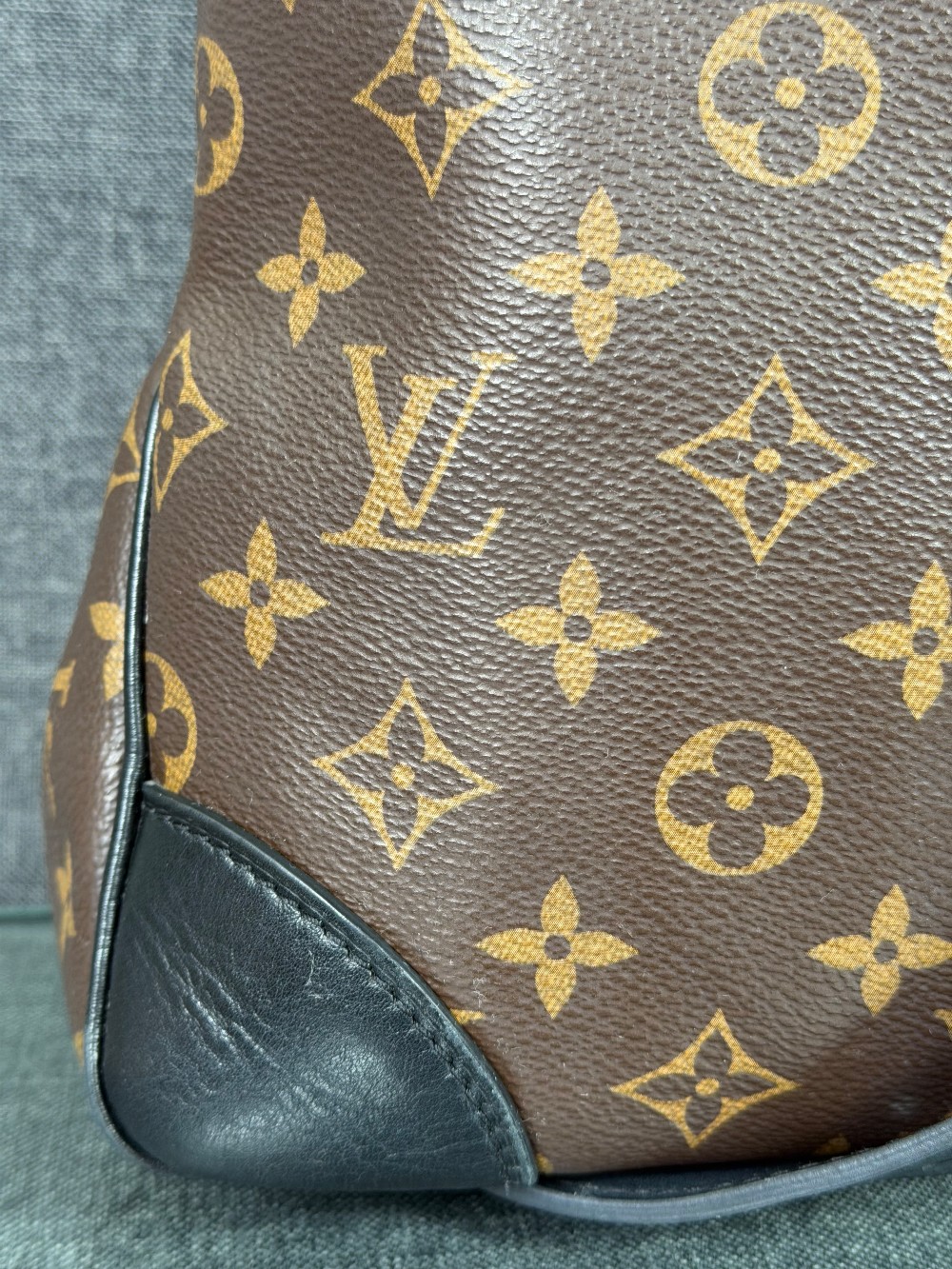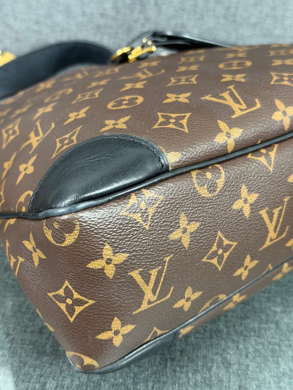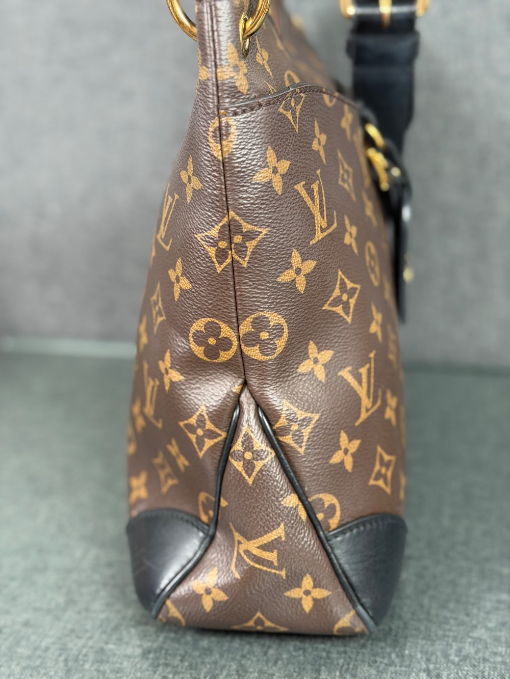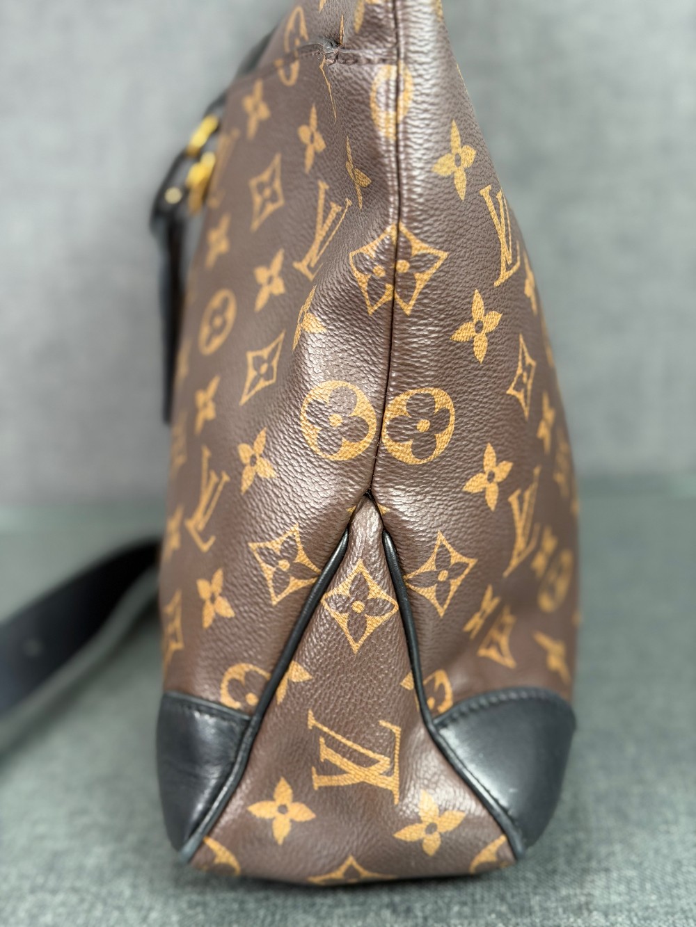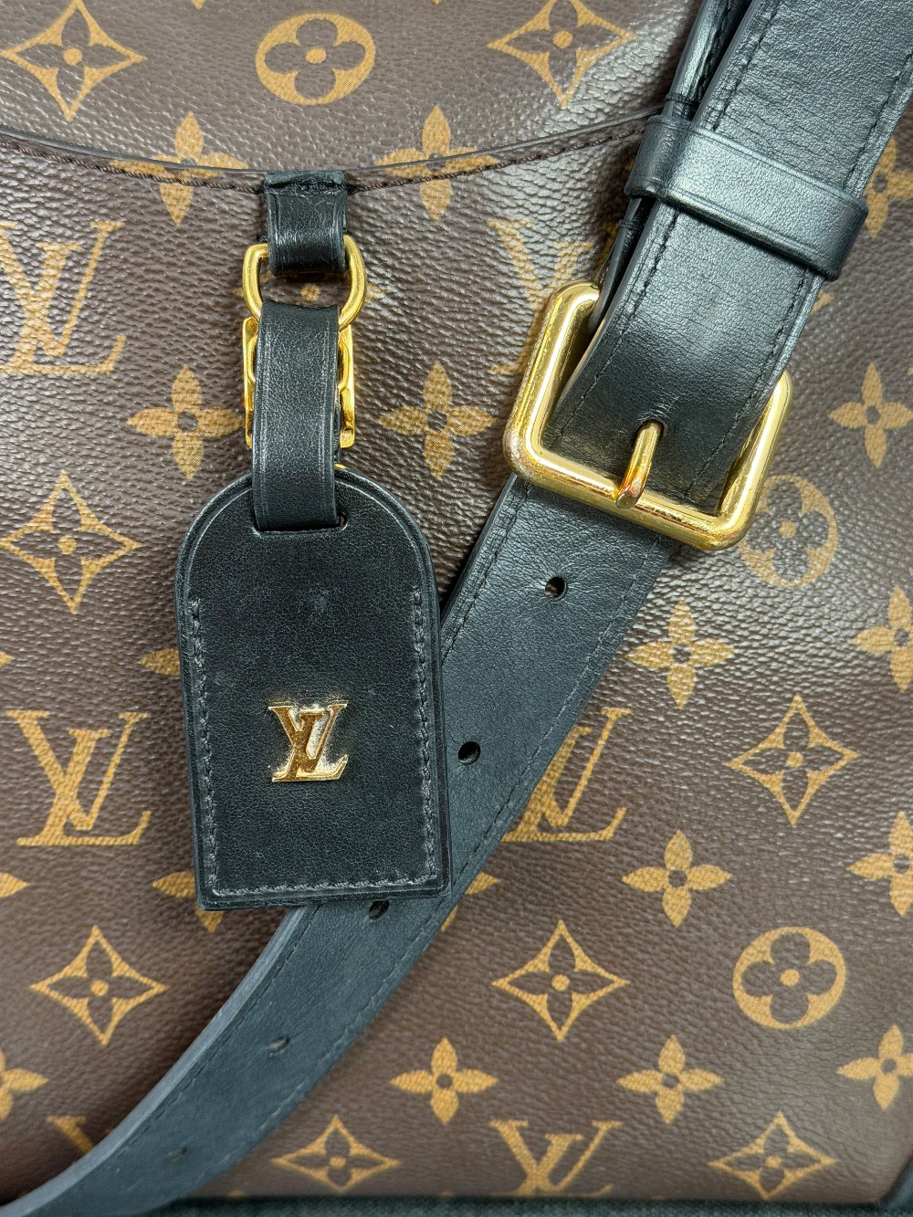 This is an authentic LOUIS VUITTON Monogram Odeon PM in Black. This stylish bag is crafted of signature Louis Vuitton monogram coated canvas with black leather trim. The bag features an adjustable shoulder strap with brass hardware and a flat front pocket for extra storage. The top zipper opens to a black fabric interior with a patch pocket.