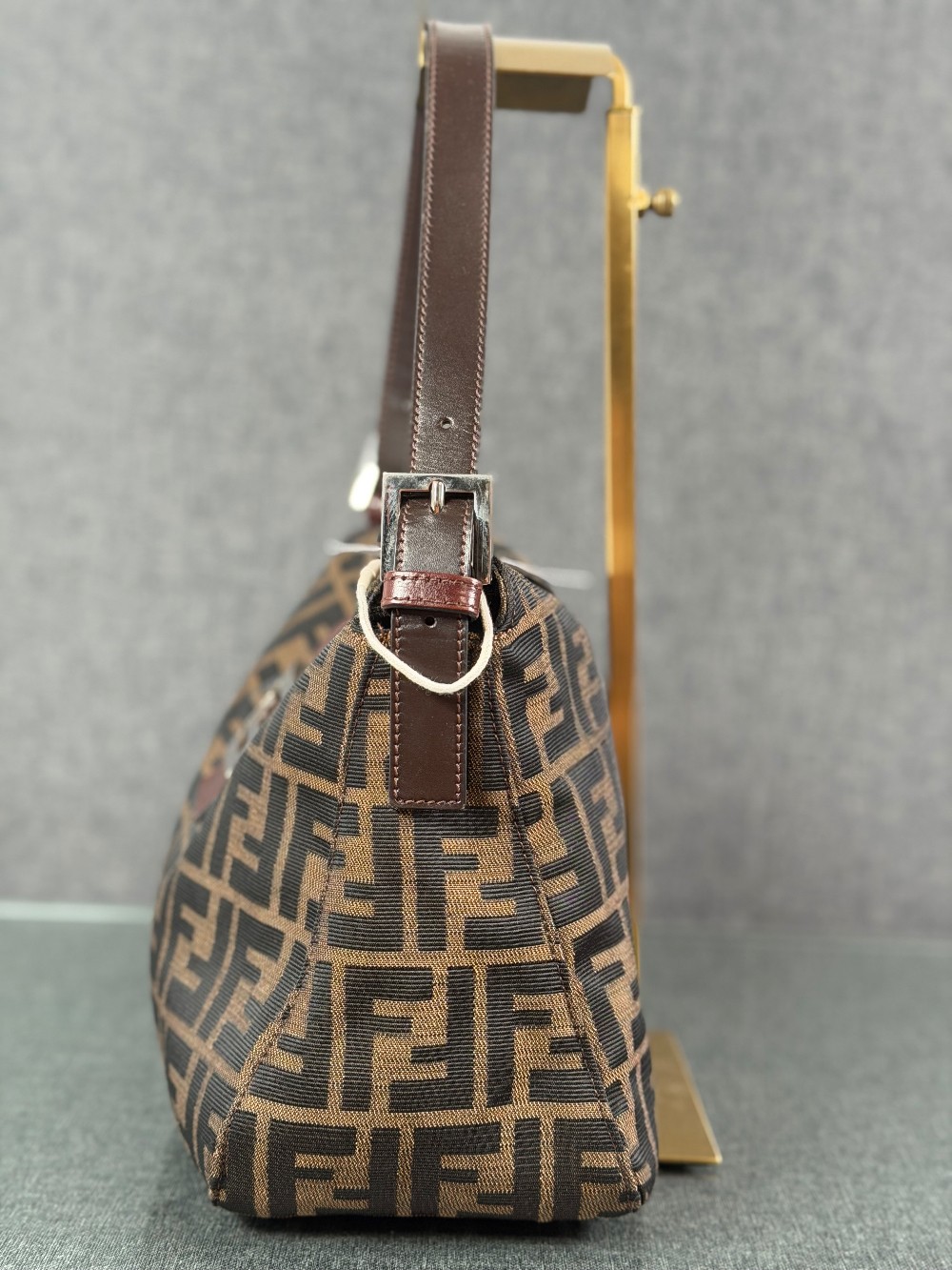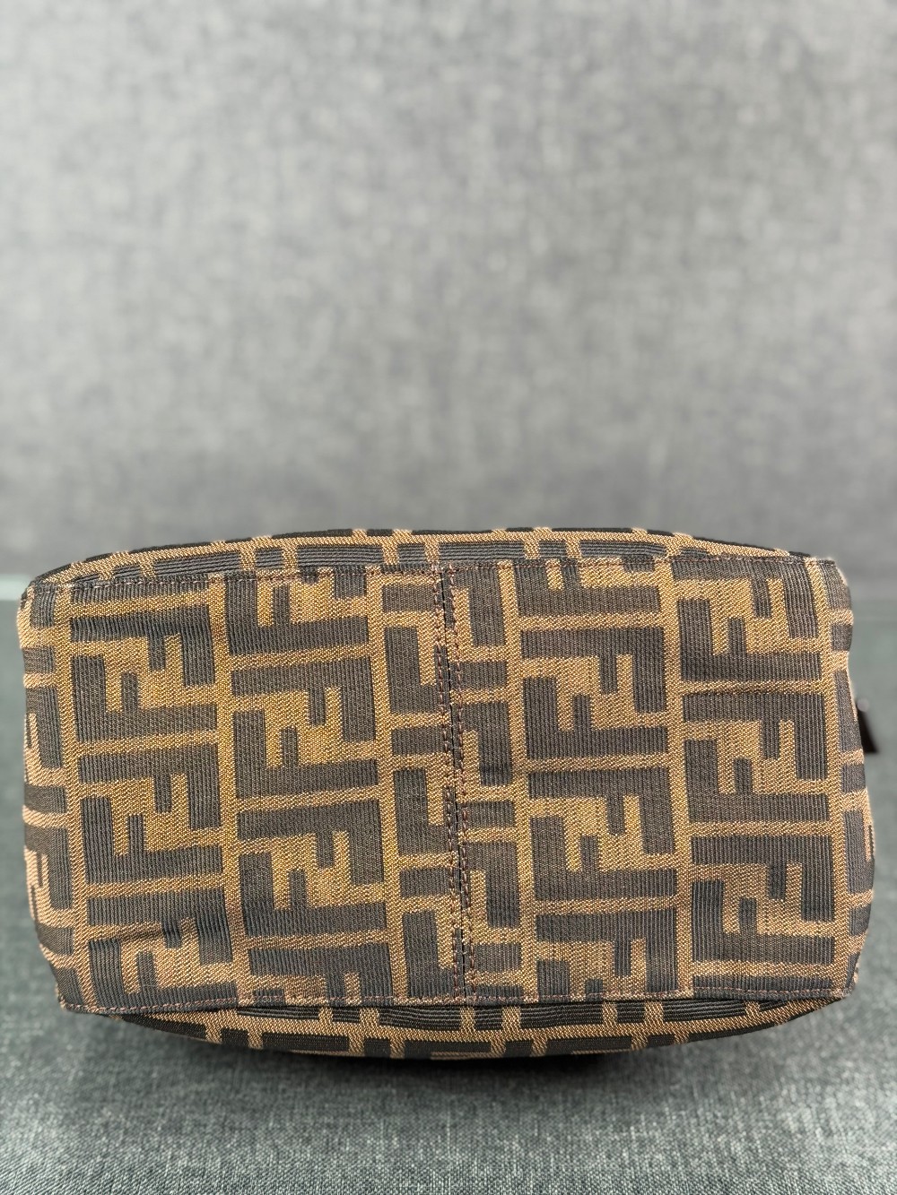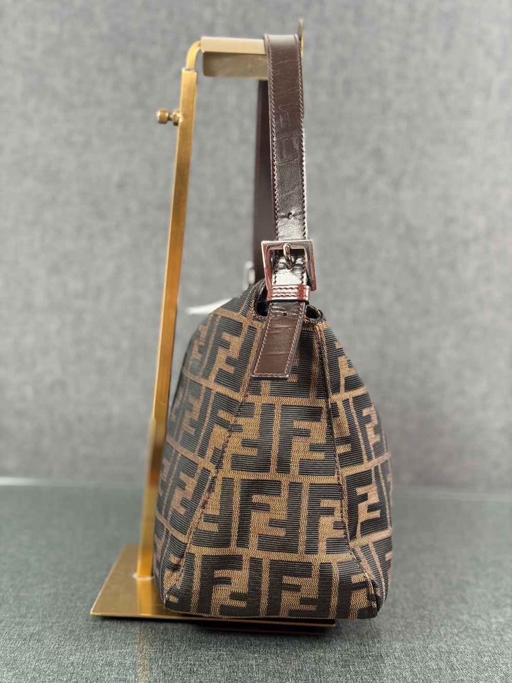 This is an authentic FENDI Zucca Shoulder Bag in Brown. This chic shoulder bag is finely crafted of Fendi FF Zucca canvas in dark brown. The bag features an adjustable brown leather shoulder strap and silver hardware. The top opens to a brown logo jacquard interior with a zipper pocket.