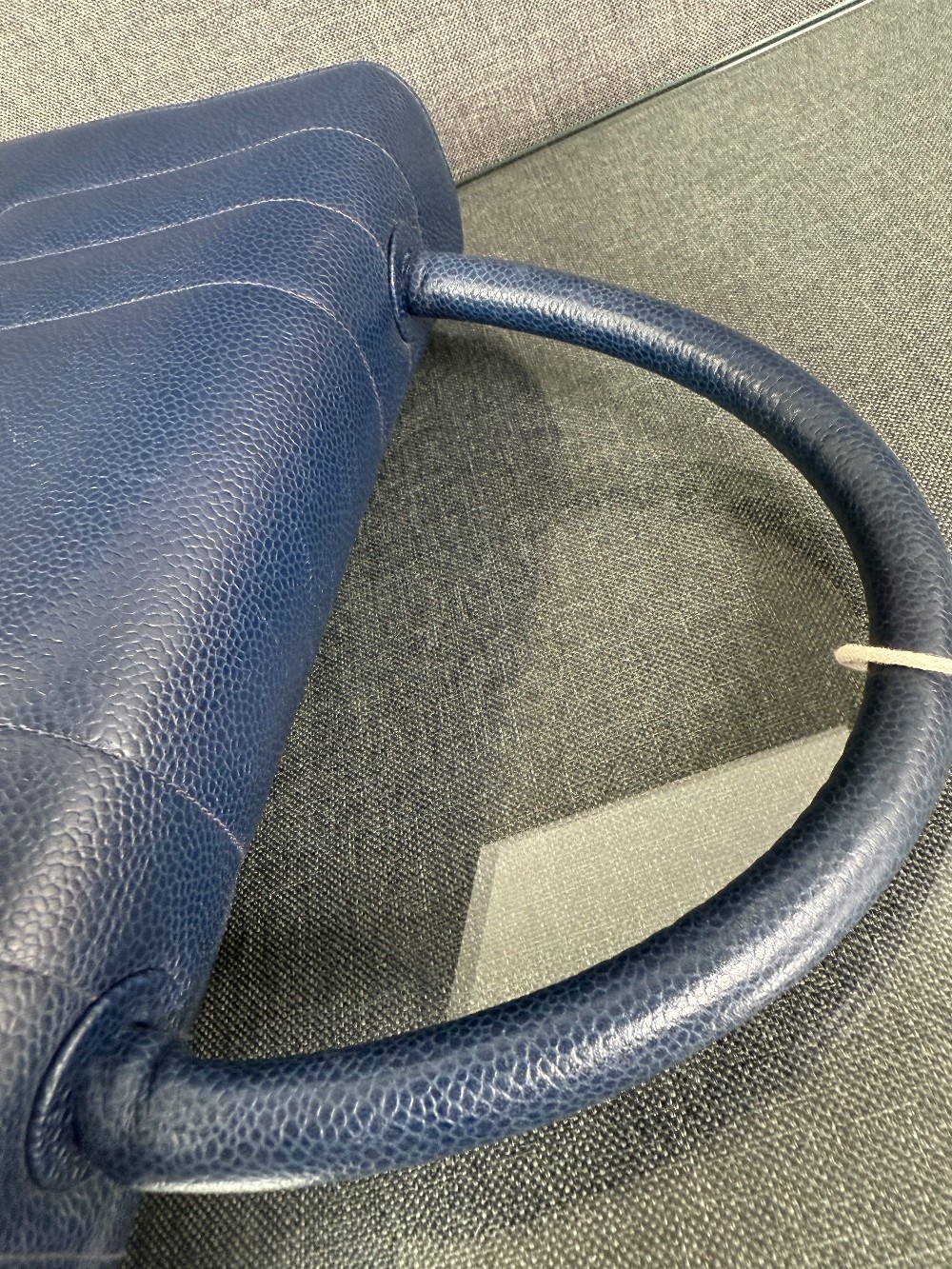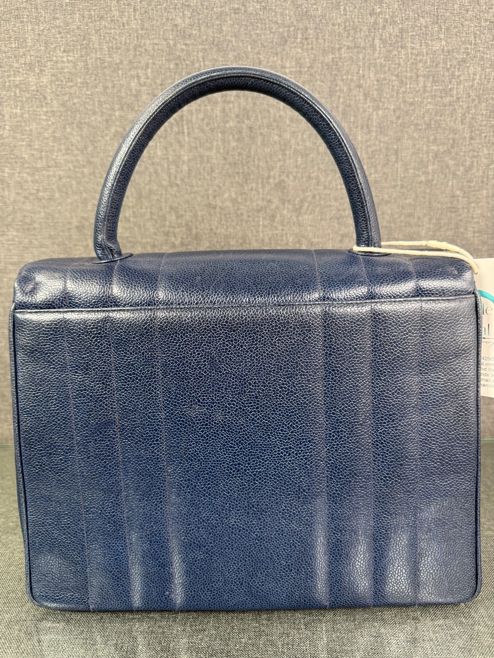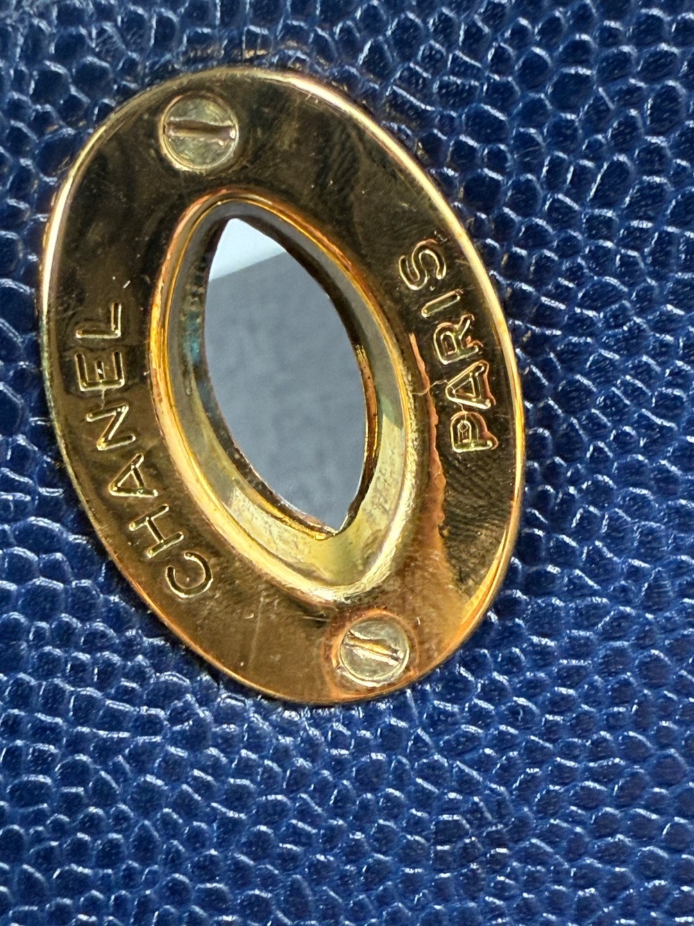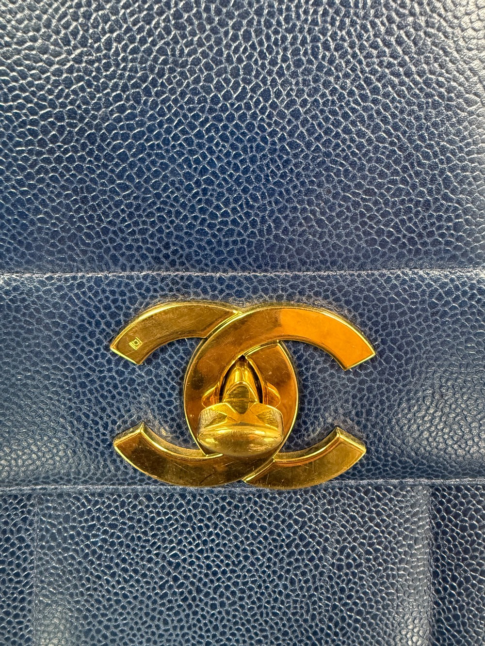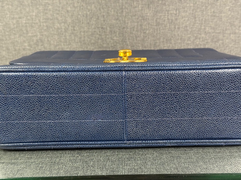 This is an authentic vintage Chanel Kelly top handle bag made of blue caviar leather with 24 K gold-plated hardware.