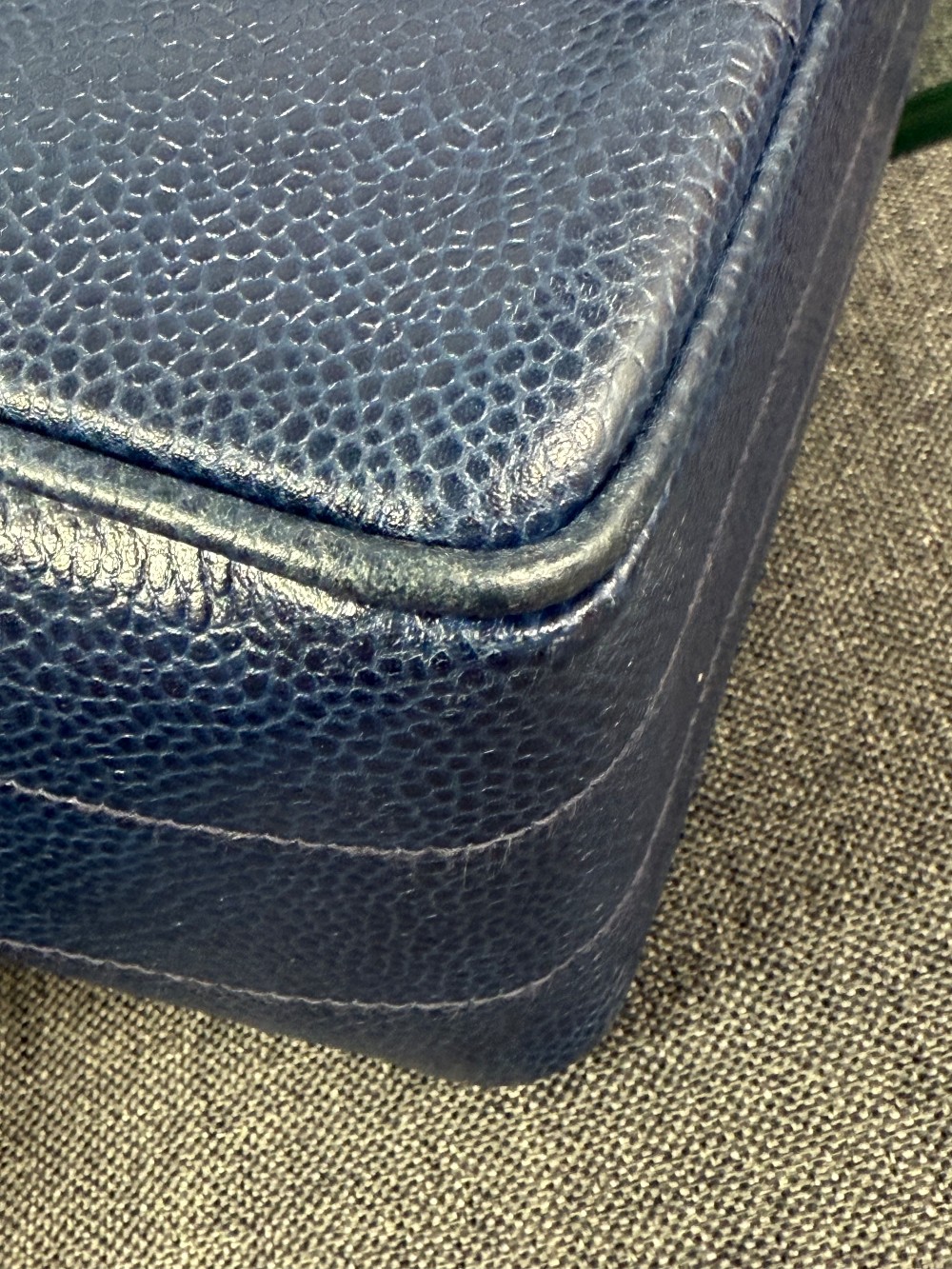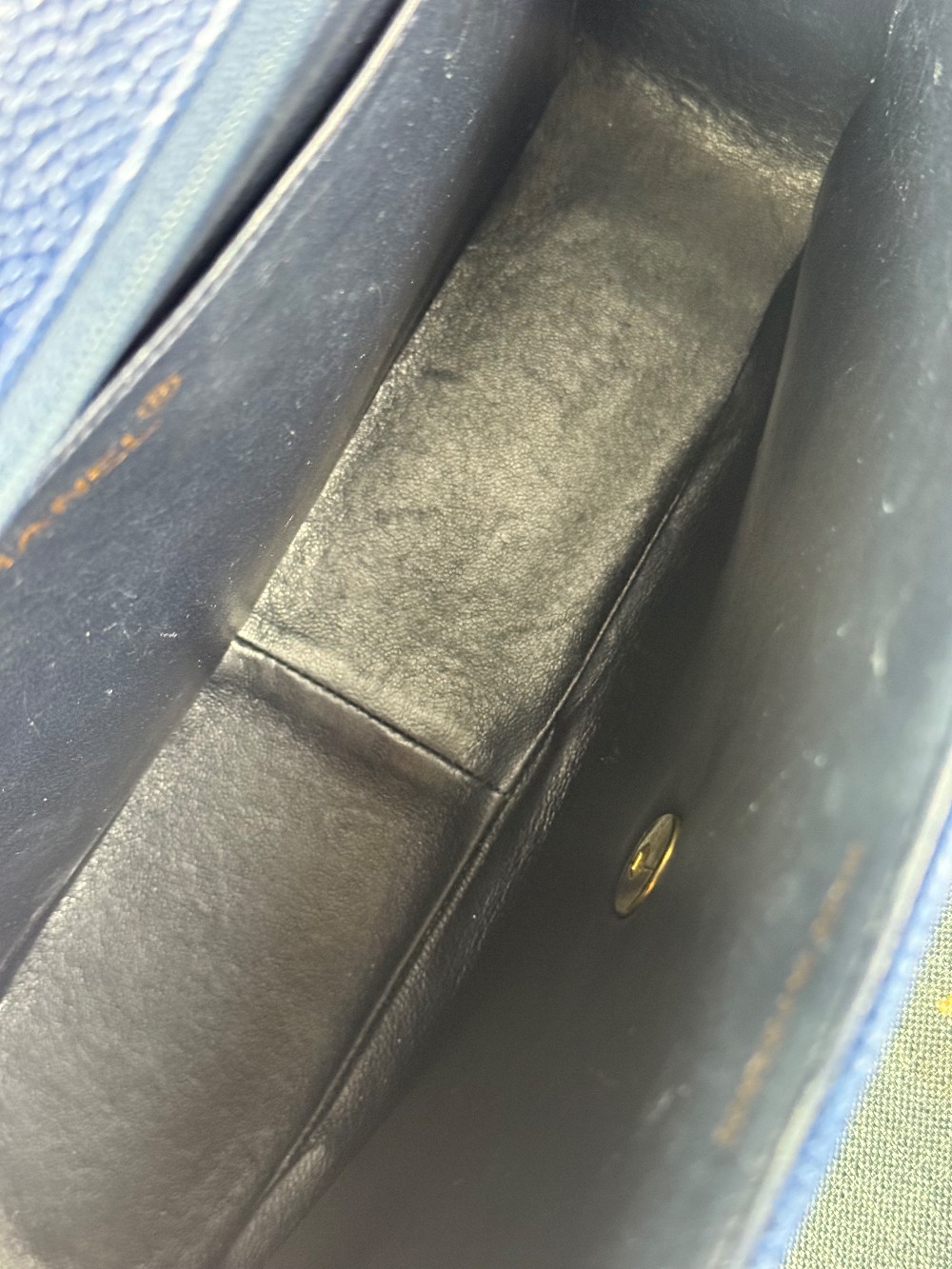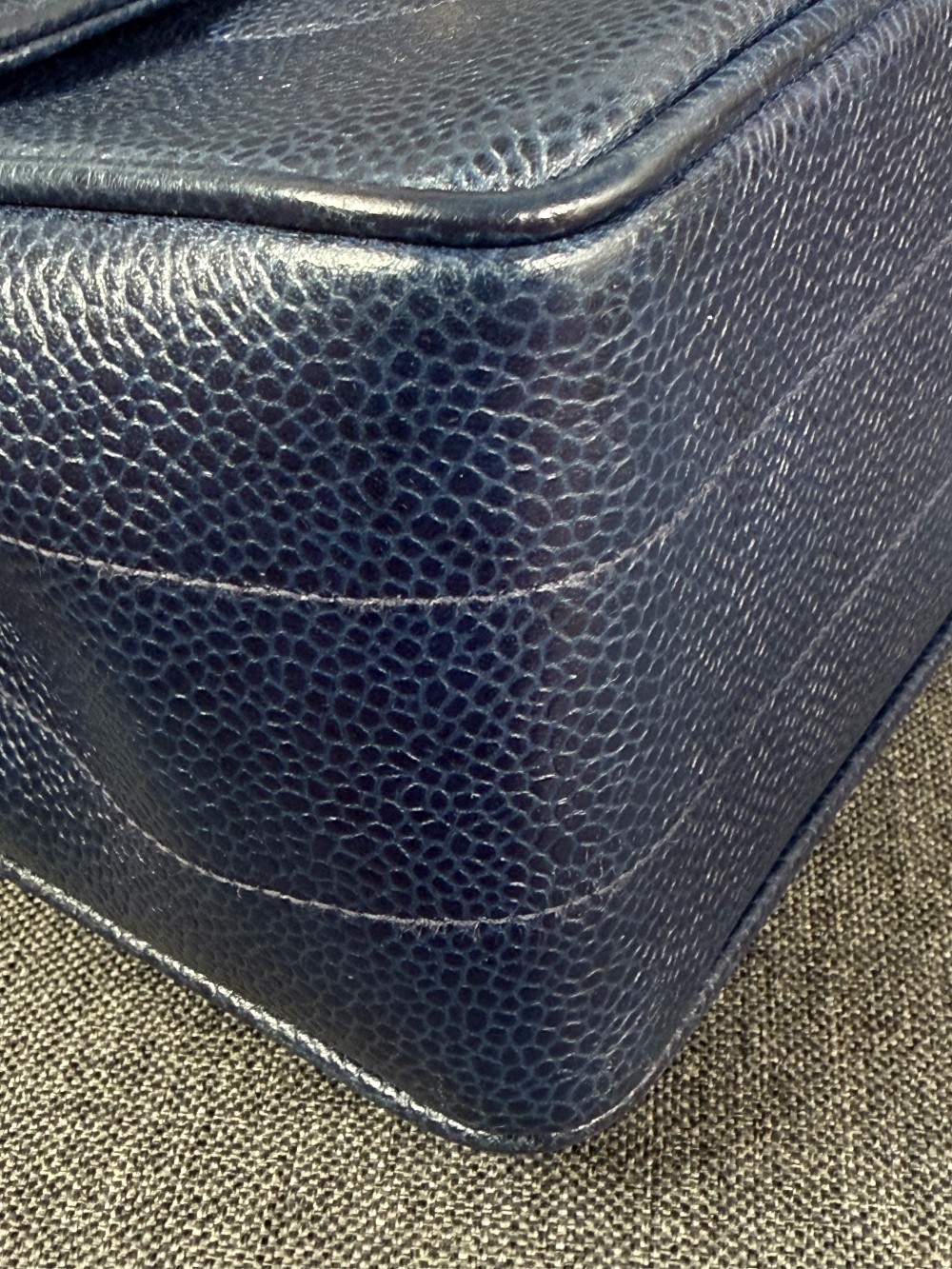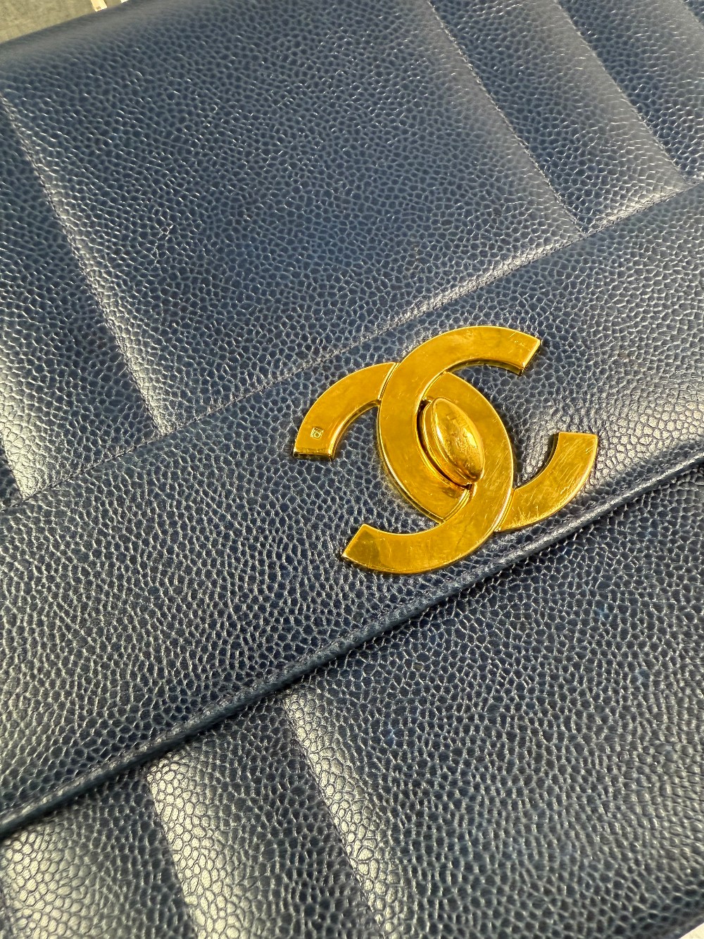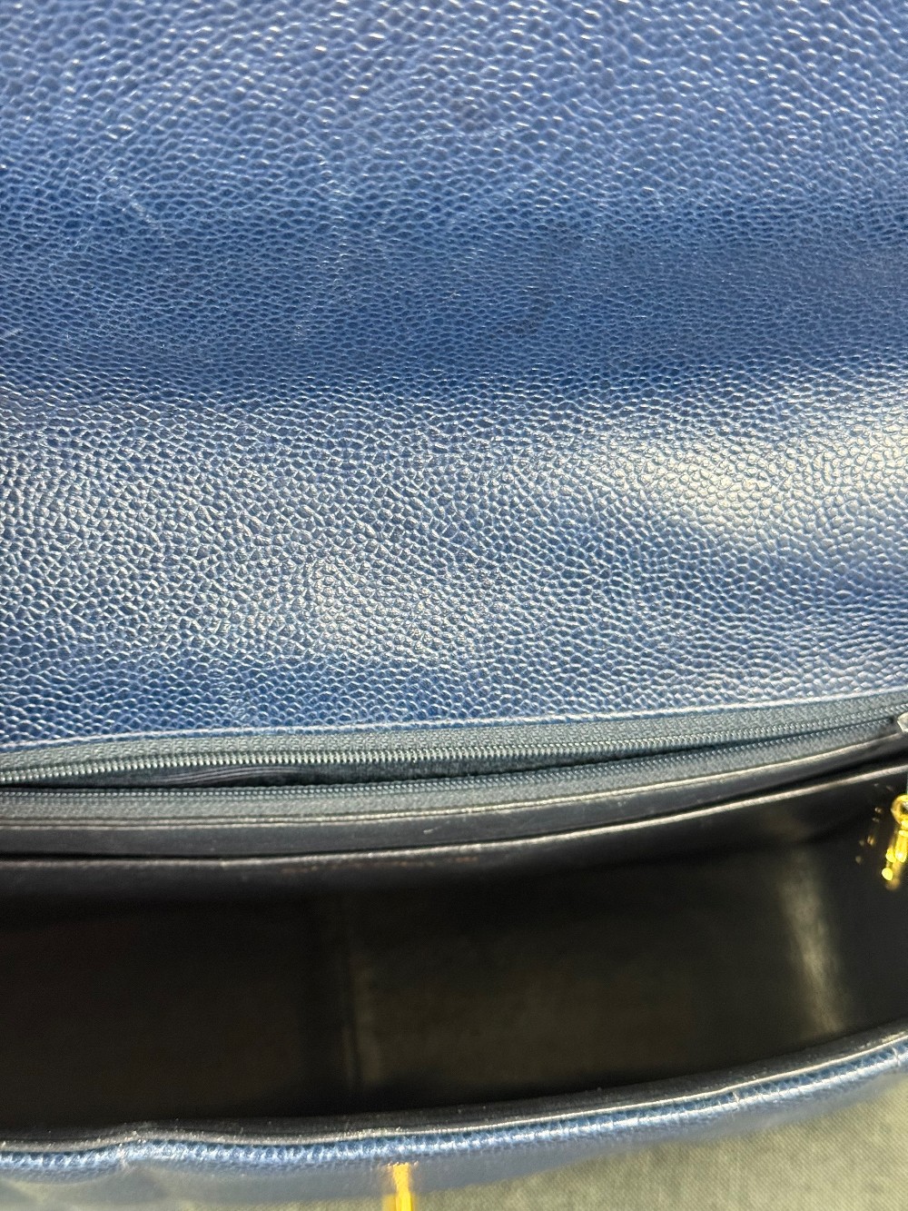 This is an authentic vintage Chanel Kelly top handle bag made of blue caviar leather with 24 K gold-plated hardware.