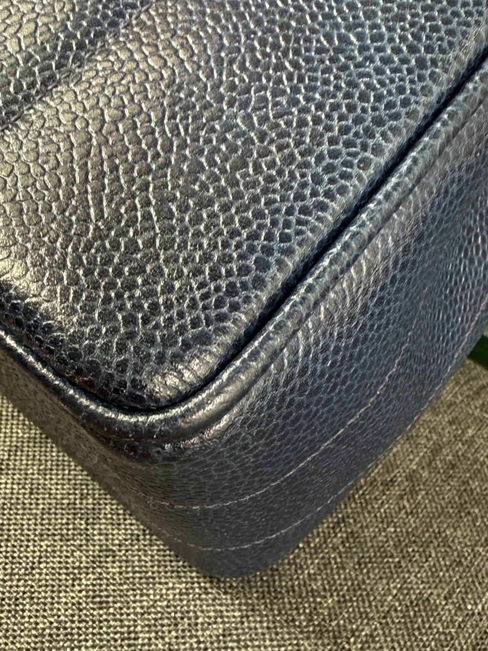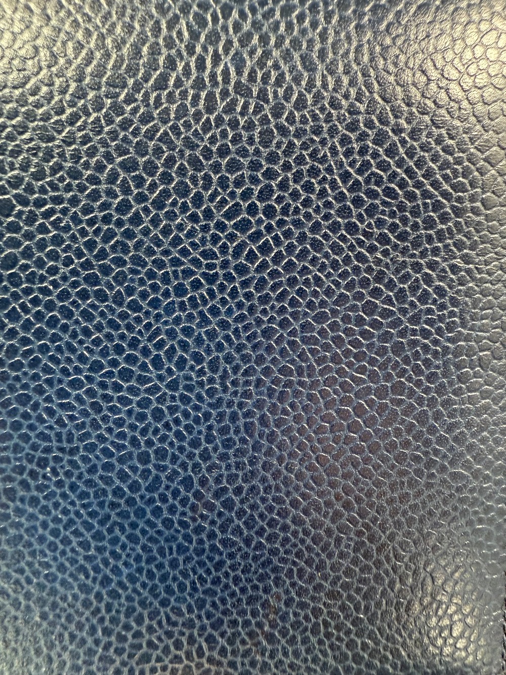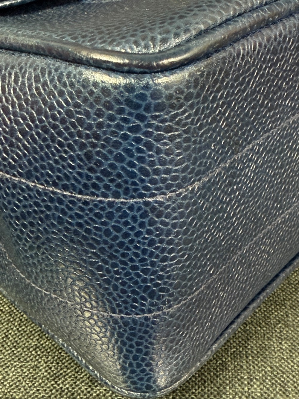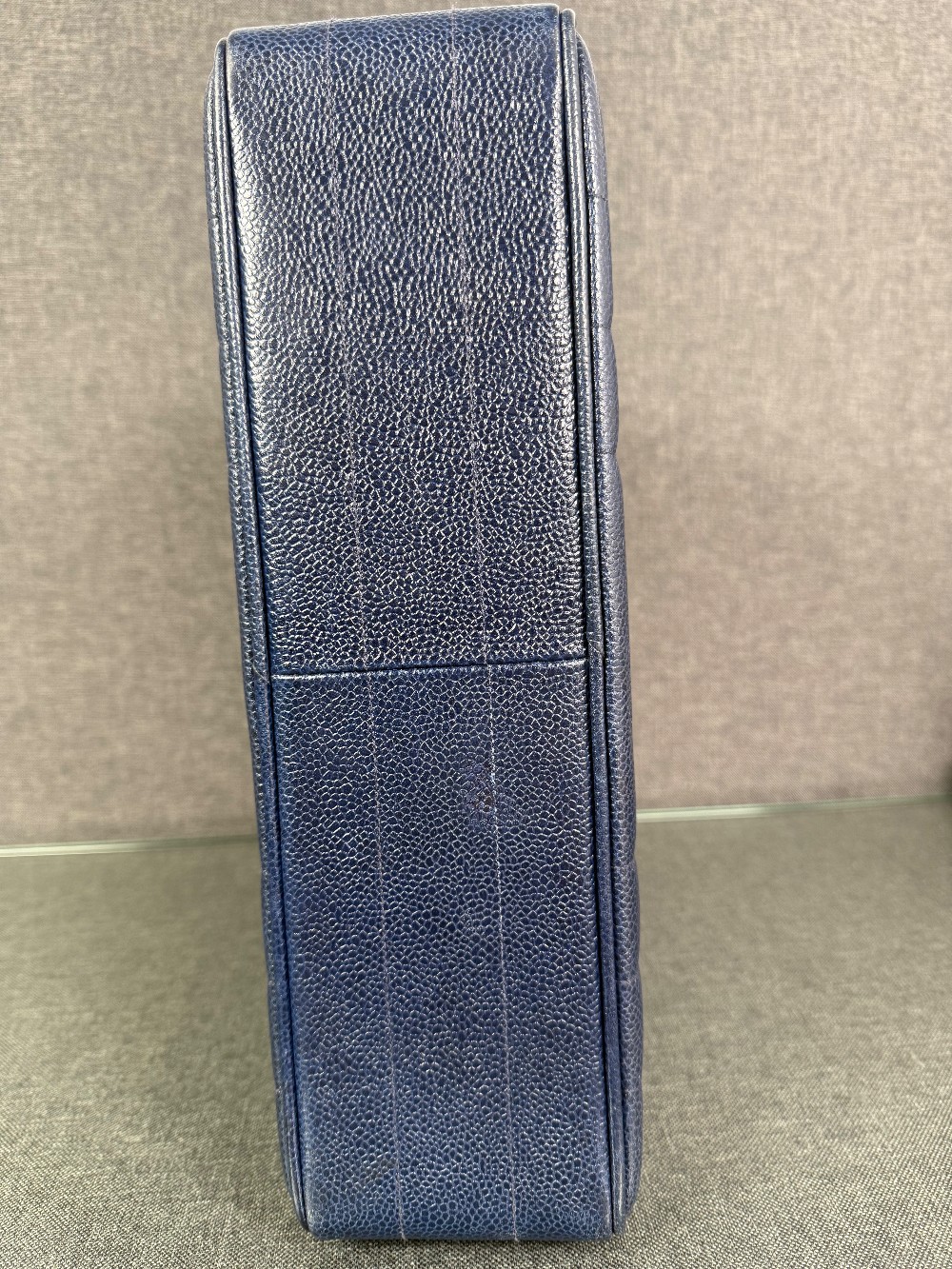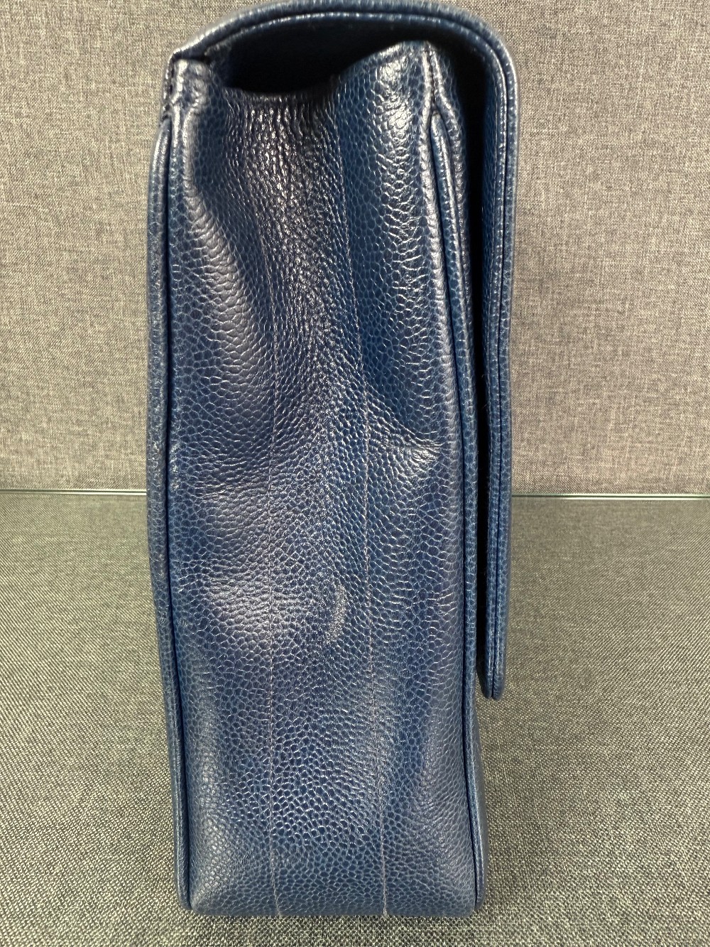 Crafted from luxurious blue caviar leather, featuring a vertically quilted design. The interior is lined with blue lambskin leather.