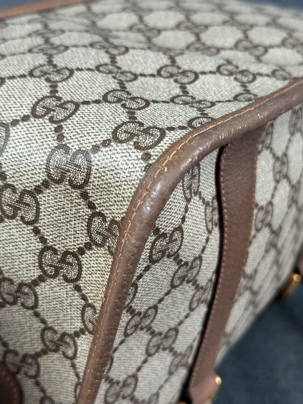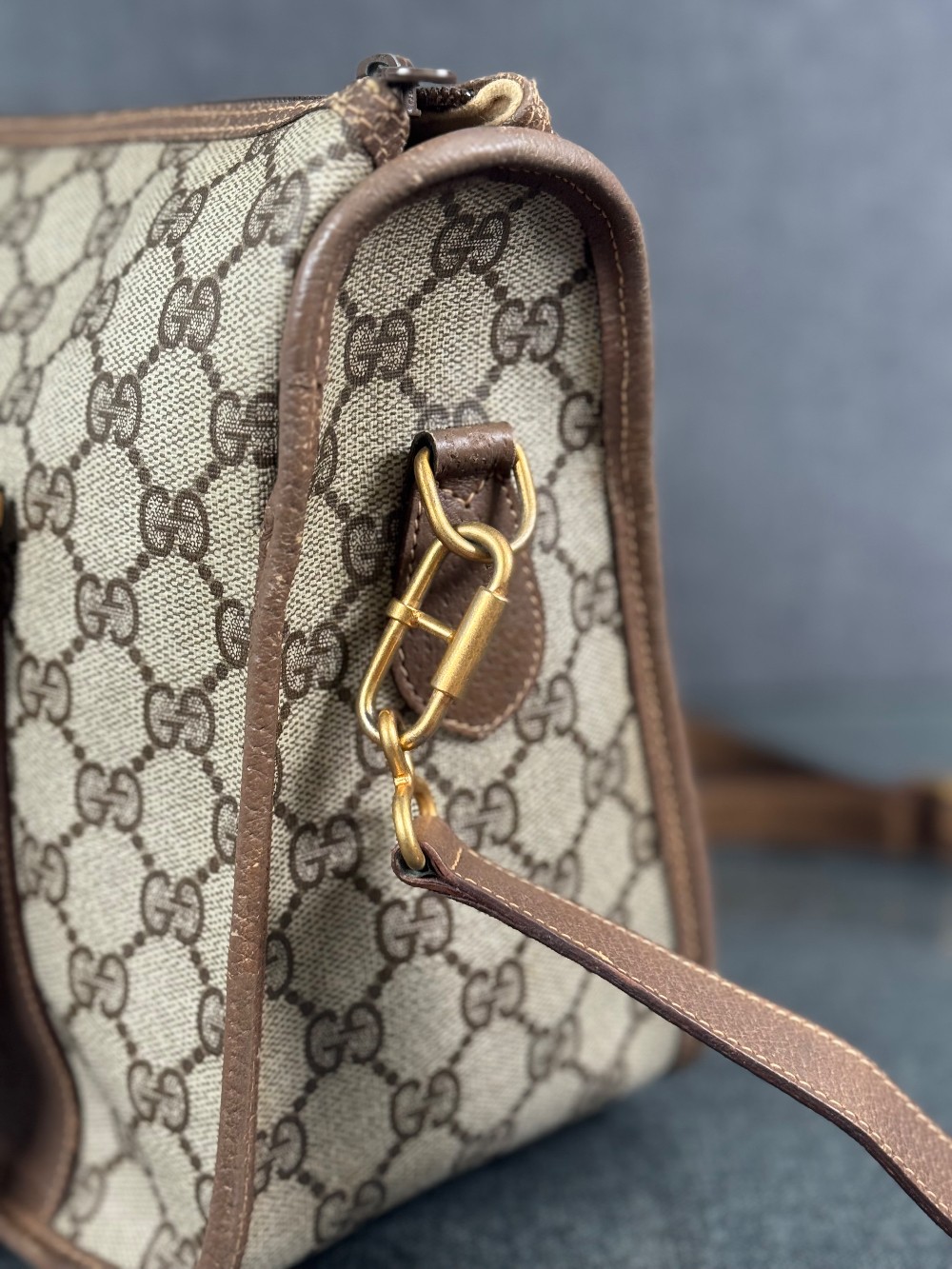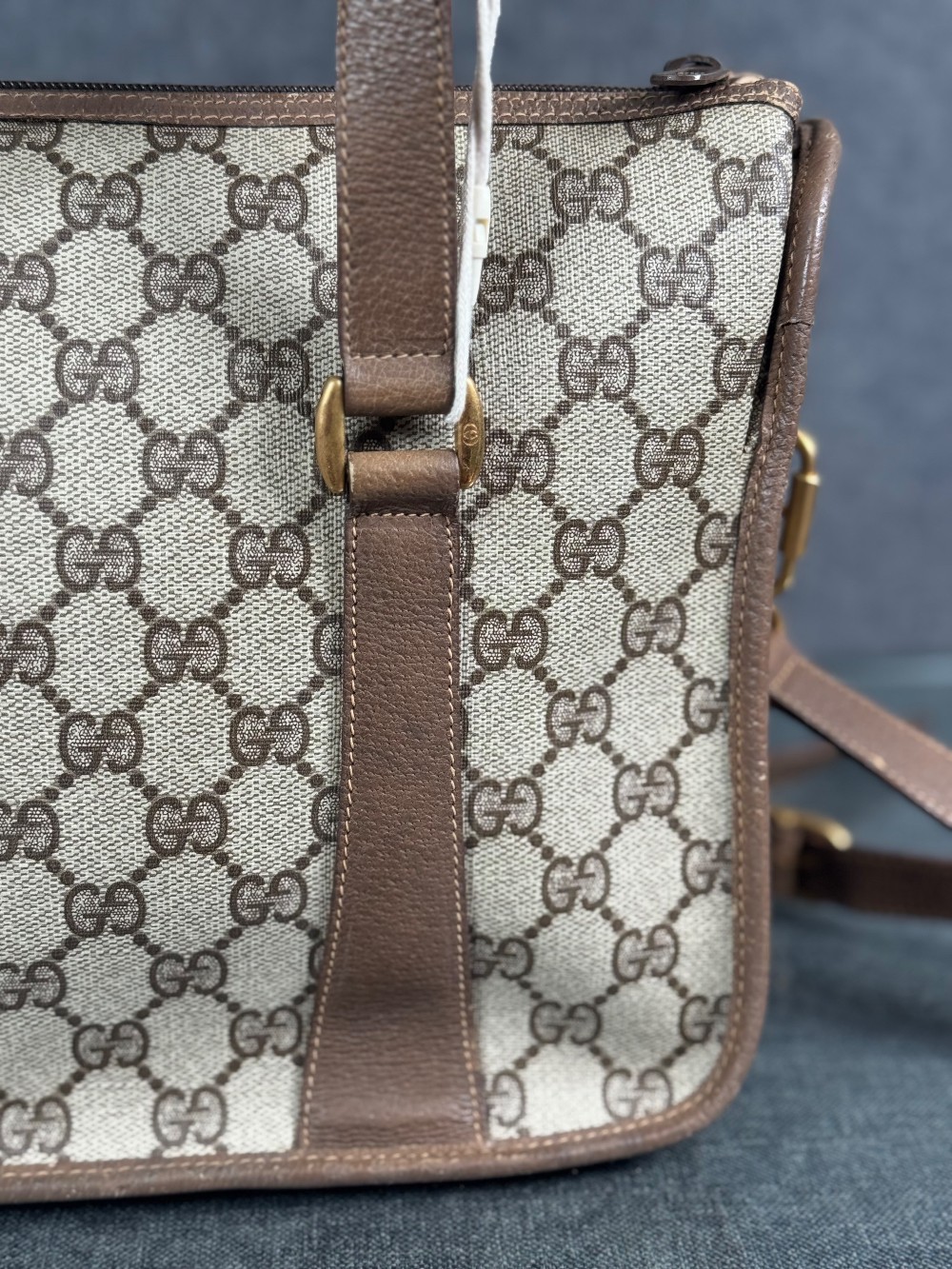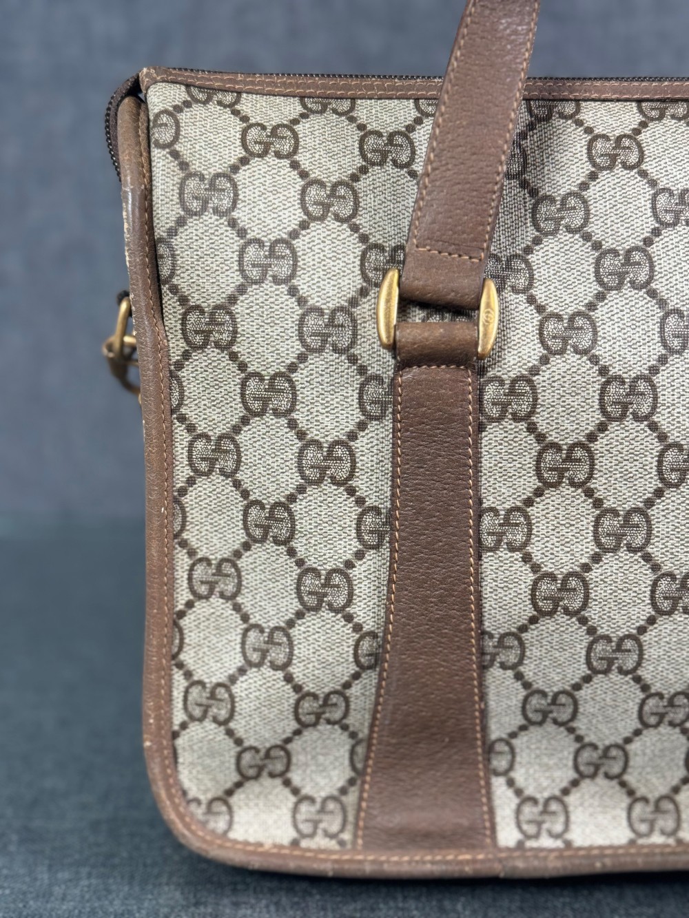 This is an authentic GUCCI Vintage Monogram Bag with a Strap. This stylish tote is finely crafted of classic brown on beige Gucci GG monogram canvas. The bag features brown cowhide leather top handles and trim with polished brass hardware and green and red strip accents. There is also an optional shoulder strap. The top opens with a zipper to a camel suede interior with zipper and patch pockets. This is a marvelous tote that will be ideal for day from Gucci!