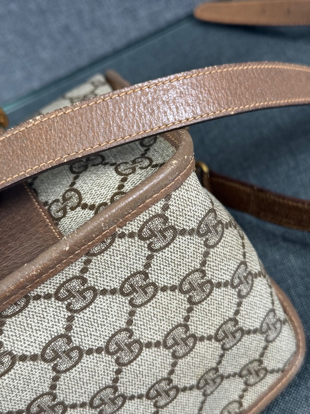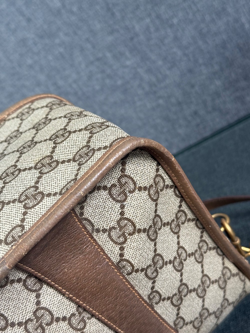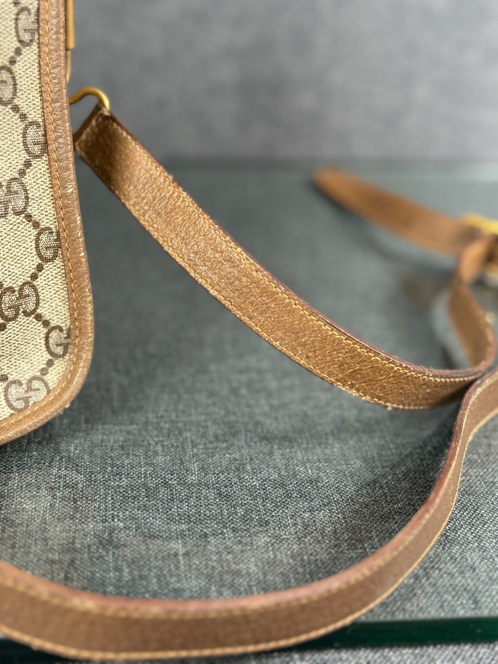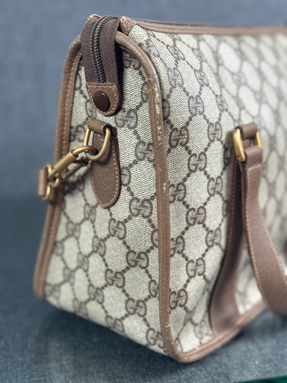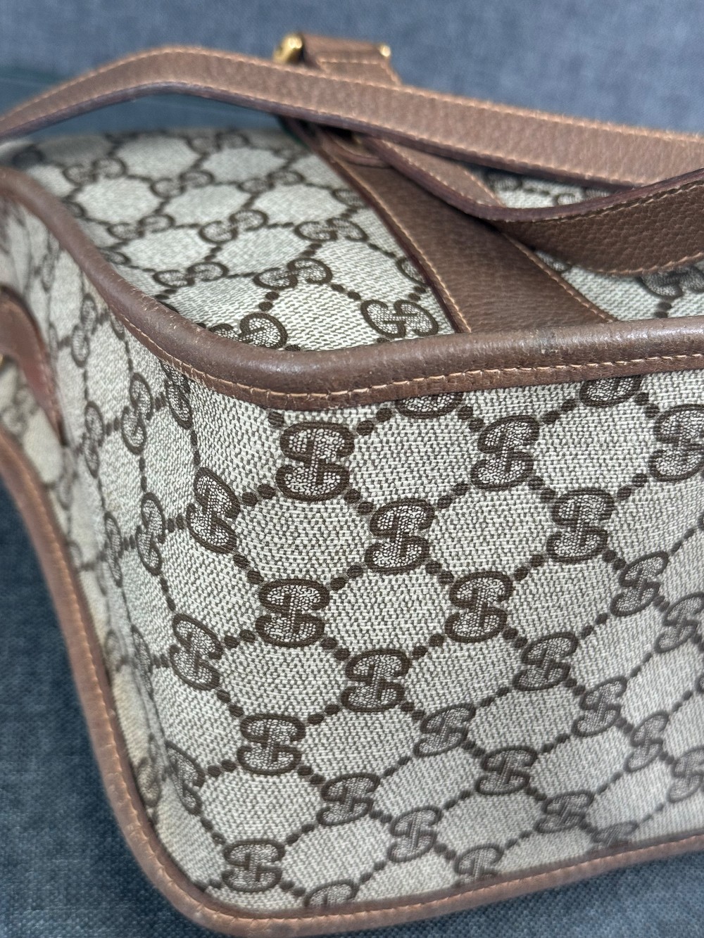 This is an authentic GUCCI Vintage Monogram Bag with a Strap. This stylish tote is finely crafted of classic brown on beige Gucci GG monogram canvas. The bag features brown cowhide leather top handles and trim with polished brass hardware and green and red strip accents. There is also an optional shoulder strap. The top opens with a zipper to a camel suede interior with zipper and patch pockets. This is a marvelous tote that will be ideal for day from Gucci!