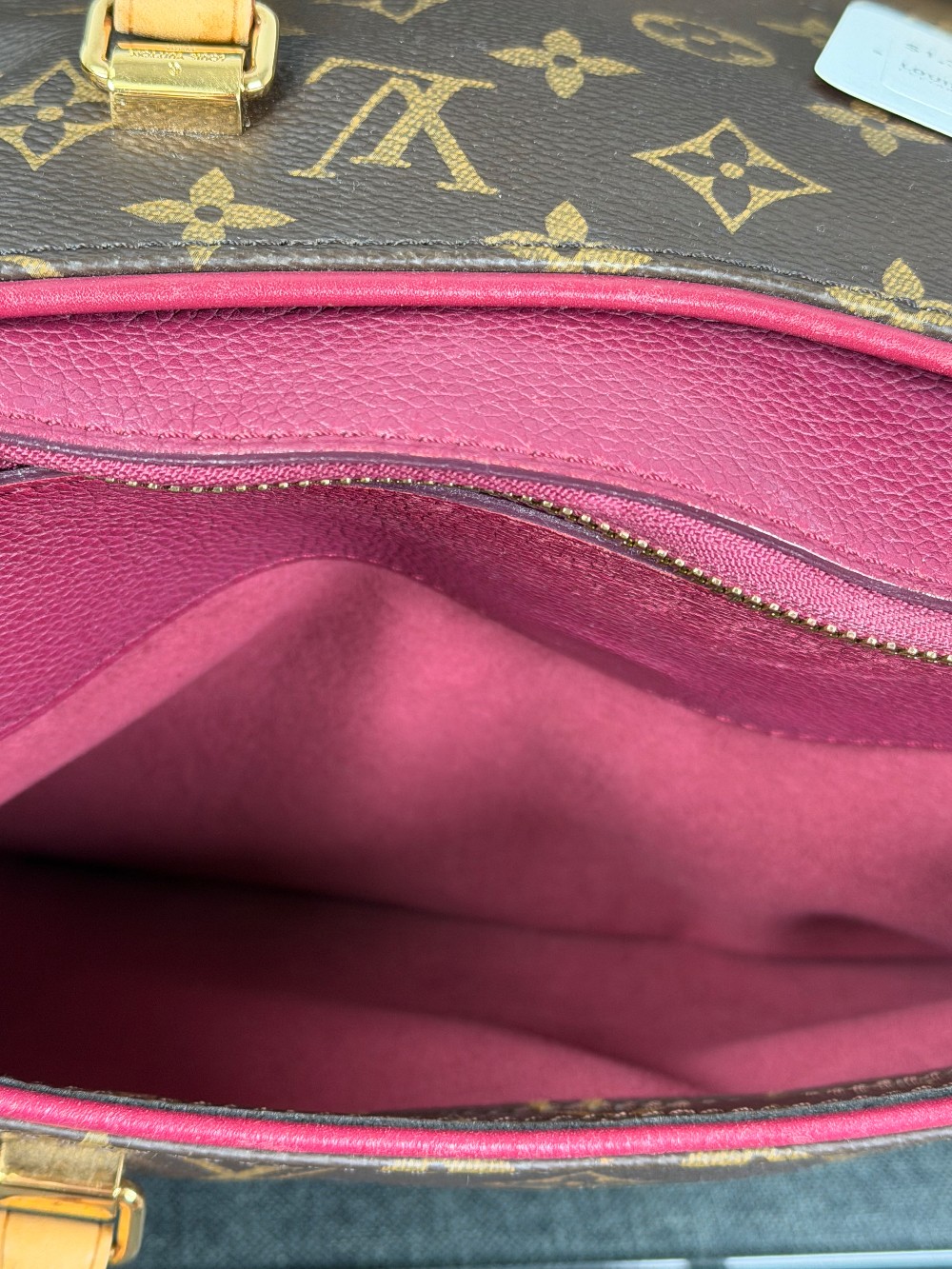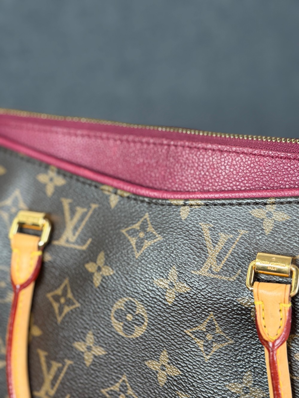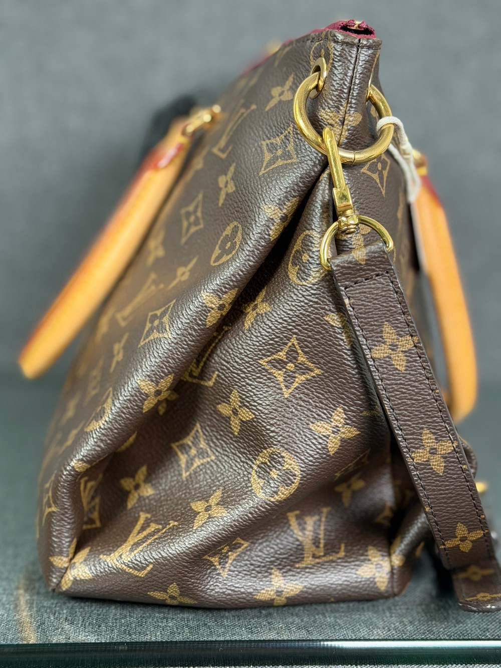 This is an authentic LOUIS VUITTON Monogram Pallas Full MM in Raisin. This petite tote is finely crafted of traditional Louis Vuitton monogram on toile coated canvas, accented by a plum leather peeping top crest. The bag features rolled leather top handles with polished brass links, an optional monogram canvas shoulder strap. The top zipper opens the bag to a plum microfiber interior with a pocket.