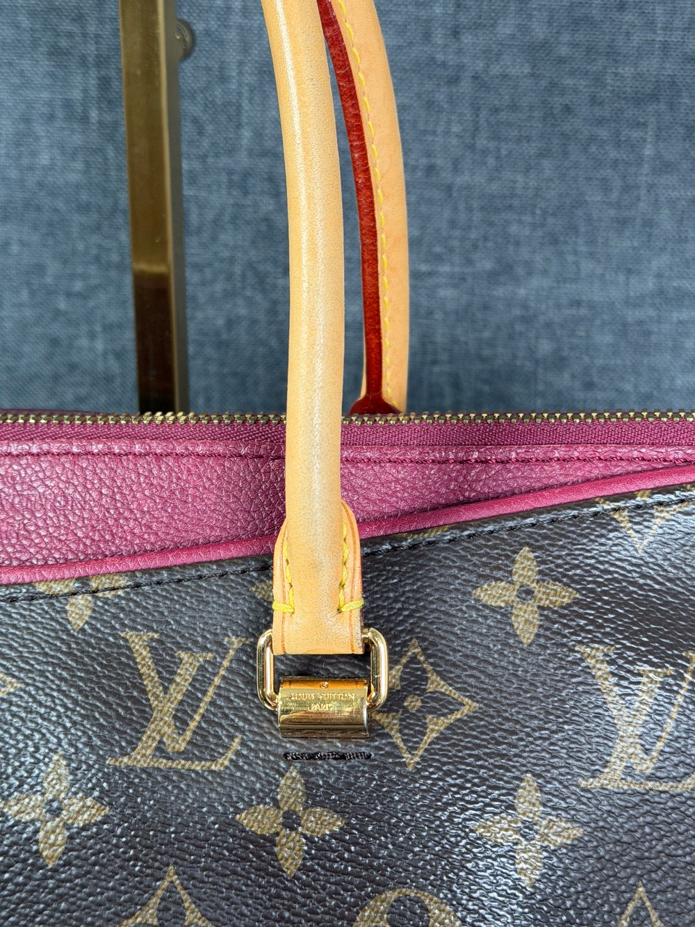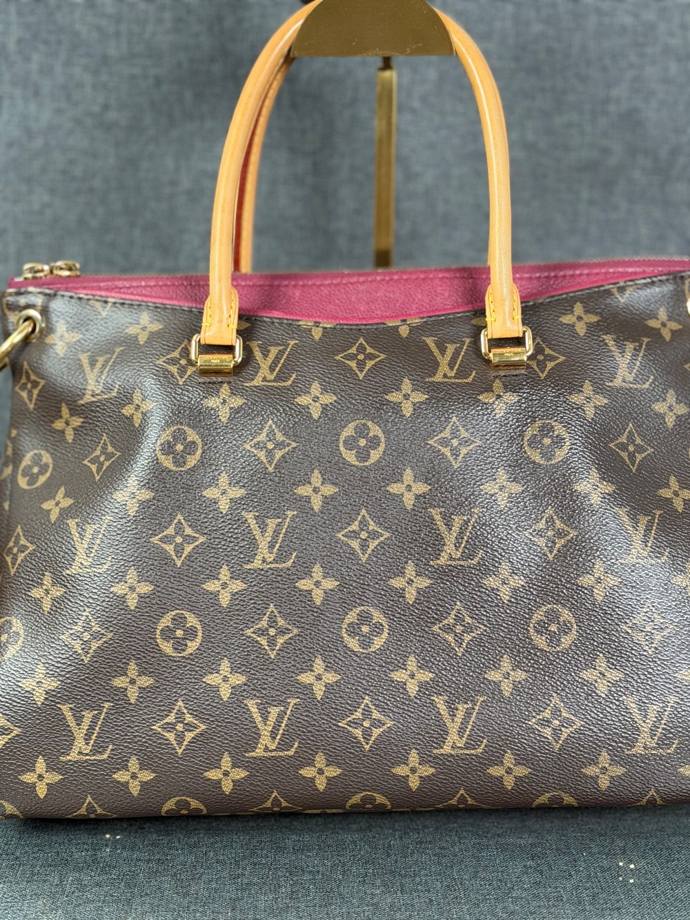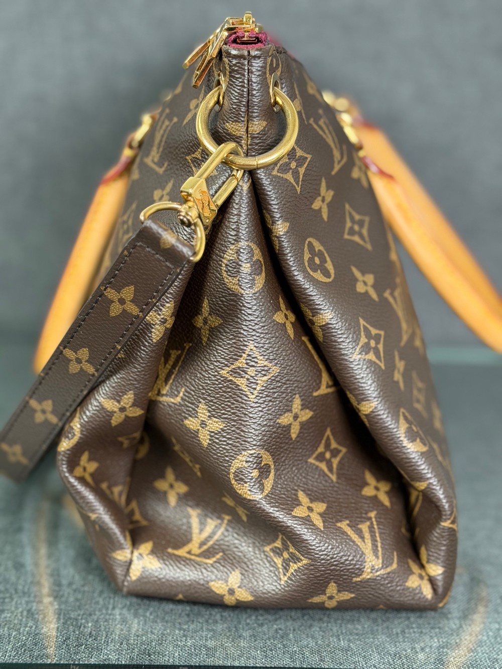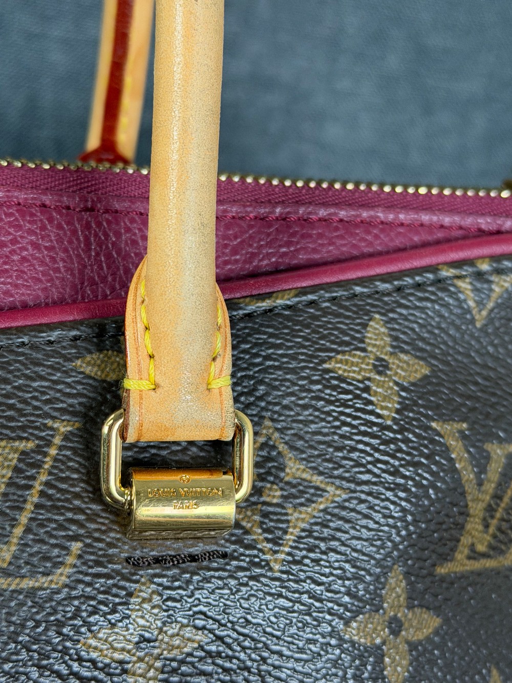 This is an authentic LOUIS VUITTON Monogram Pallas Full MM in Raisin. This petite tote is finely crafted of traditional Louis Vuitton monogram on toile coated canvas, accented by a plum leather peeping top crest. The bag features rolled leather top handles with polished brass links, an optional monogram canvas shoulder strap. The top zipper opens the bag to a plum microfiber interior with a pocket.