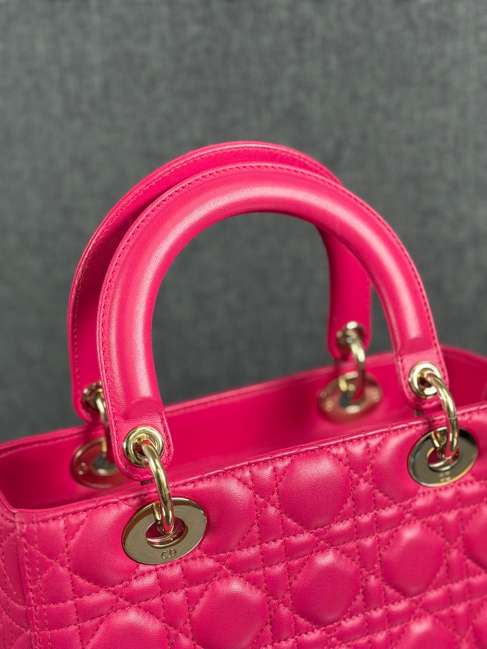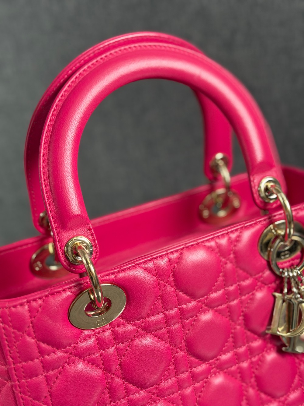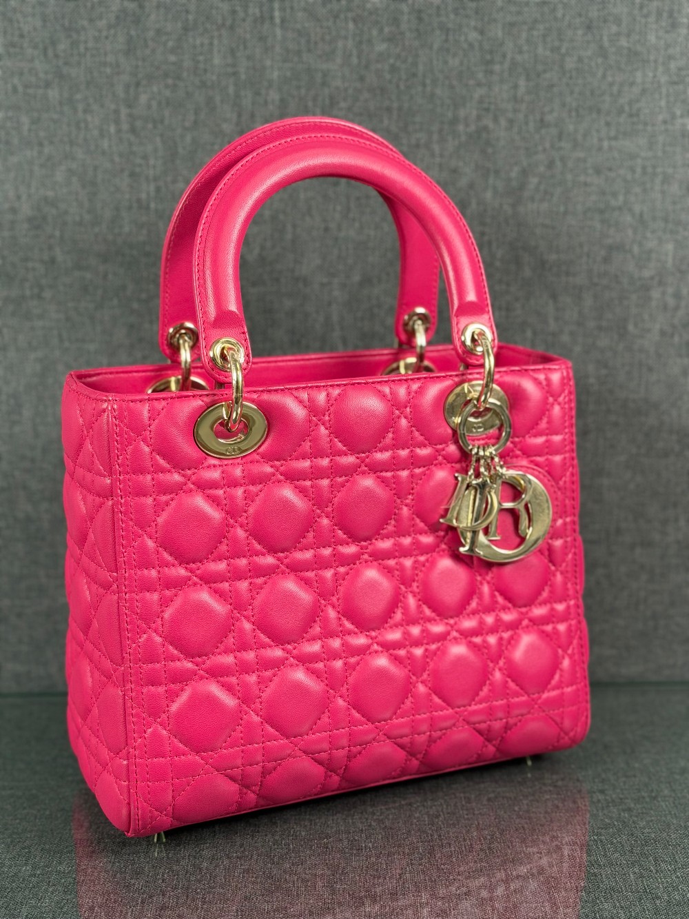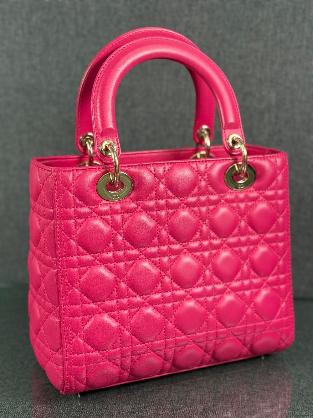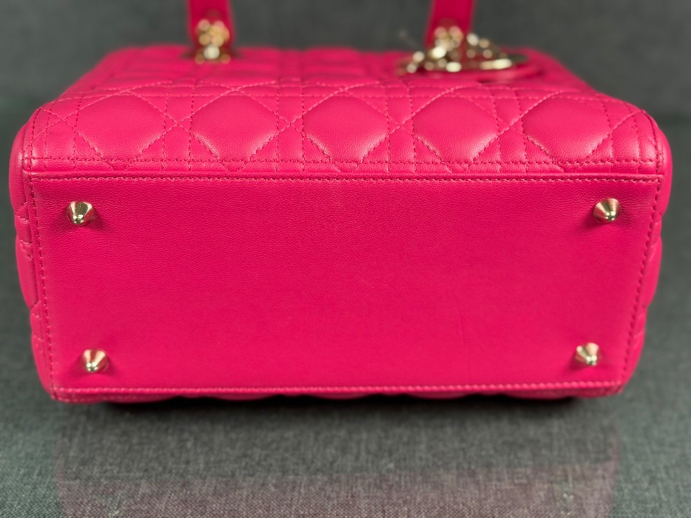 This is an authentic CHRISTIAN DIOR Lambskin Cannage Medium Lady Dior in Fuchsia. This stylish handbag is crafted of cannage-quilted leather in dark pink. It features leather top handles, an optional shoulder strap with polished gold hardware, and a top zipper that opens to a gray Dior logo jacquard interior with a zipper pocket.