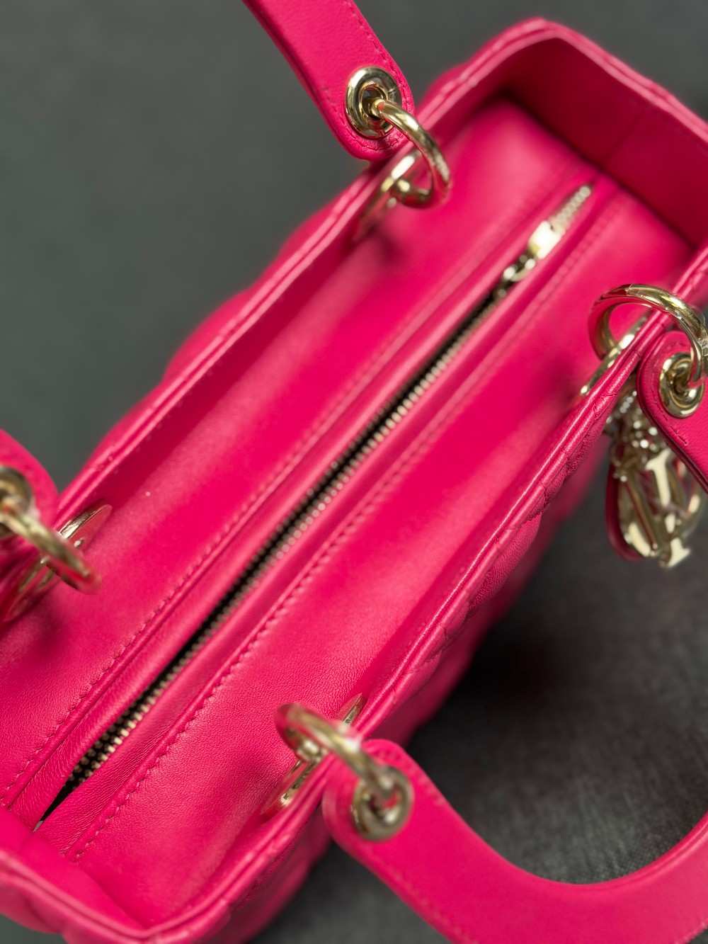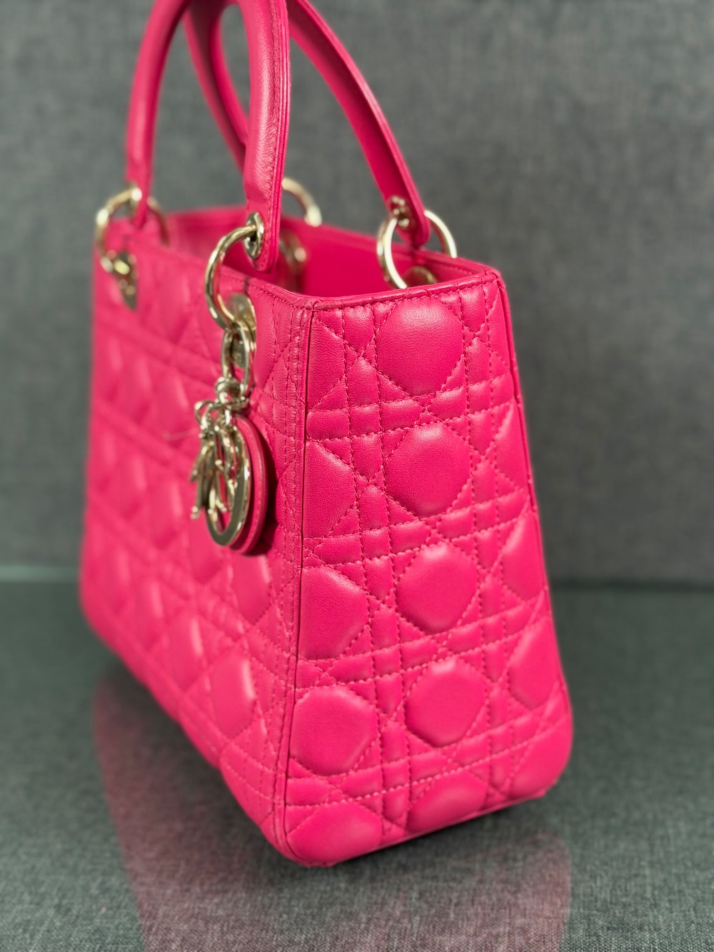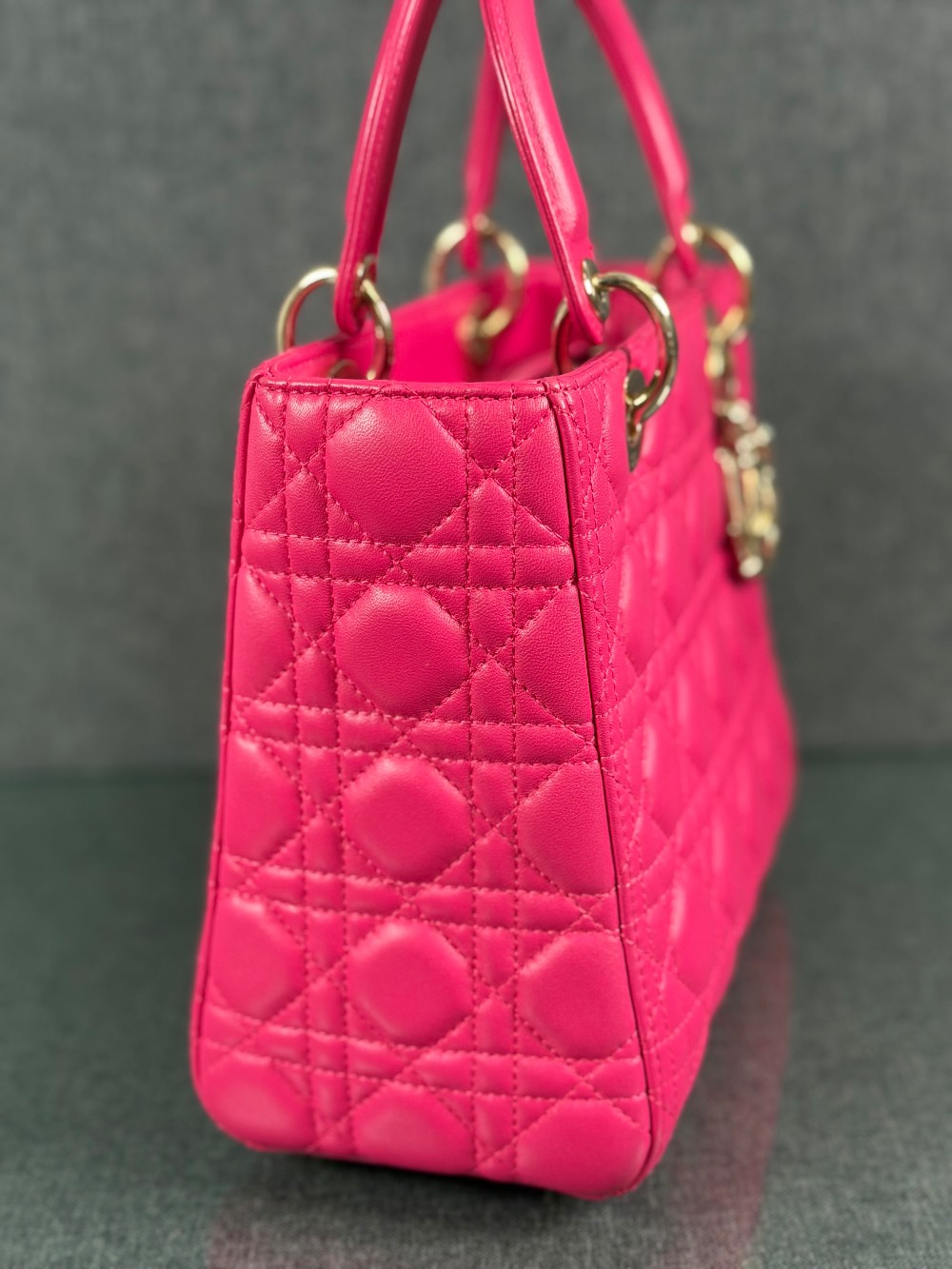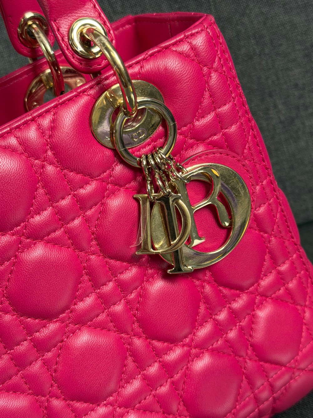 This is an authentic CHRISTIAN DIOR Lambskin Cannage Medium Lady Dior in Fuchsia. This stylish handbag is crafted of cannage-quilted leather in dark pink. It features leather top handles, an optional shoulder strap with polished gold hardware, and a top zipper that opens to a gray Dior logo jacquard interior with a zipper pocket.