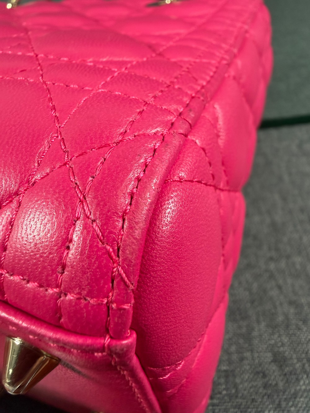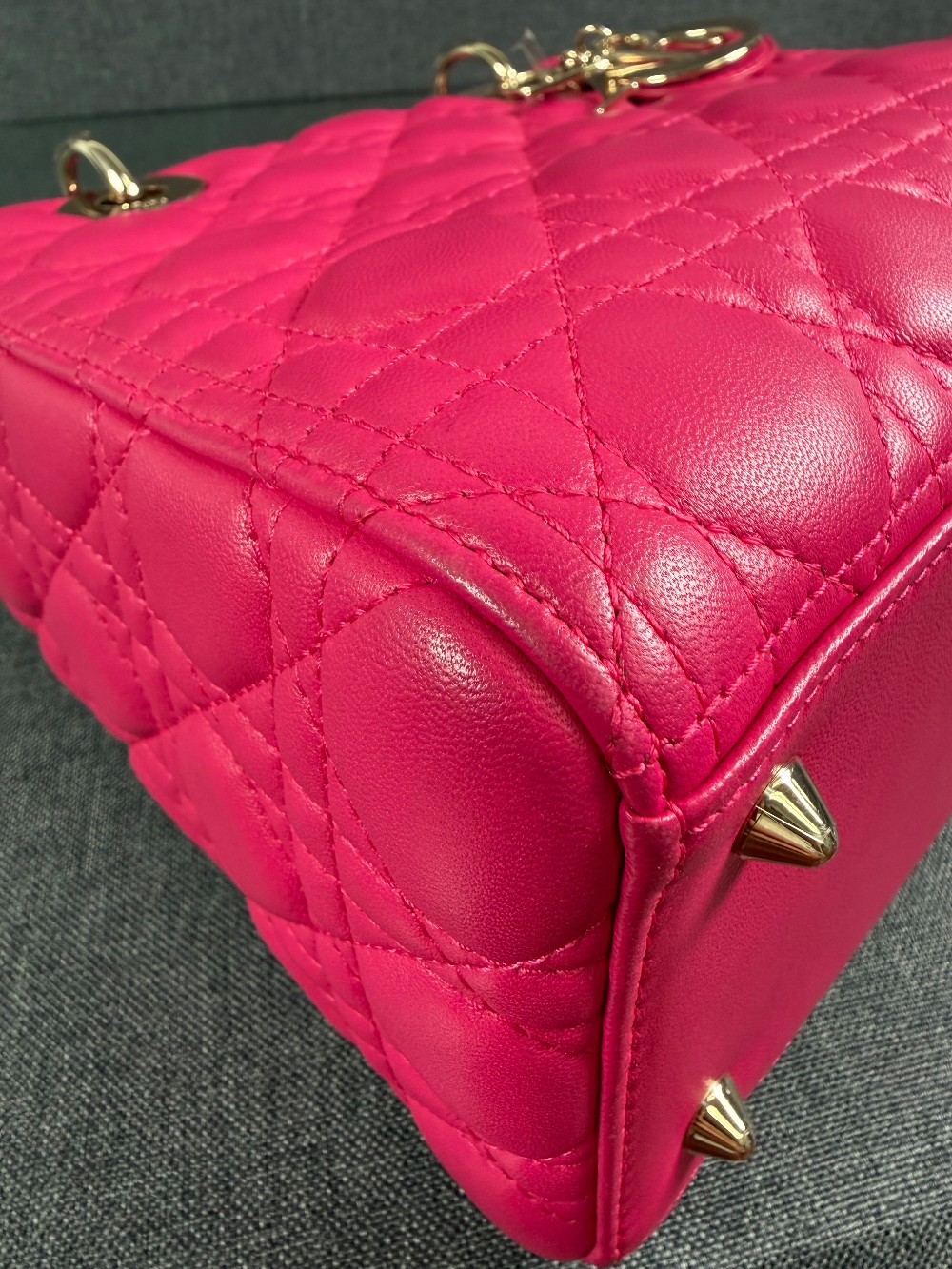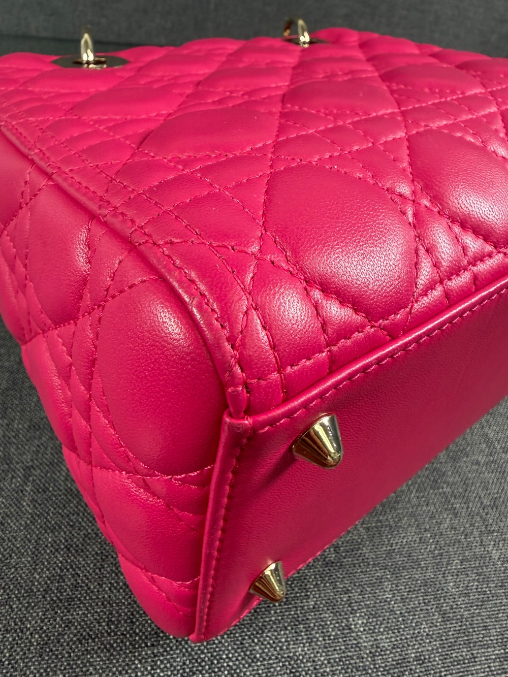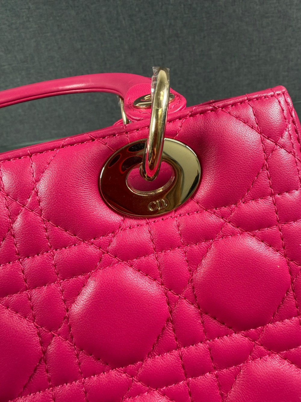 This is an authentic CHRISTIAN DIOR Lambskin Cannage Medium Lady Dior in Fuchsia. This stylish handbag is crafted of cannage-quilted leather in dark pink. It features leather top handles, an optional shoulder strap with polished gold hardware, and a top zipper that opens to a gray Dior logo jacquard interior with a zipper pocket.
