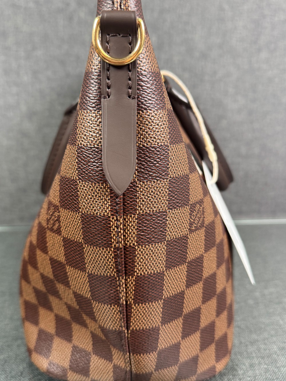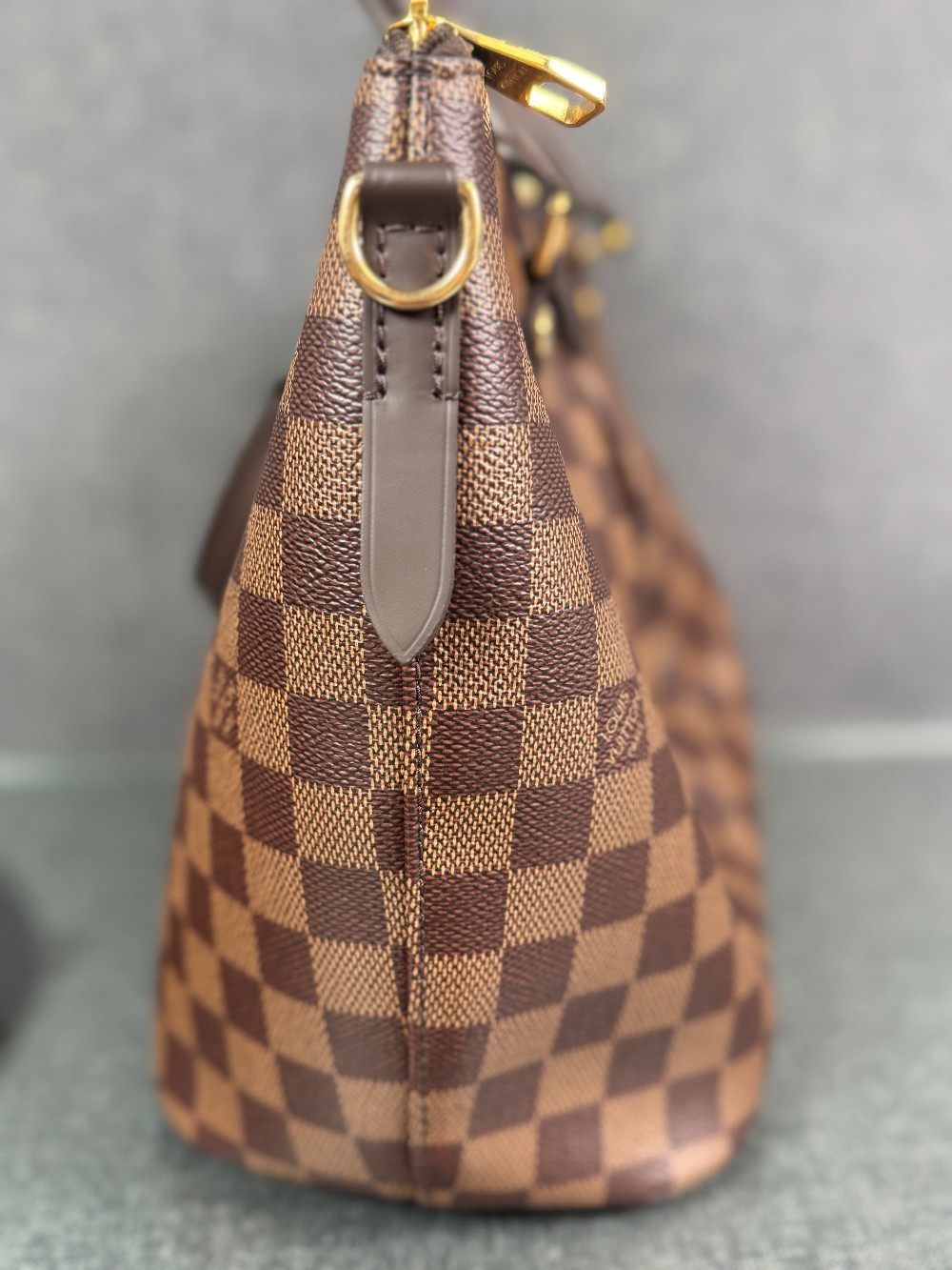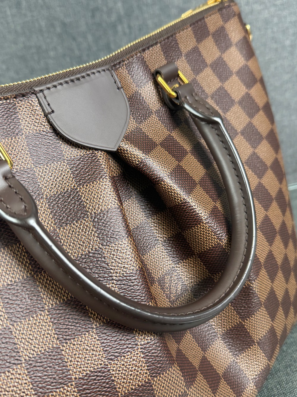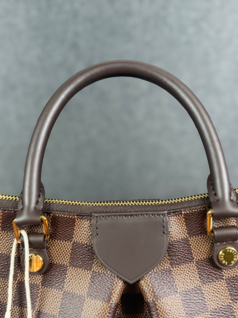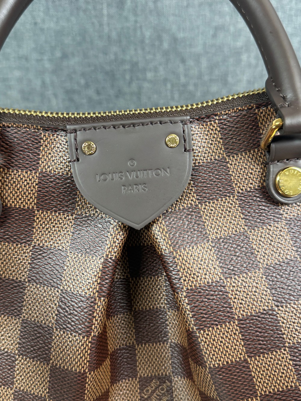 Damier Ebene Siena MM. This stylish tote is crafted of Louis Vuitton checkerboard on pleated, coated canvas in brown. The bag features chocolate brown leather trim, brown leather rolled top handles, an optional leather shoulder strap, and polished gold hardware. The top zipper opens to a red fabric interior with patch pockets.