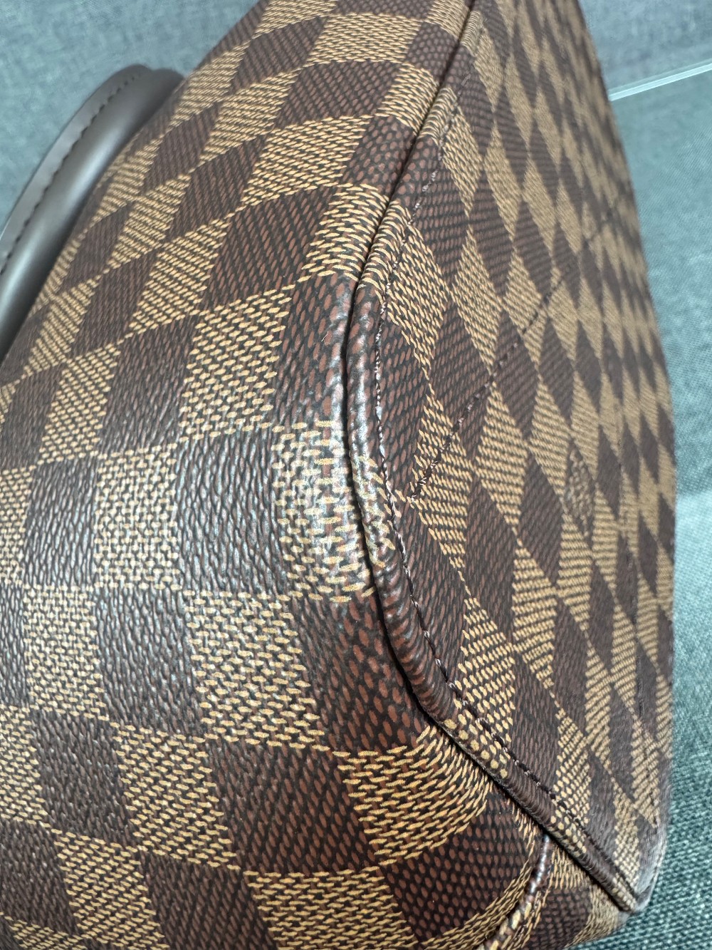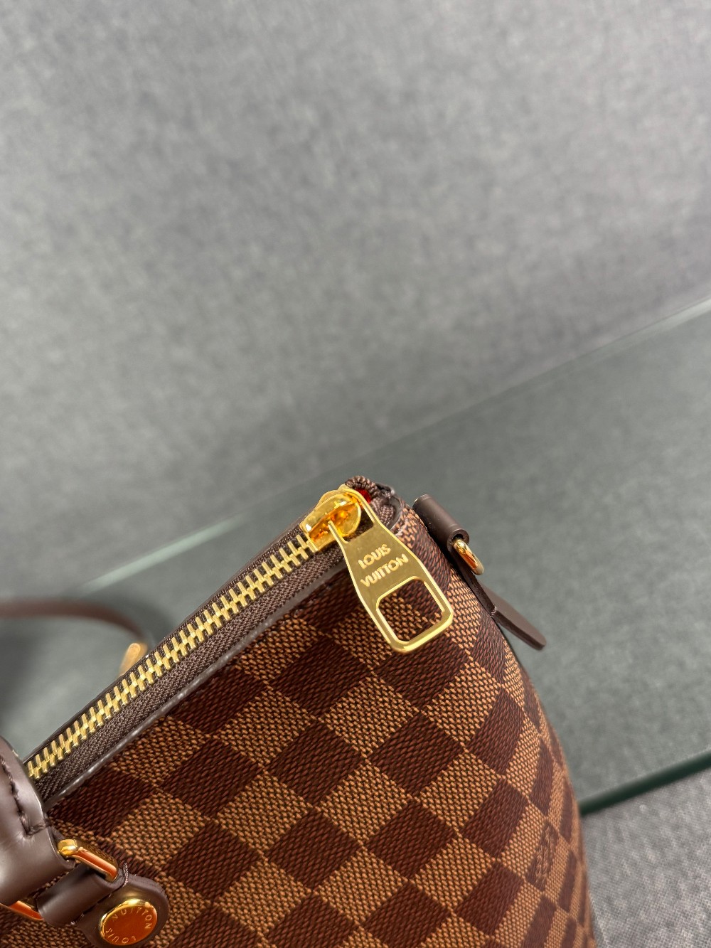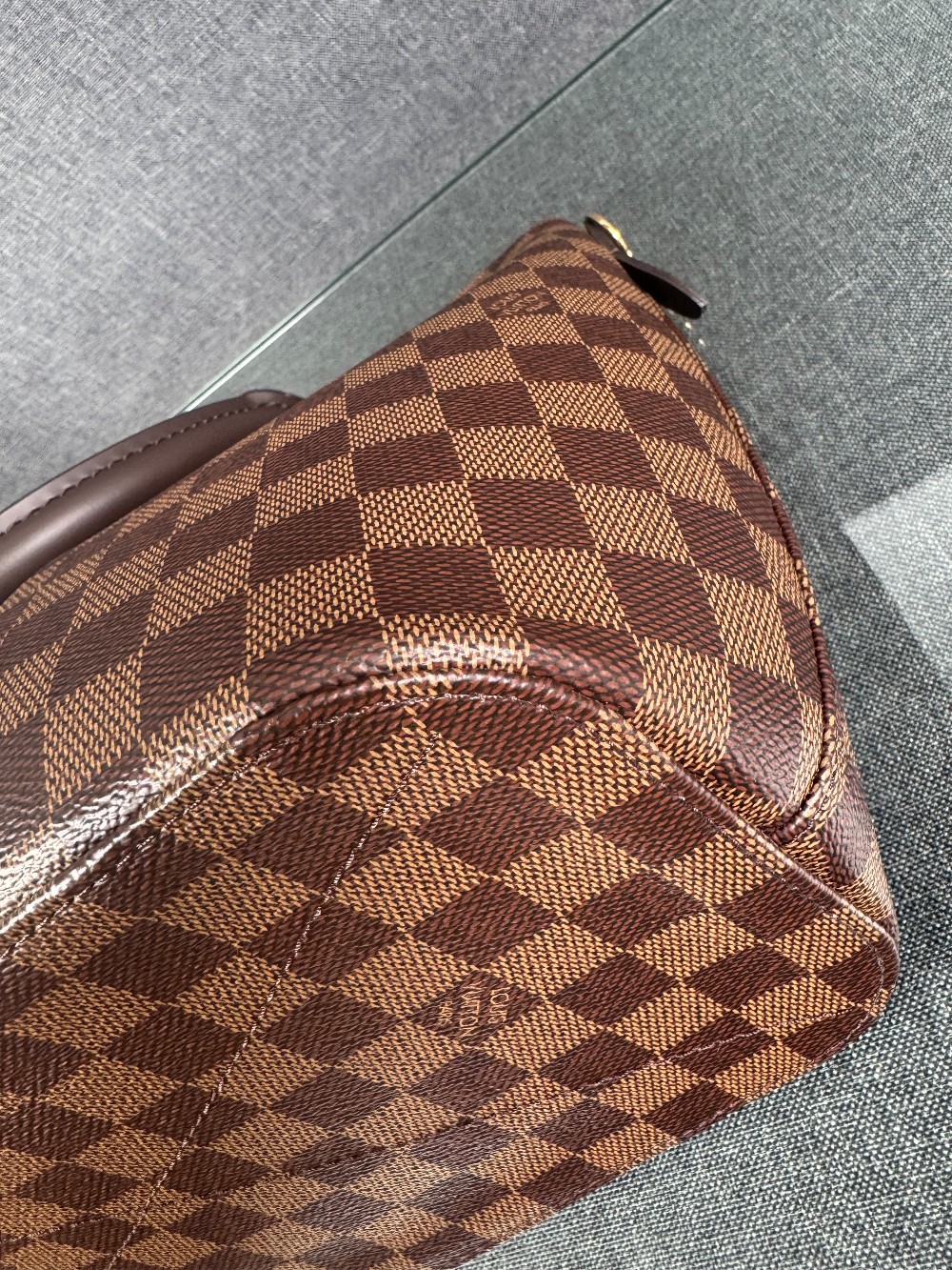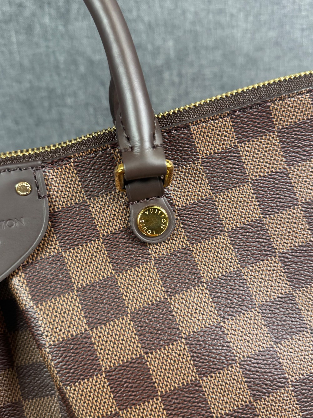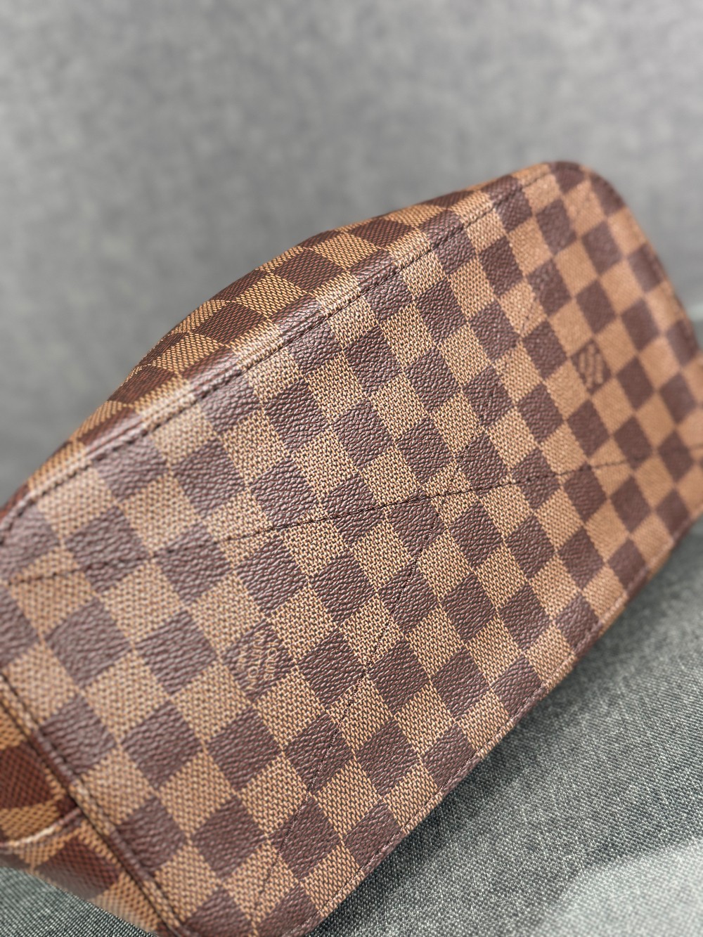 Damier Ebene Siena MM. This stylish tote is crafted of Louis Vuitton checkerboard on pleated, coated canvas in brown. The bag features chocolate brown leather trim, brown leather rolled top handles, an optional leather shoulder strap, and polished gold hardware. The top zipper opens to a red fabric interior with patch pockets.