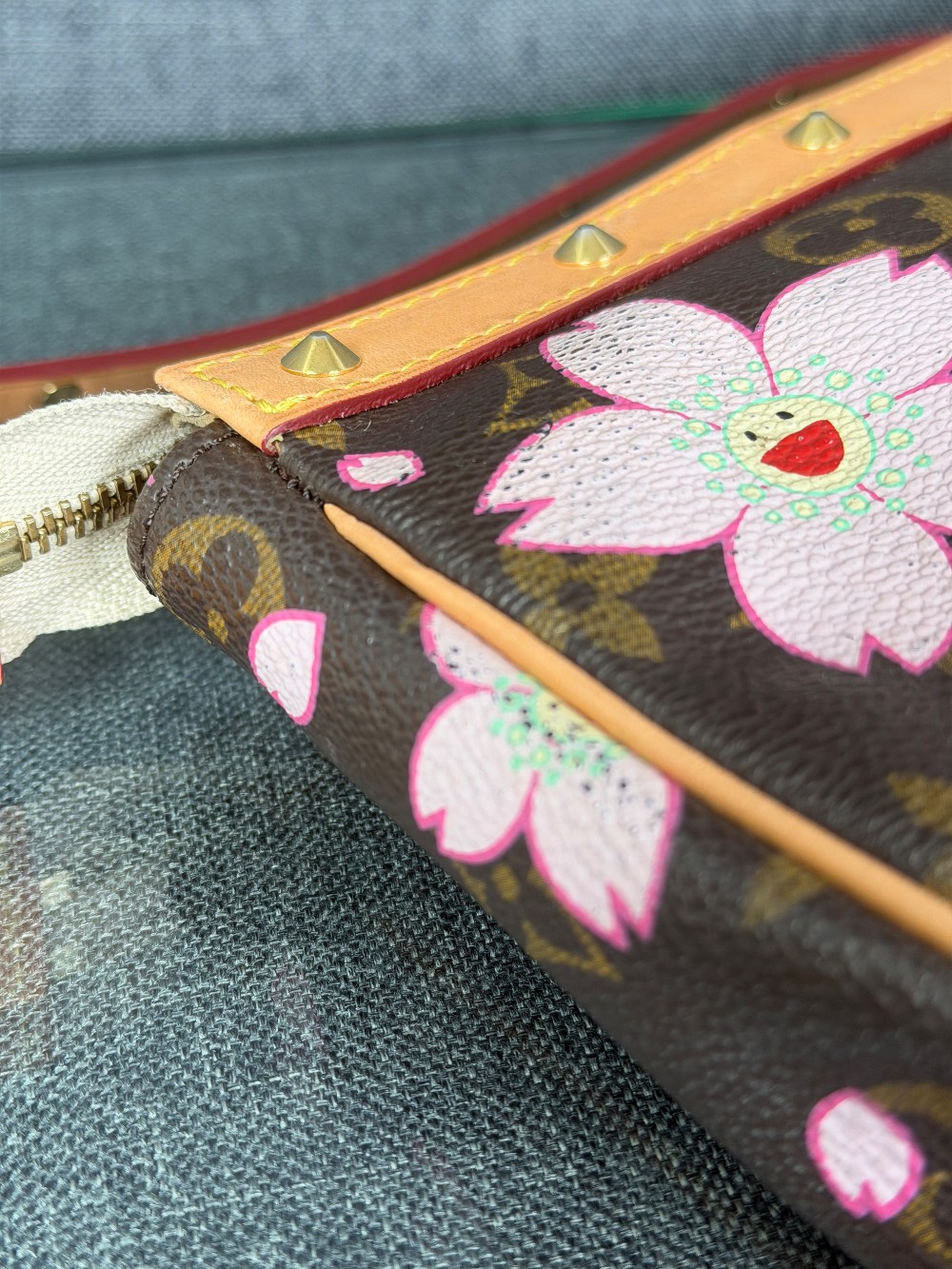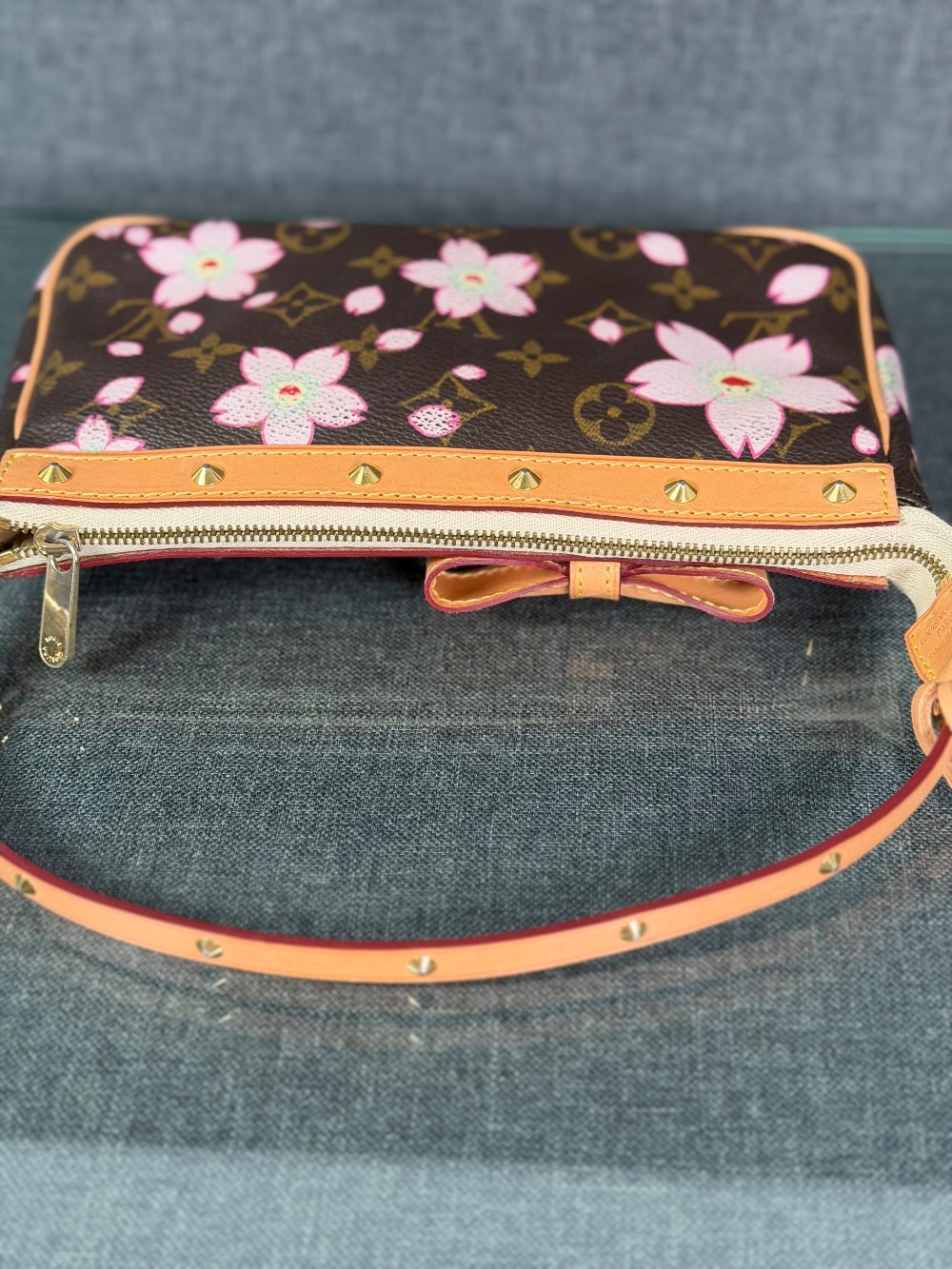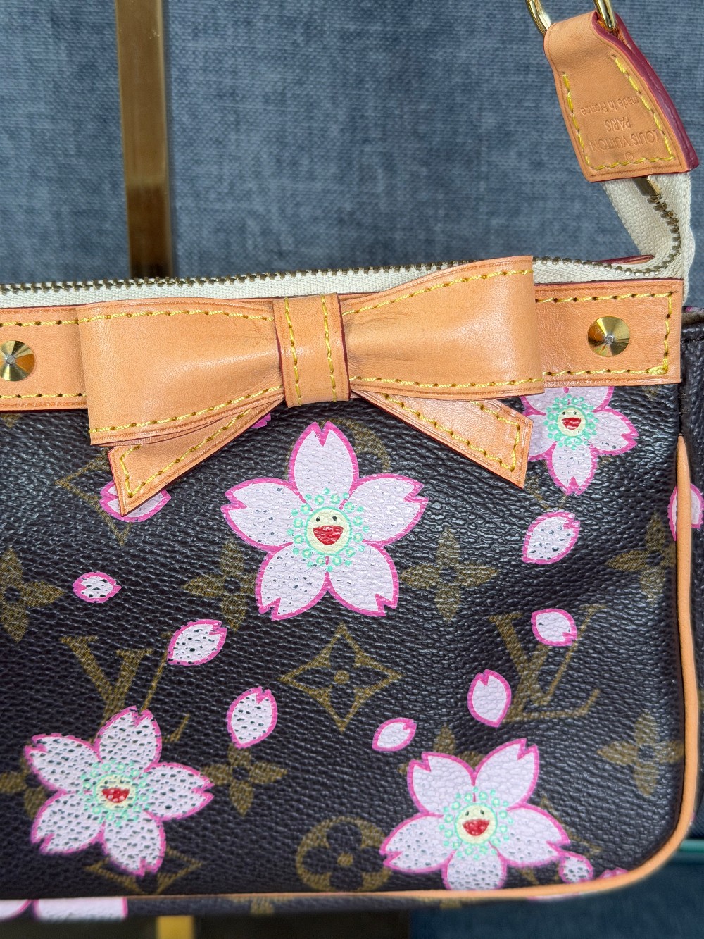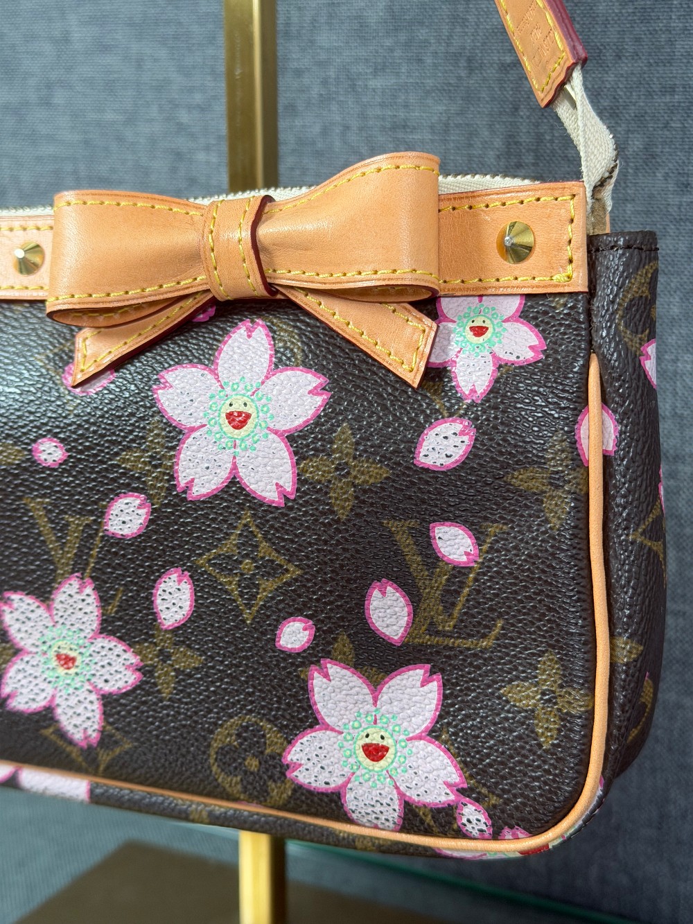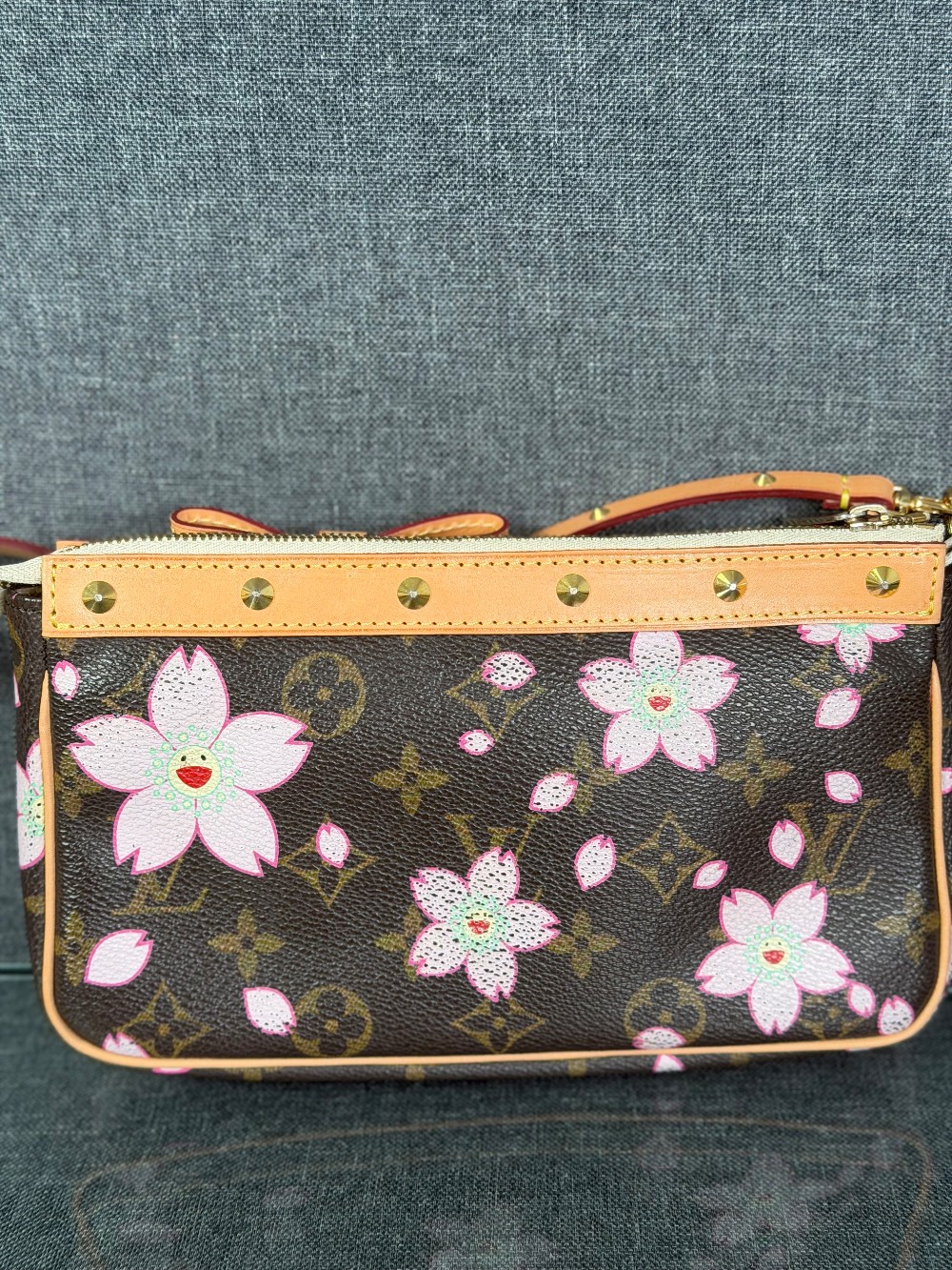 This is an authentic LOUIS VUITTON LV X TM Monogram Cherry Blossom Pochette Accessories in Sakura Brown. In collaboration with artist Takashi Murakami, this chic pochette is crafted of iconic Louis Vuitton monogram-coated canvas with cherry blossom motifs. The pouch features vachetta cowhide leather trim lined, a bow and a vachetta strap. The top zipper opens to a beige microfiber interior.